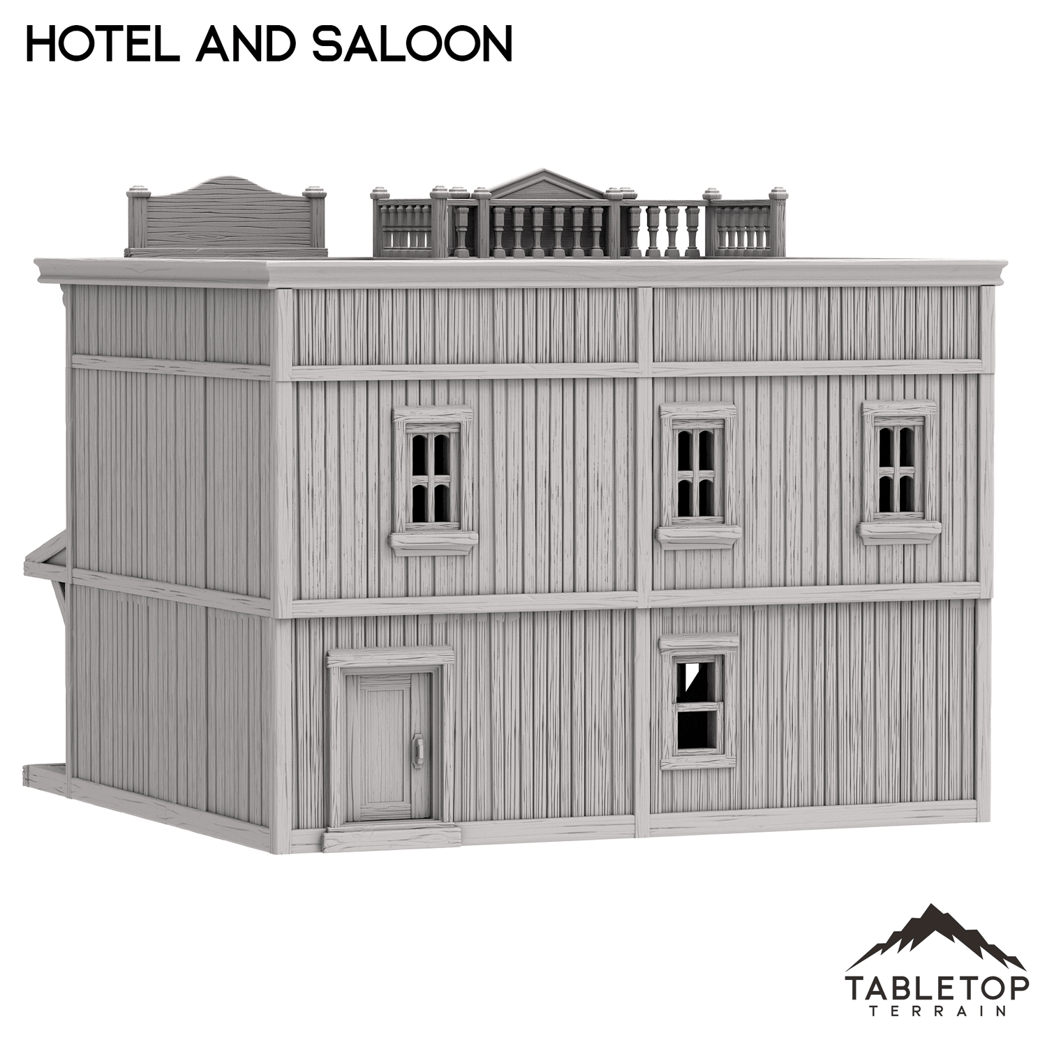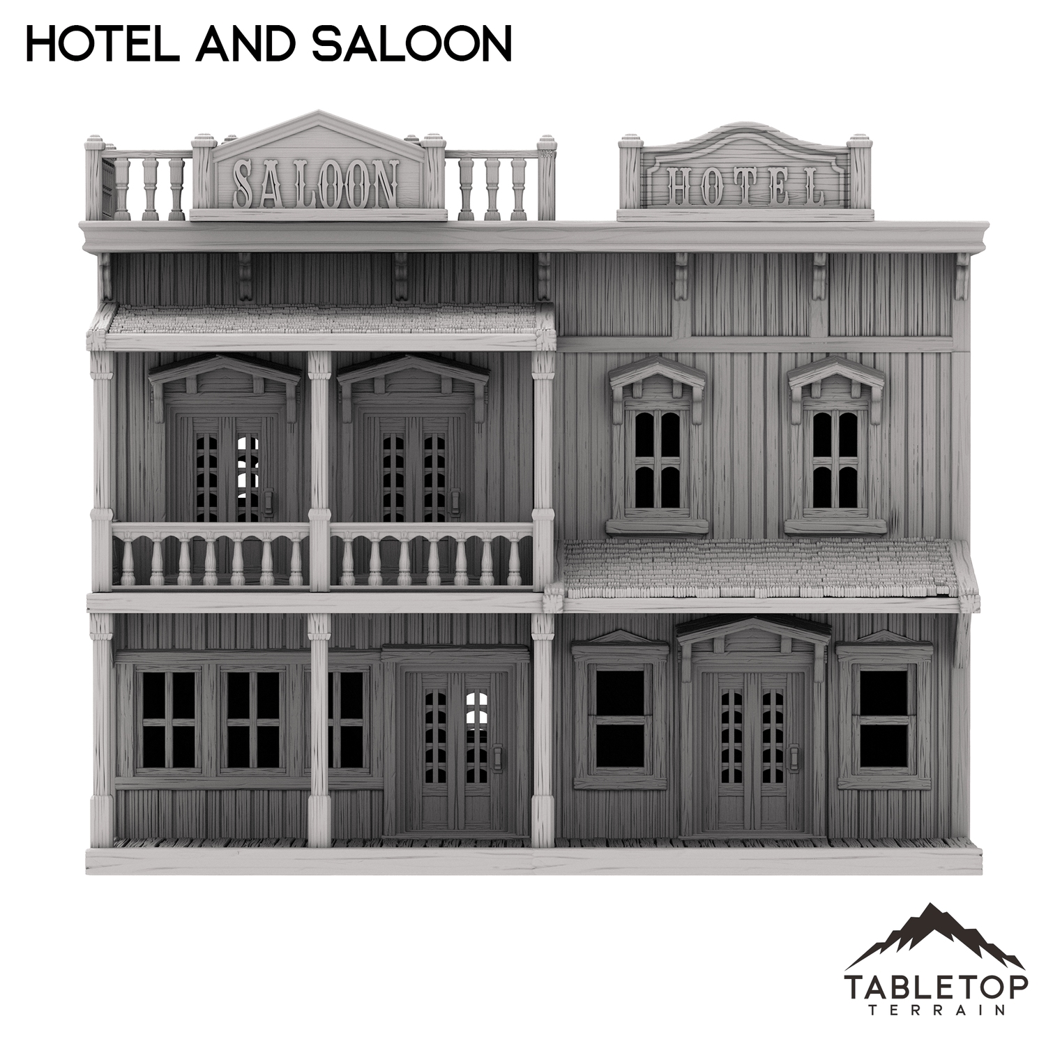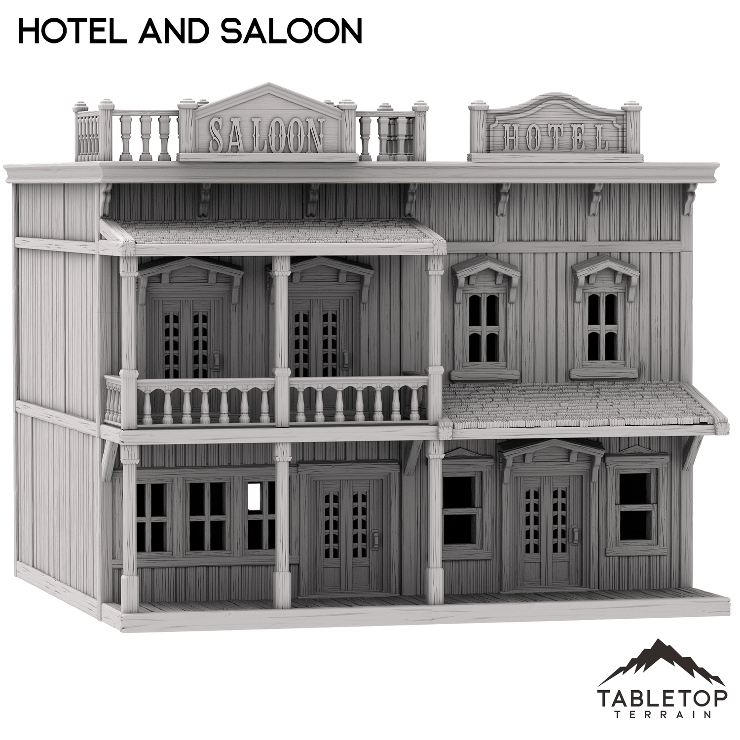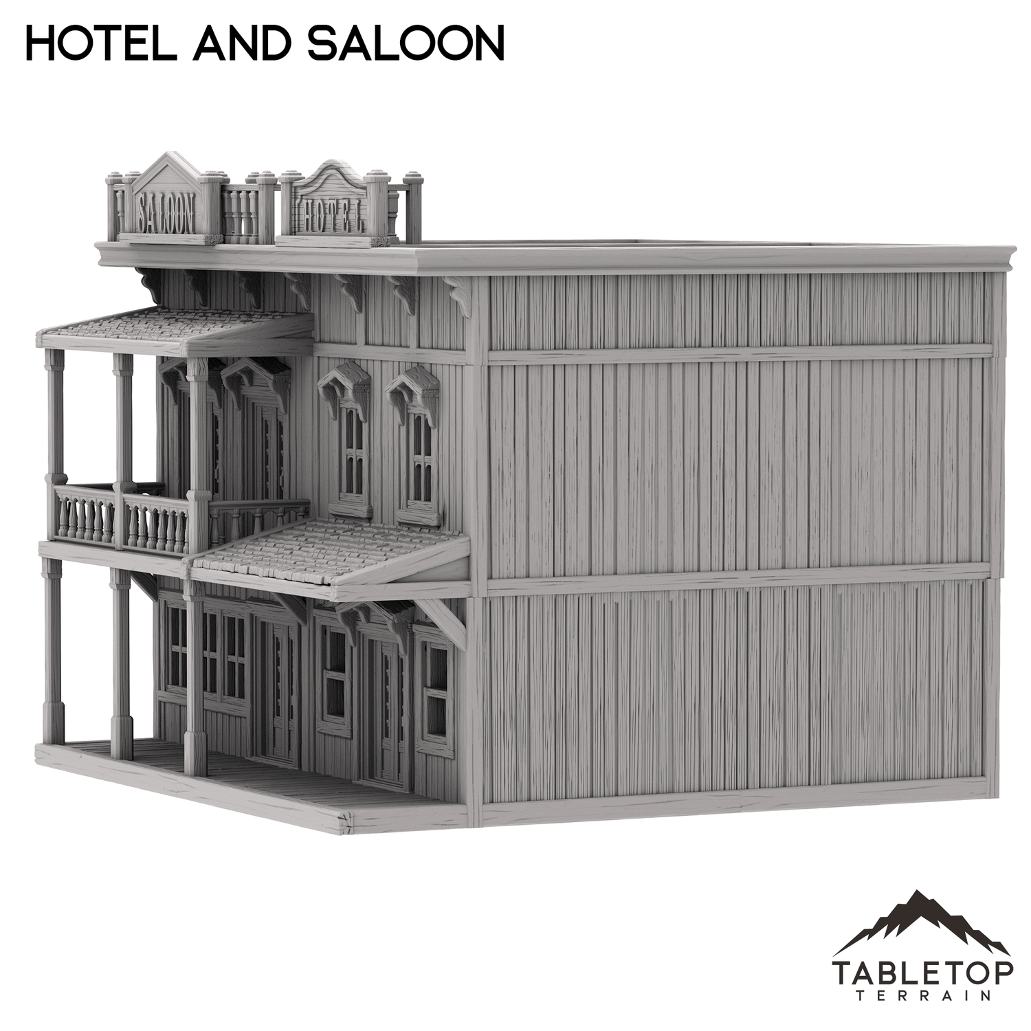 The Hotel and Saloon is a very large Old West themed building. Both buildings are combined together into one large structure. The roof is removable for interior miniature placement on both the upper and lower levels.