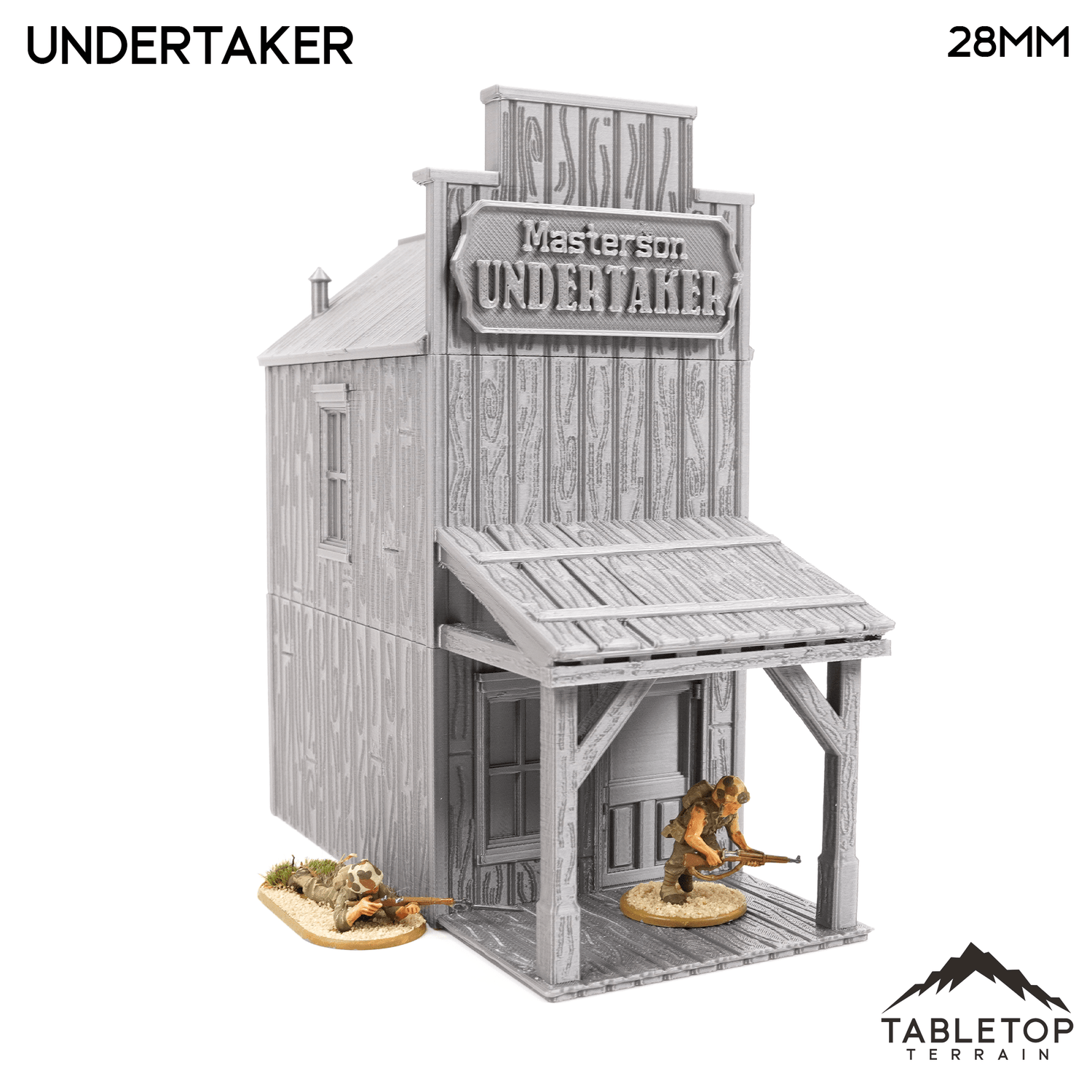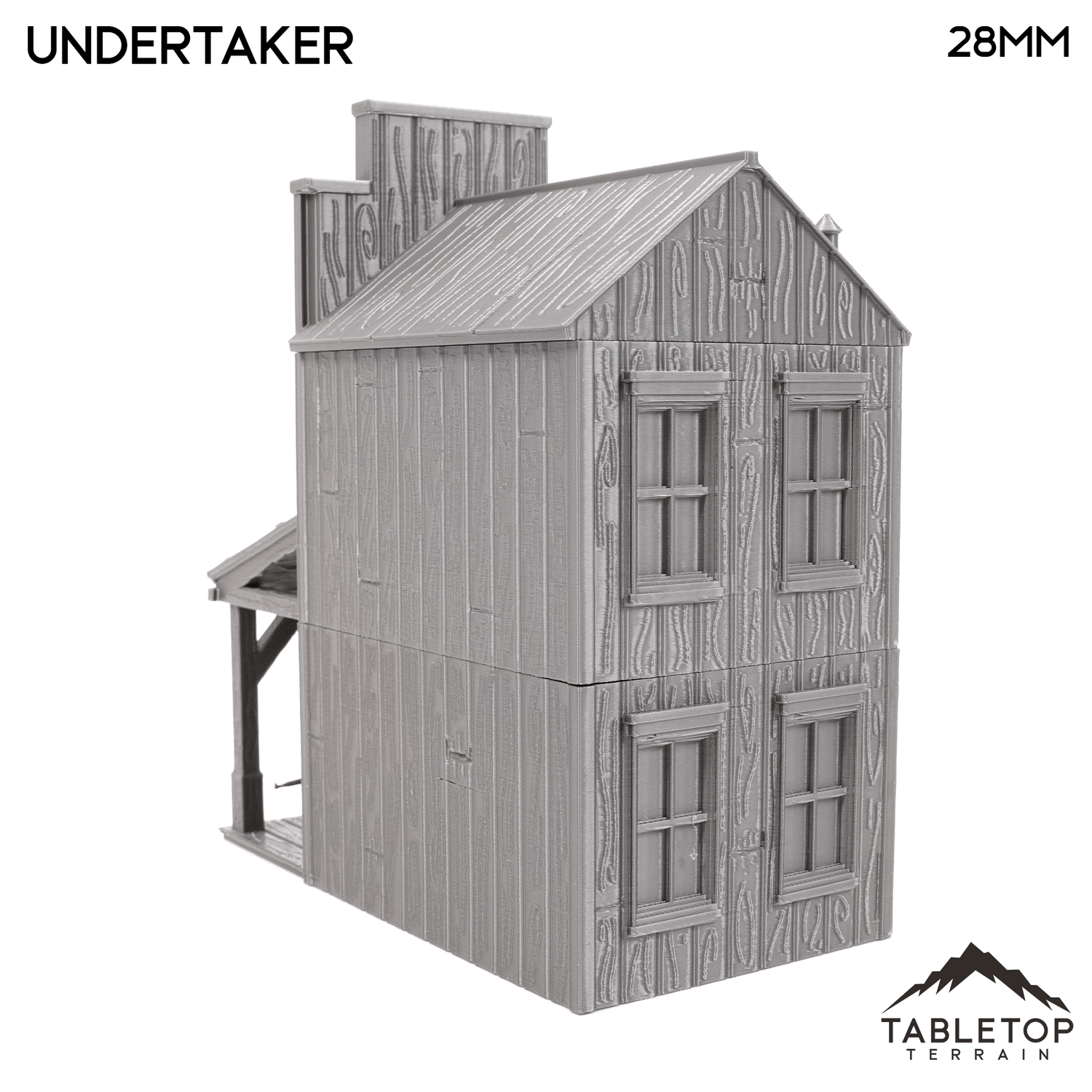 The Undertaker is a fantastic addition for your Western themed tabletop. It would work great for Wild West: Exodus or other Western games. The Undertaker comes with or without a floor. If you order it without a floor, the inside will be hollow and minis cannot be placed inside except for ground level. It is 3D printed in 40mm, 32mm, and 28mm scale in .2mm resolution.