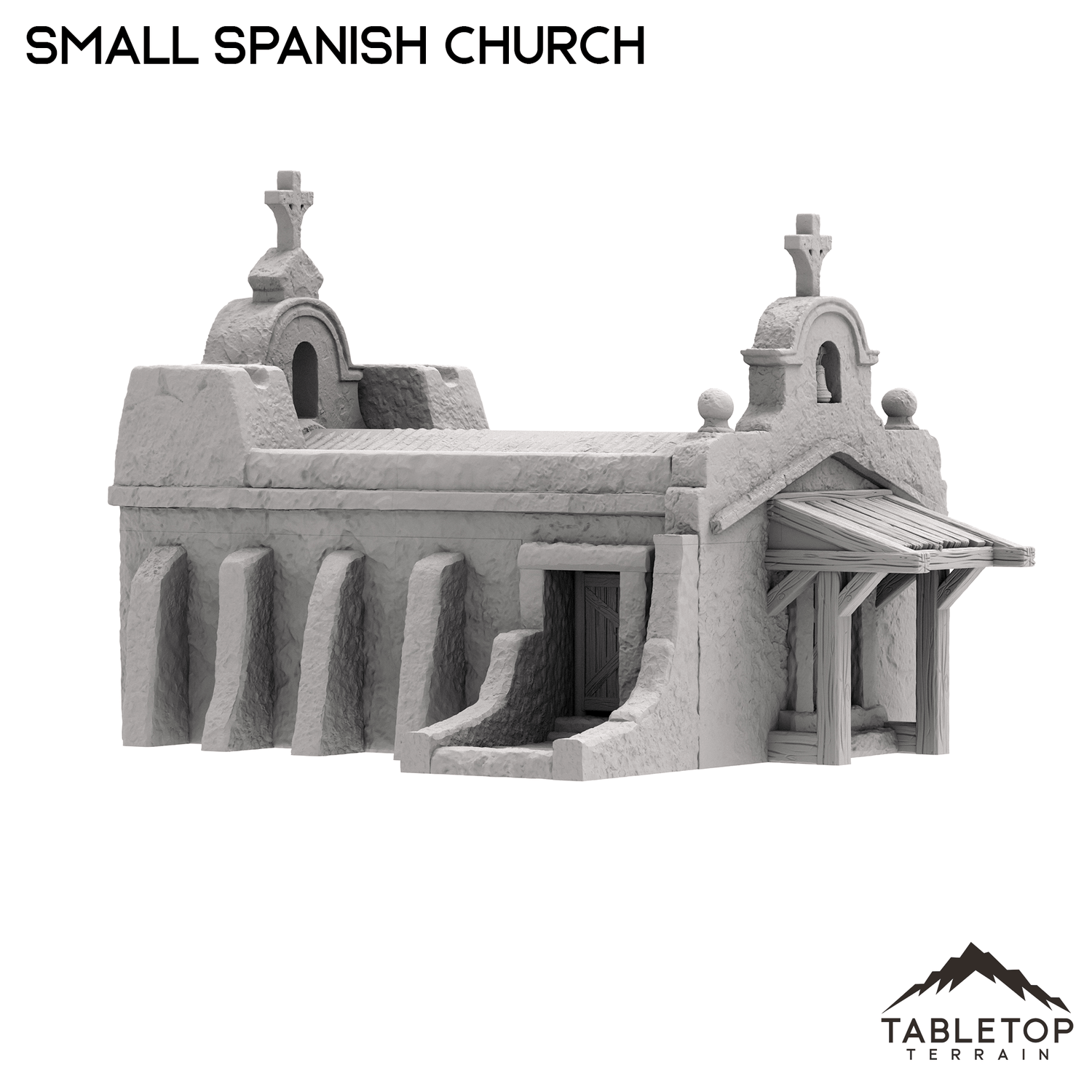 The Small Spanish Church is a multi-level structure with removable roof for interior miniature placement.