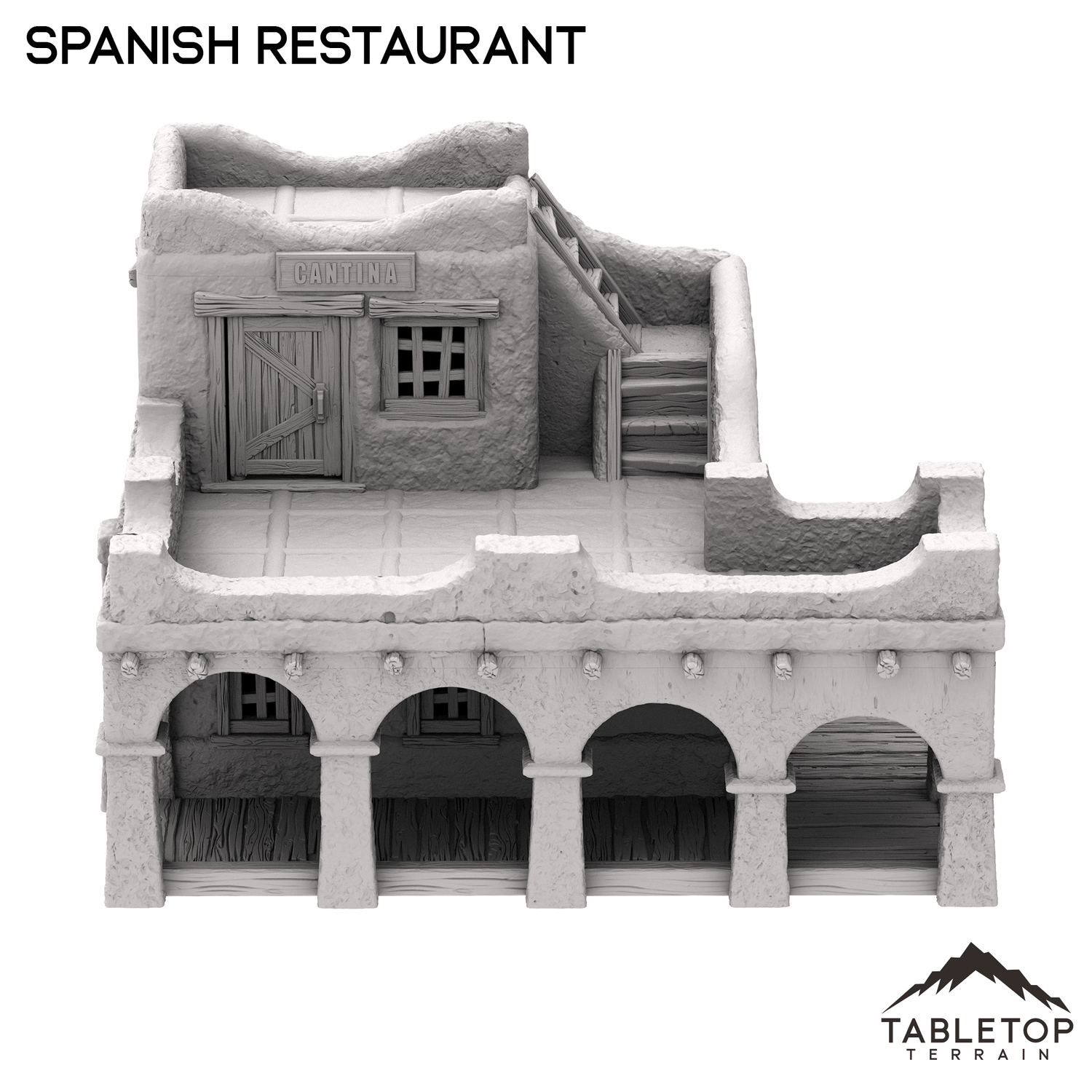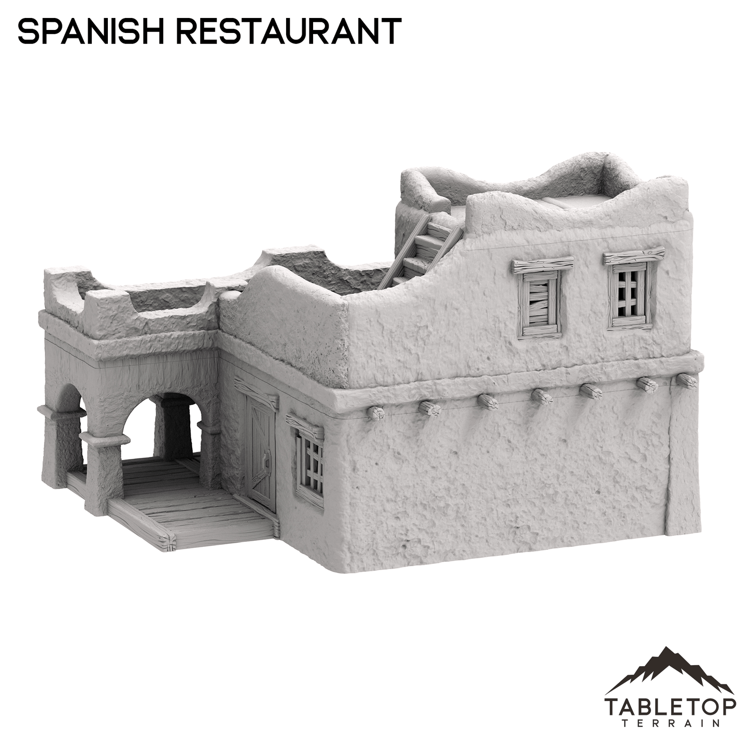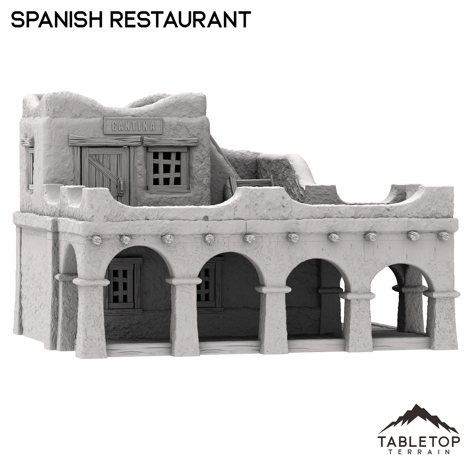 The Spanish Restaurant is an Old West themed two-story building. The roof is removable for interior miniature placement on the upper and lower levels.