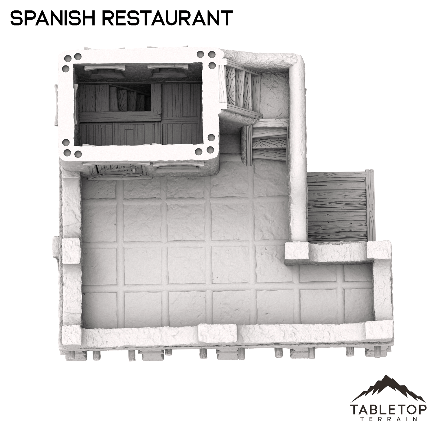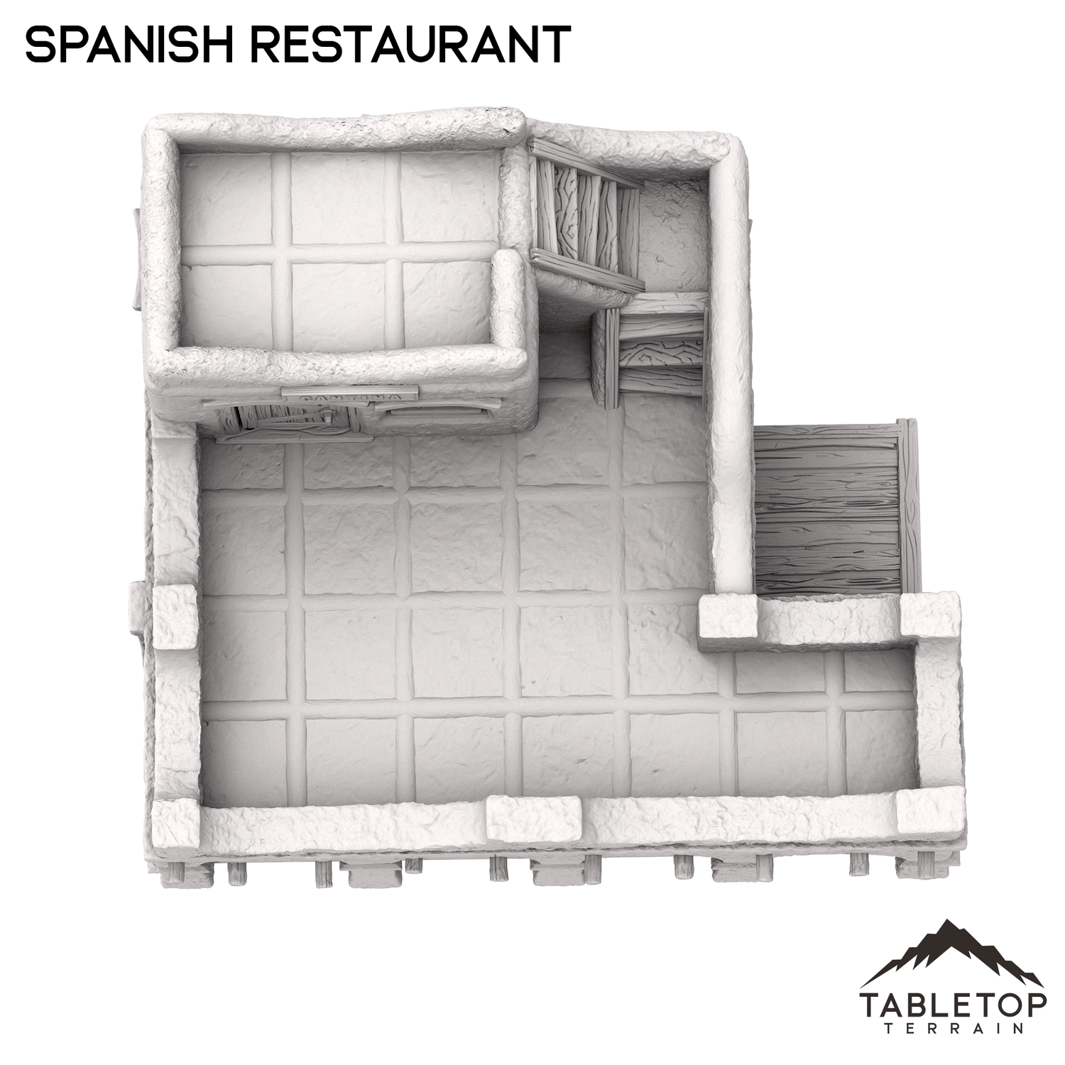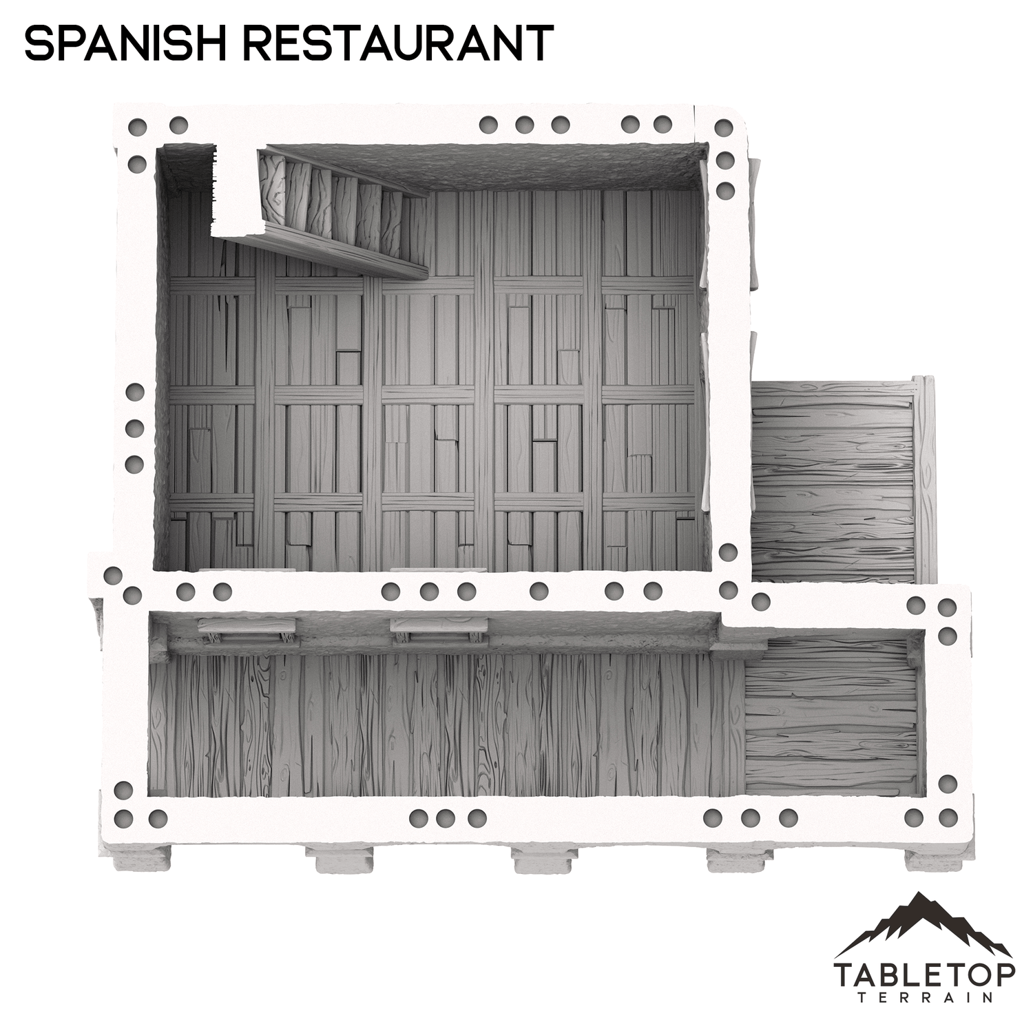 The Spanish Restaurant is an Old West themed two-story building. The roof is removable for interior miniature placement on the upper and lower levels.
