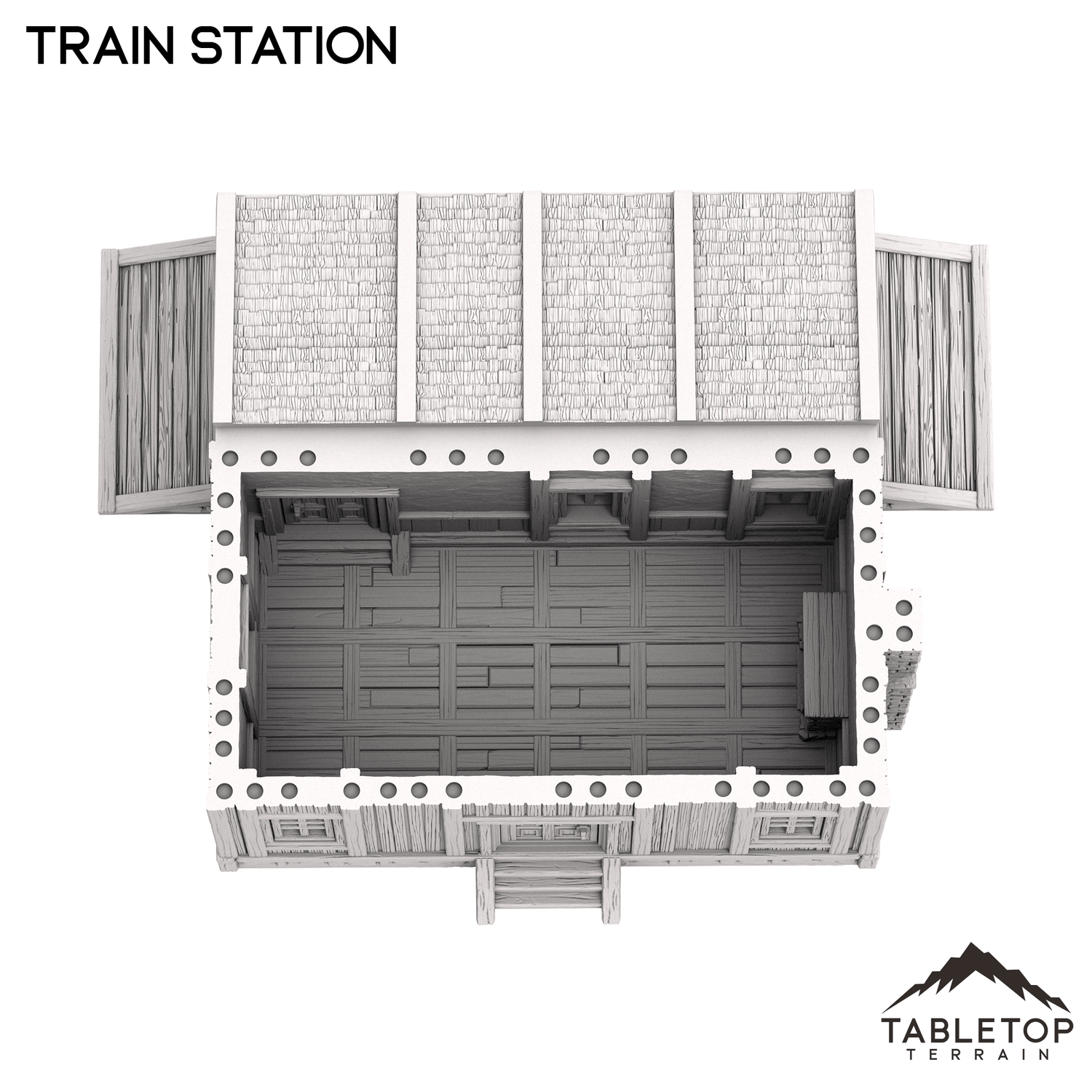 The Train Station is an Old West themed building. The roof is removable for interior miniature placement.