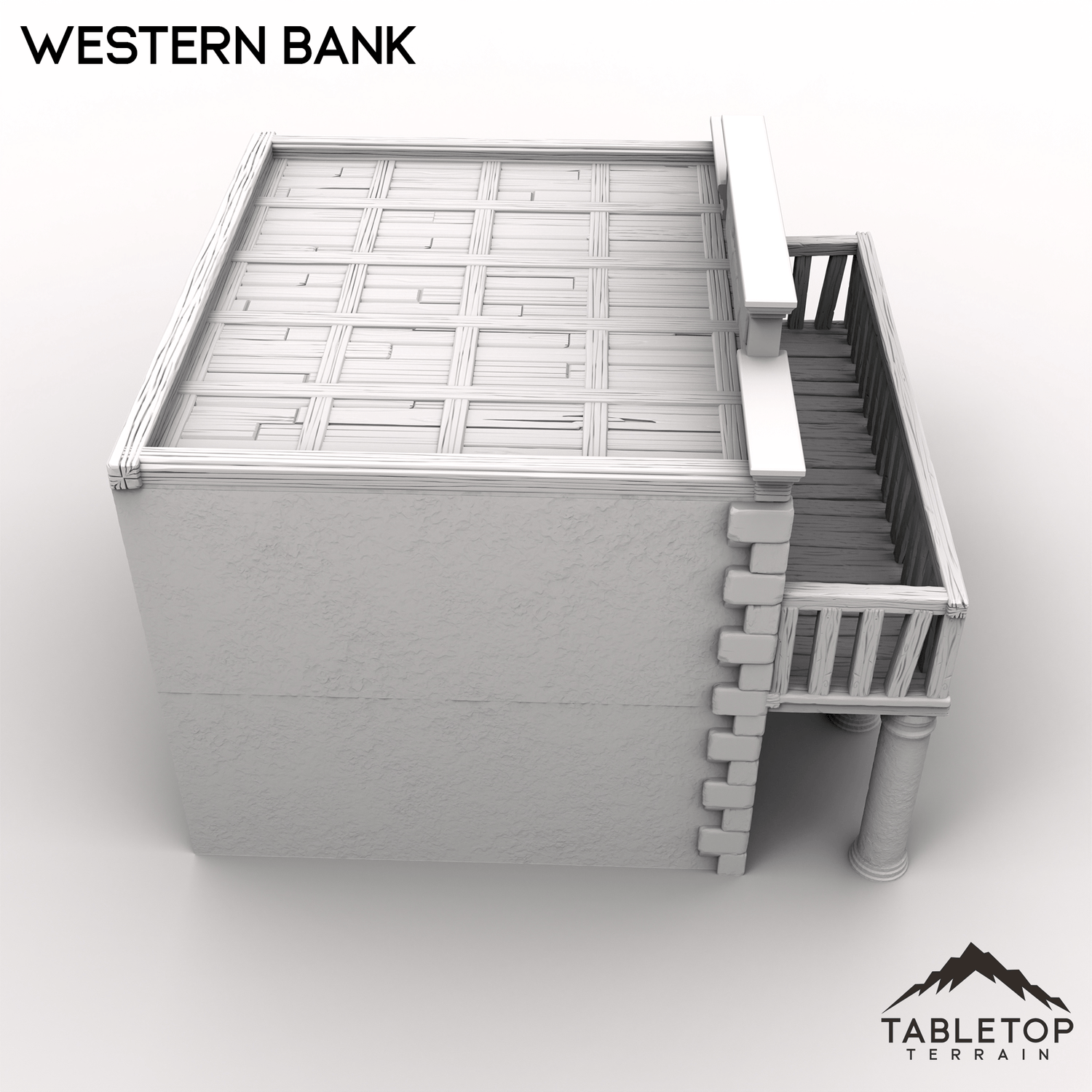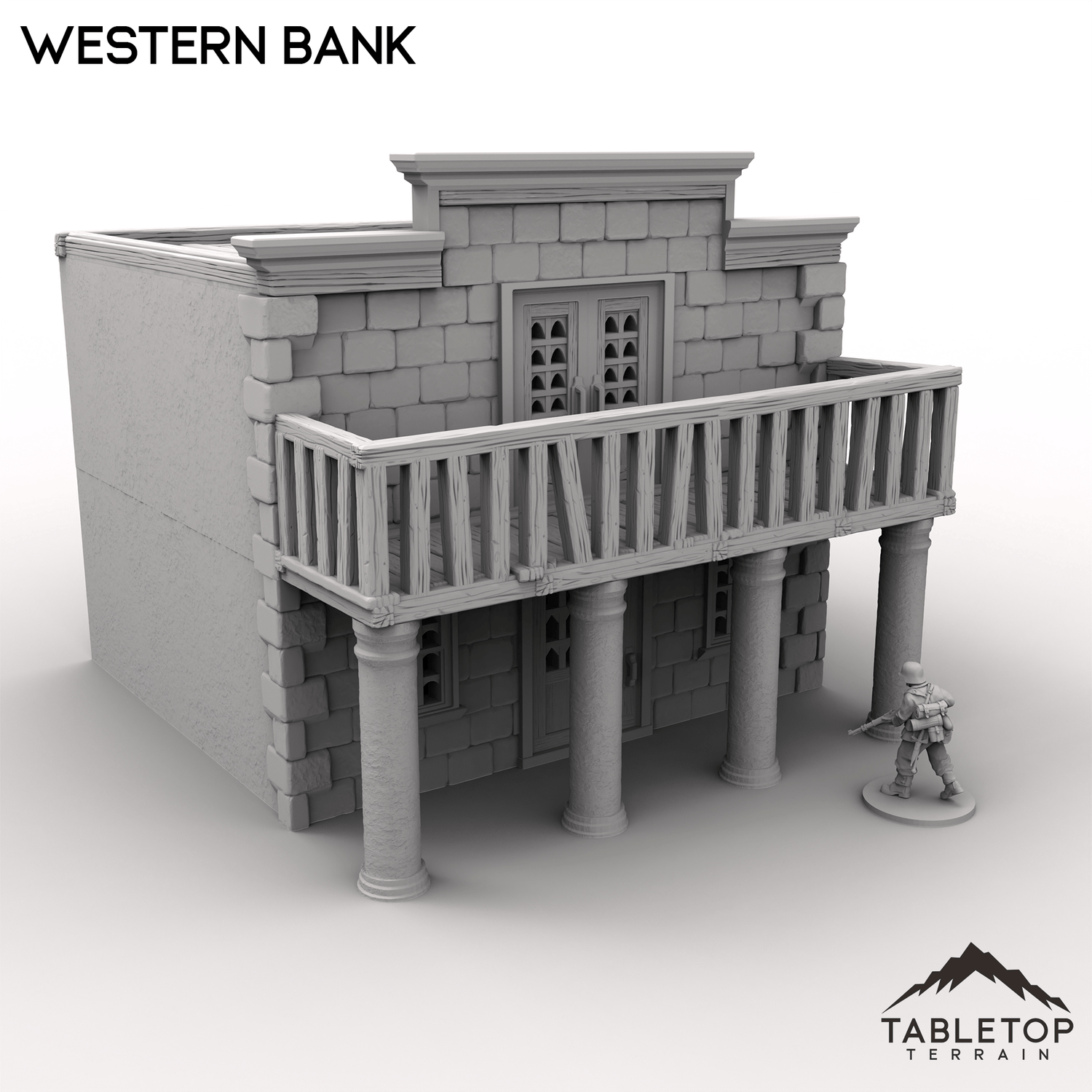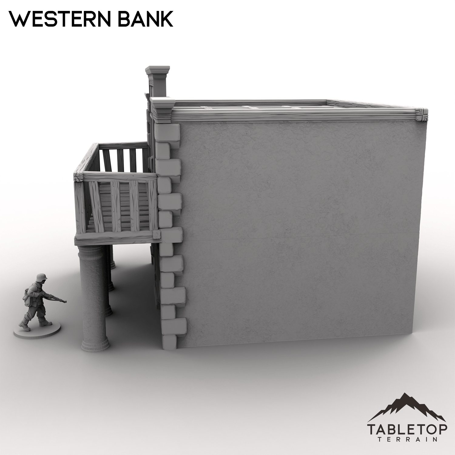 A classic two-story Western Bank featuring a prominent wooden balcony supported by four sturdy columns, with a functional 2nd floor connected by staircase. The stone-textured facade and detailed railings give the building an authentic frontier town feel. Ideal for tabletop settings in Wild West scenarios, involving bank heists or big money deals.
