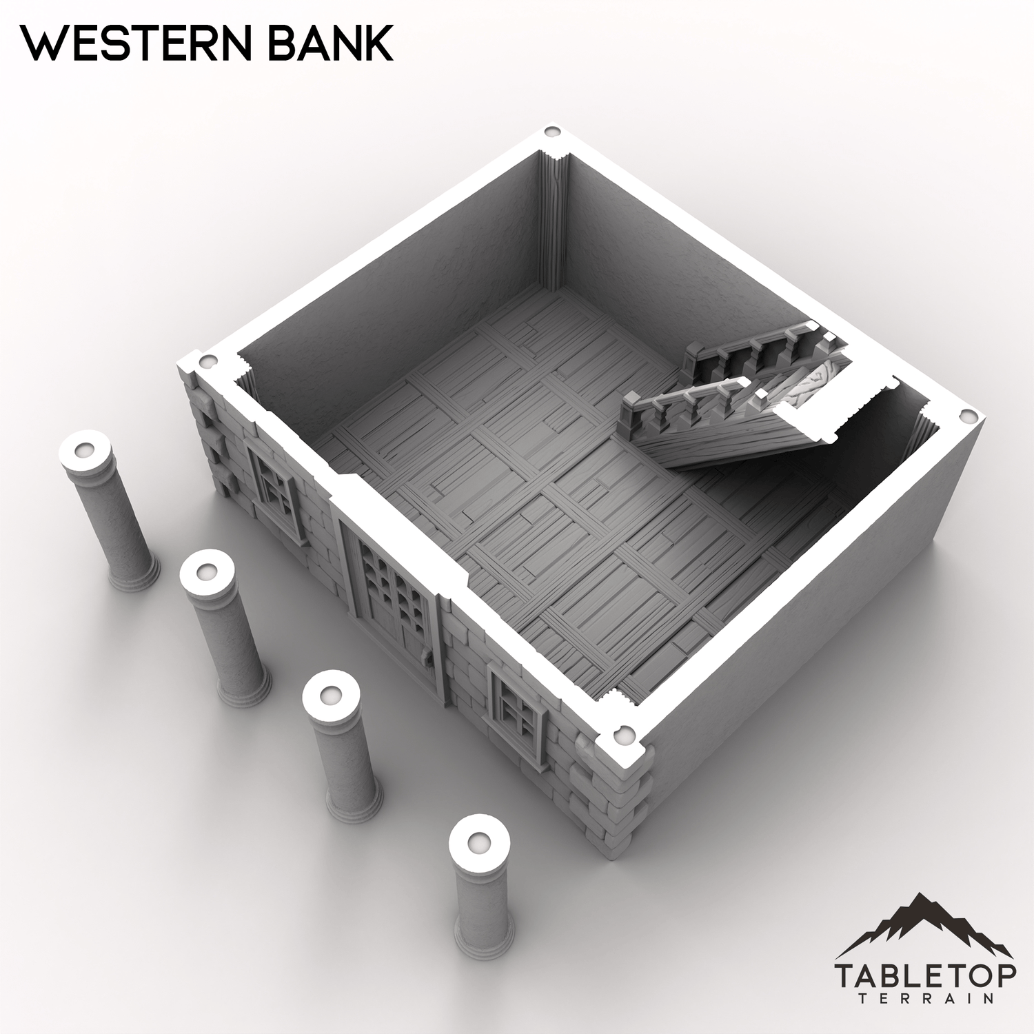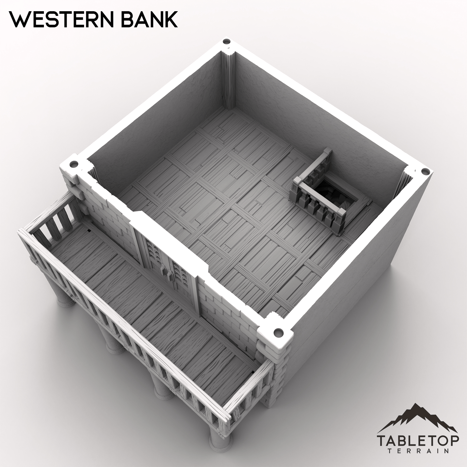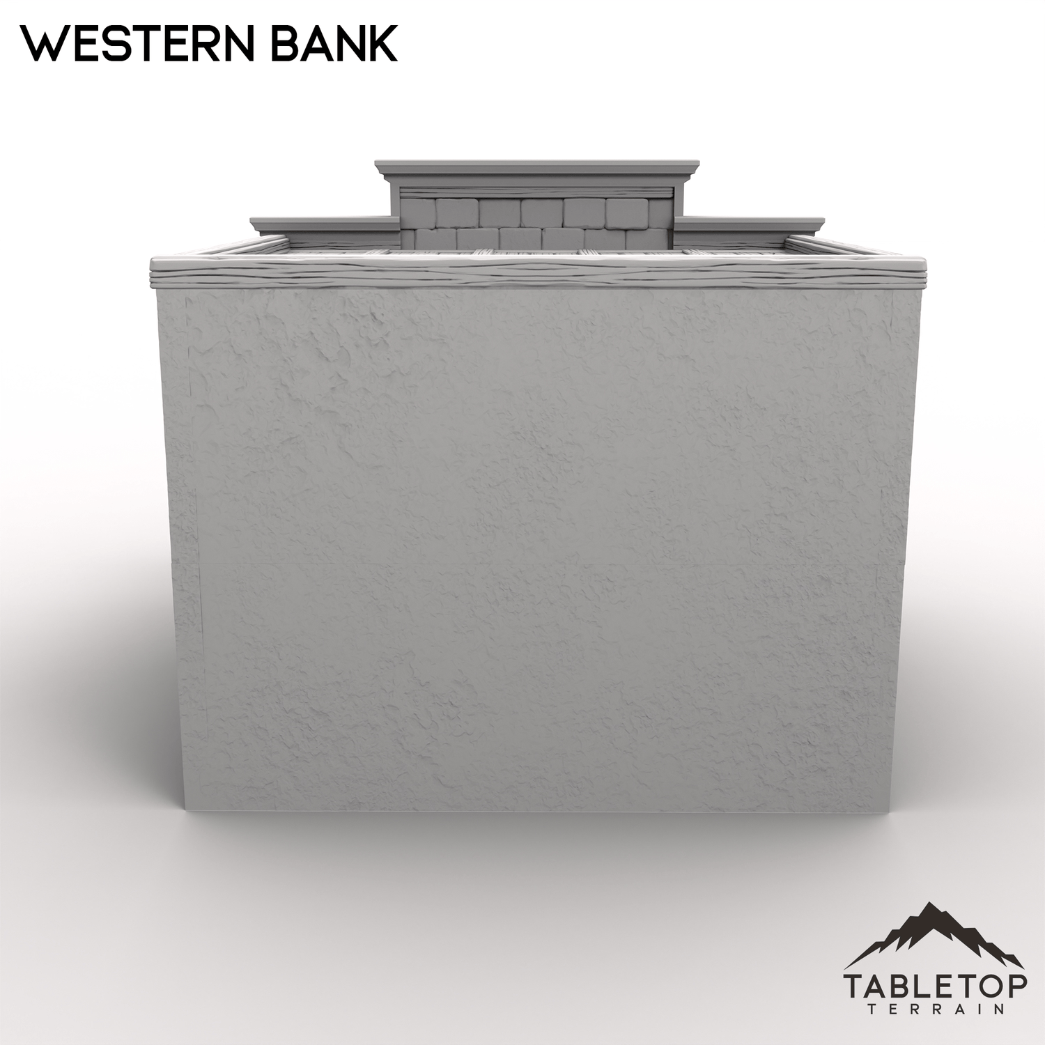 A classic two-story Western Bank featuring a prominent wooden balcony supported by four sturdy columns, with a functional 2nd floor connected by staircase. The stone-textured facade and detailed railings give the building an authentic frontier town feel. Ideal for tabletop settings in Wild West scenarios, involving bank heists or big money deals.