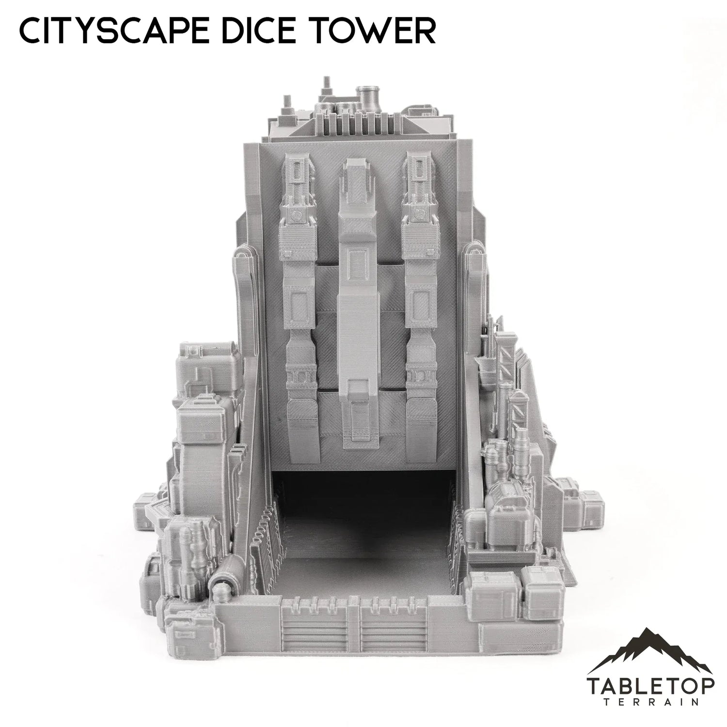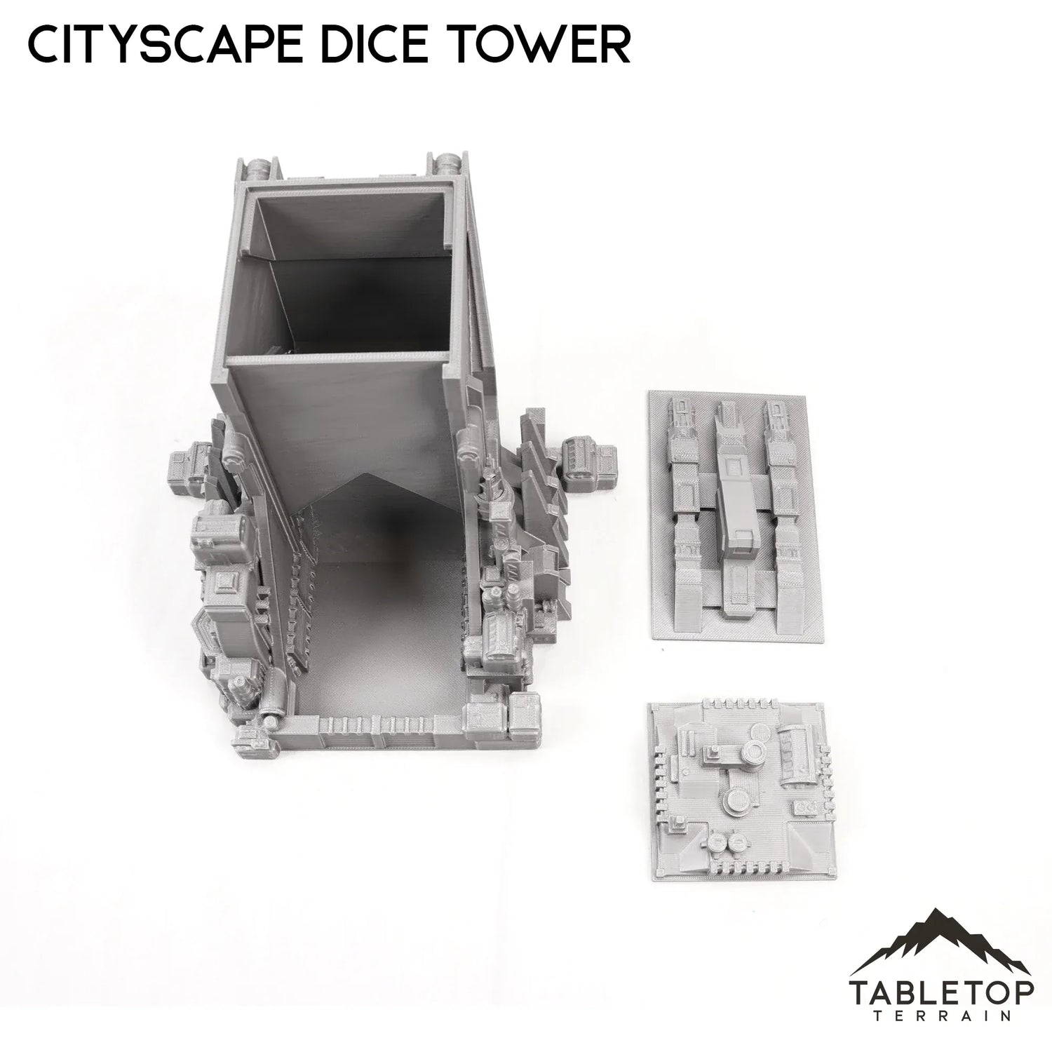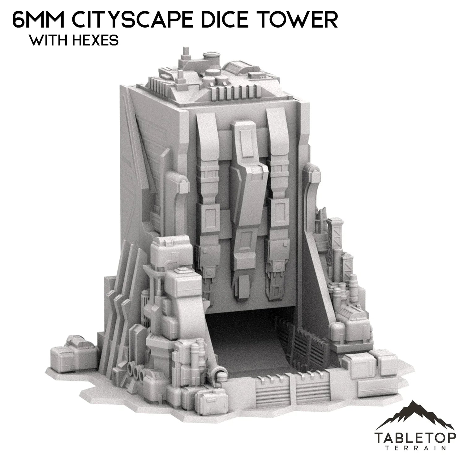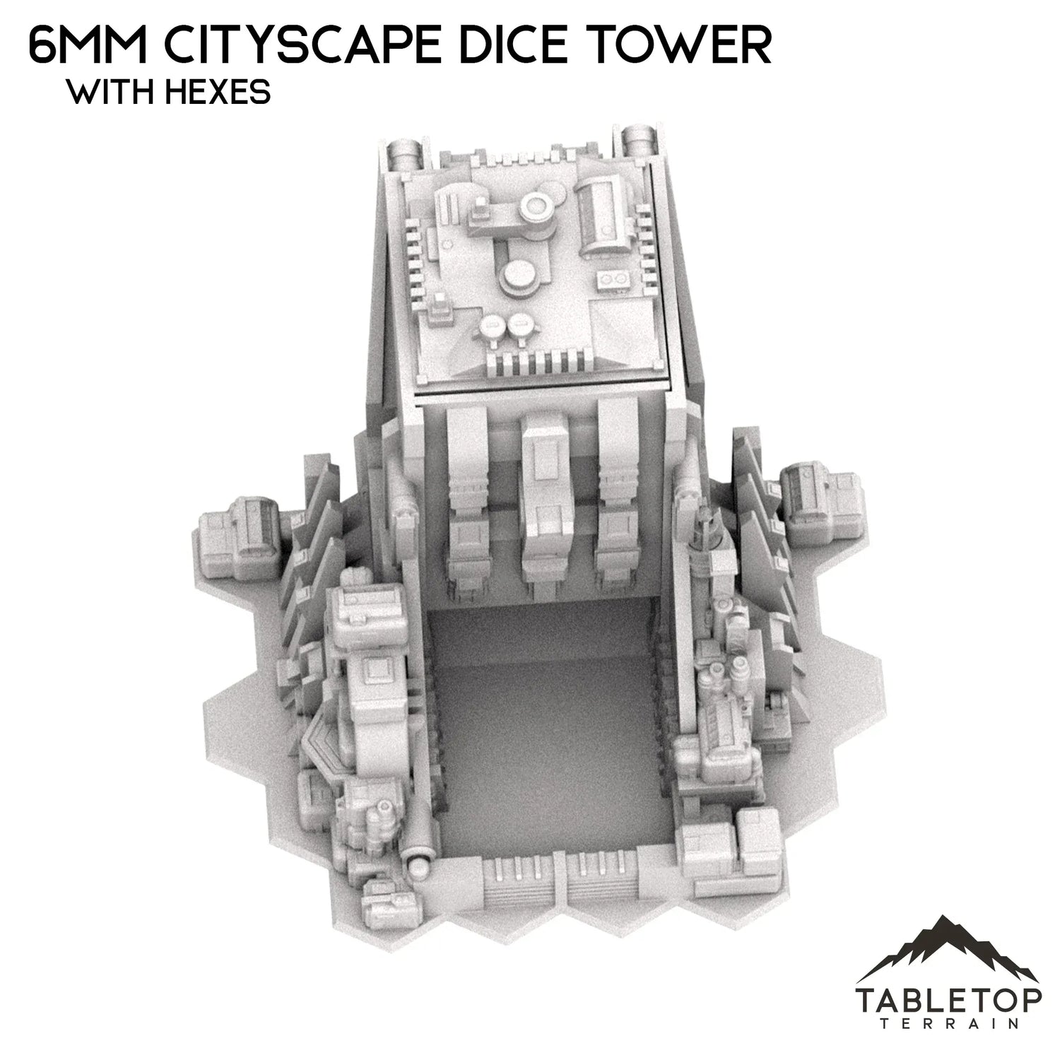 Dieser Sci-Fi-Cityscape-Würfelturm im Maßstab 6 mm passt als Gebäude zum restlichen Cityscape-Gelände und dient gleichzeitig als Würfelturm. Die obere und vordere Kappe lassen sich ohne Klebstoff leicht ein- und ausschieben. Er eignet sich hervorragend für jedes 6-mm-Mech-Tischkriegsspiel.