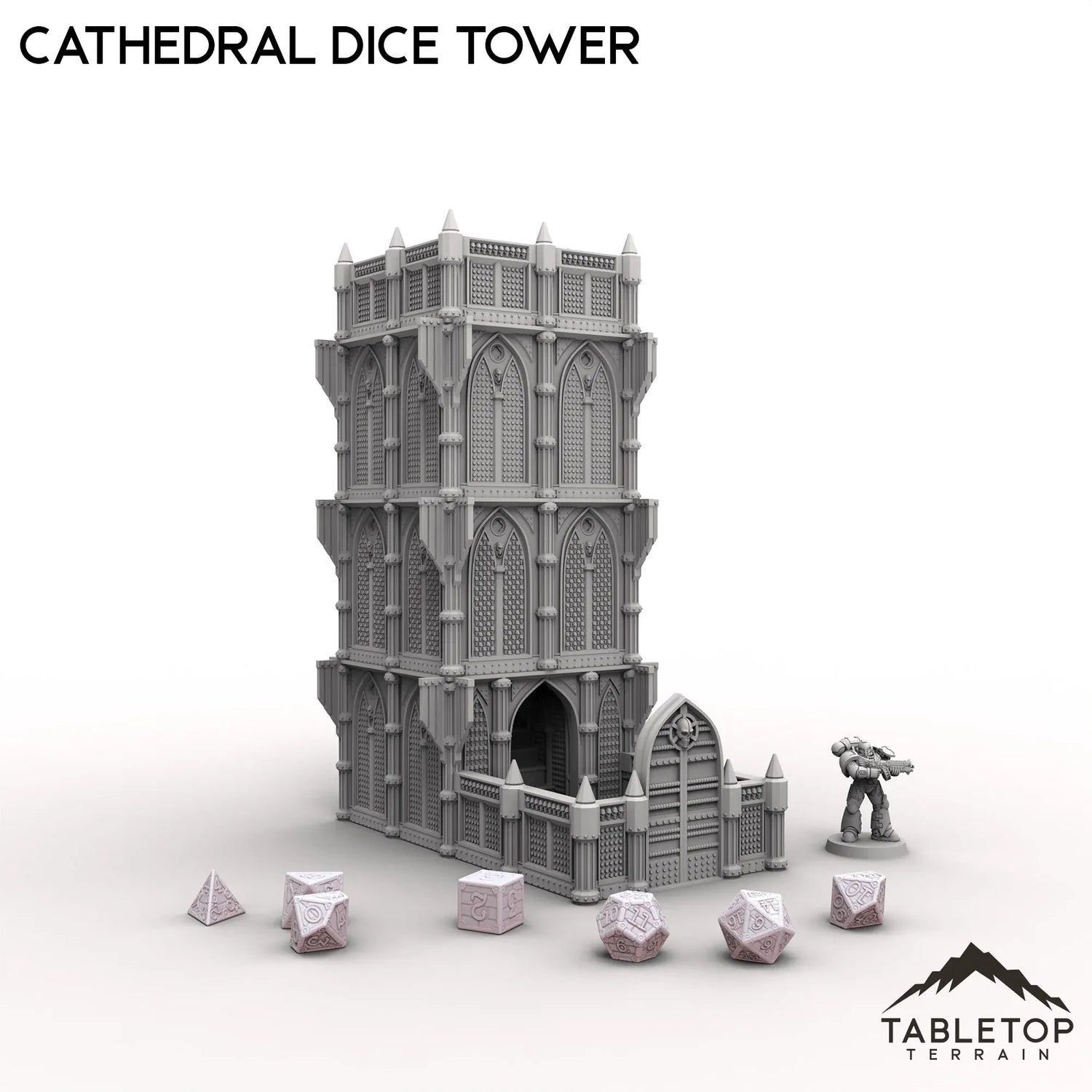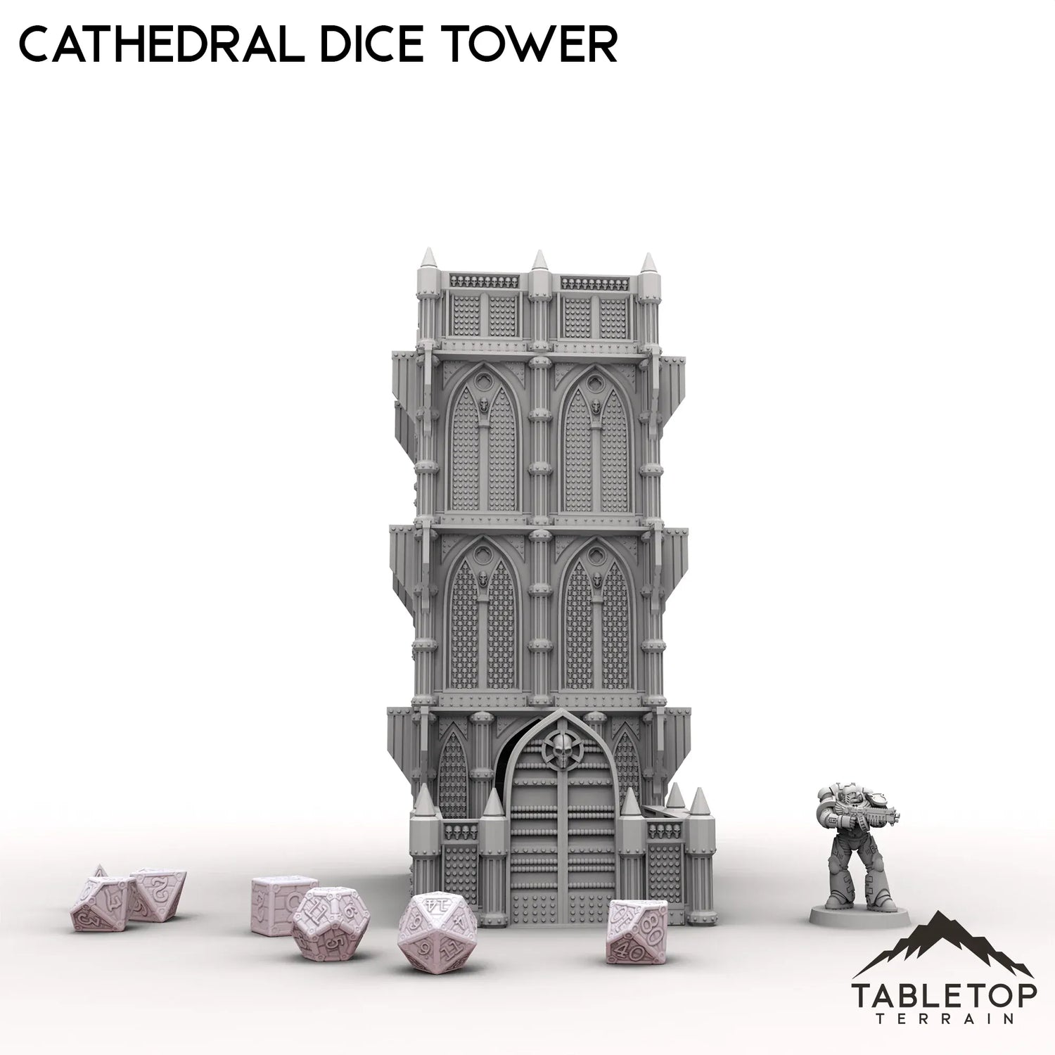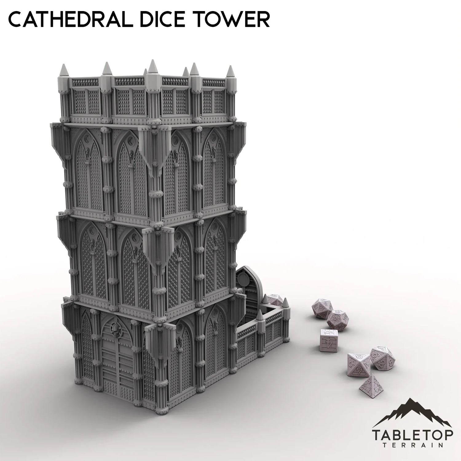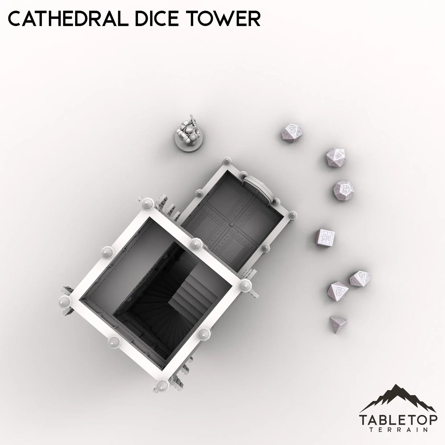 Dieser gotische Würfelturm im Kathedralenstil besticht durch seine verstärkten Wände, Bogenfenster und genieteten Beschläge. Er ist stilvoll und funktional zugleich und lässt die Würfel durch sein geschichtetes Inneres purzeln, bevor sie im ummauerten Innenhof darunter zur Ruhe kommen.