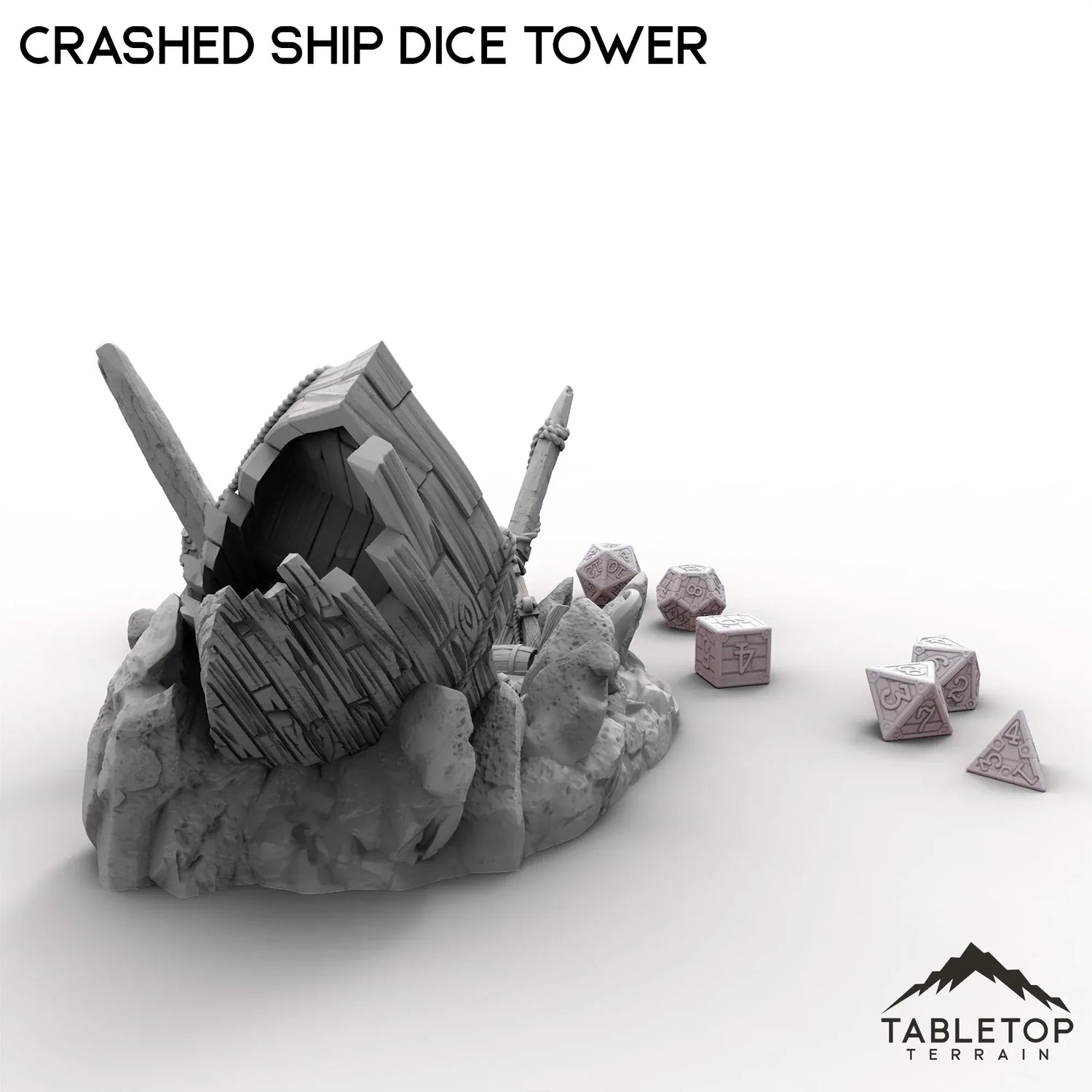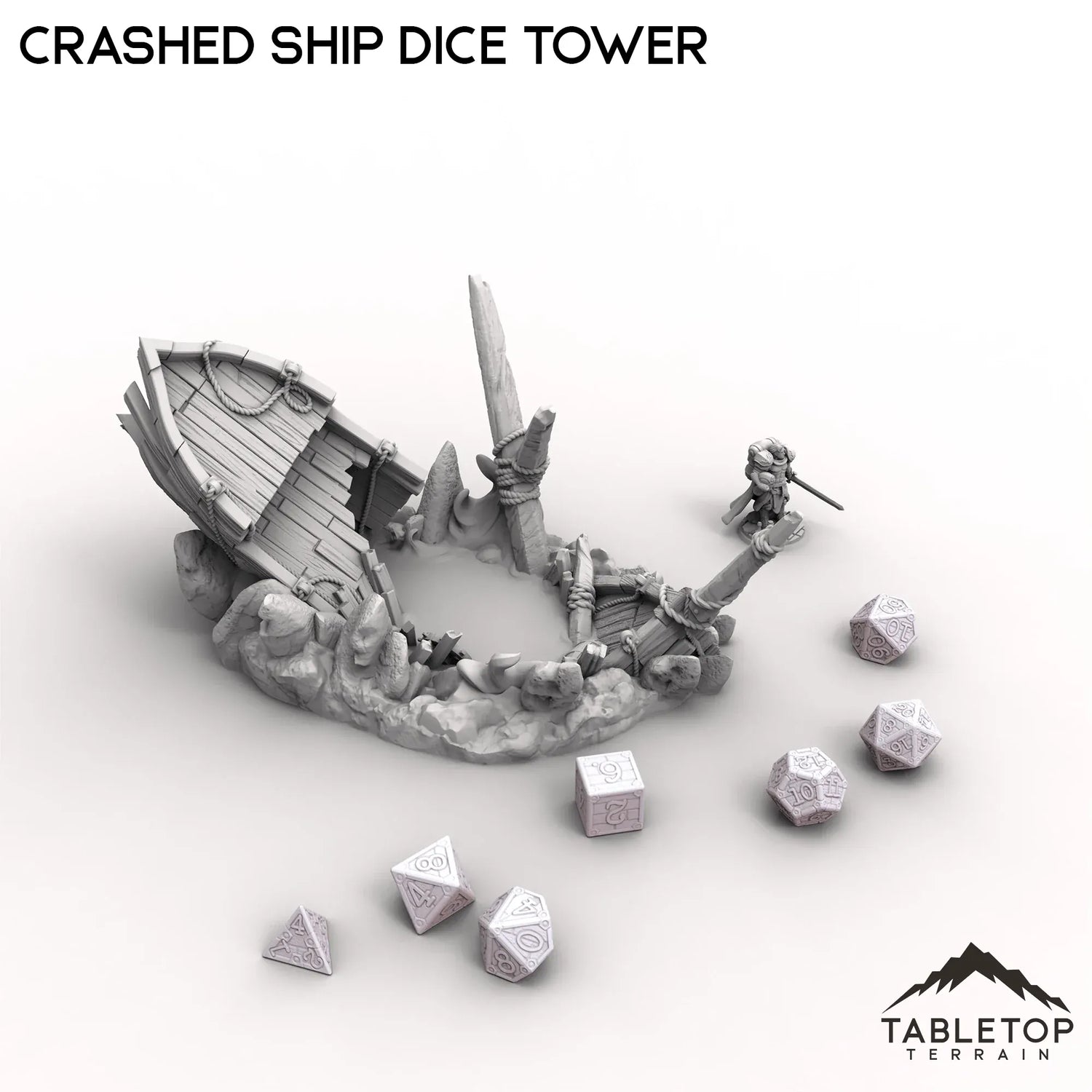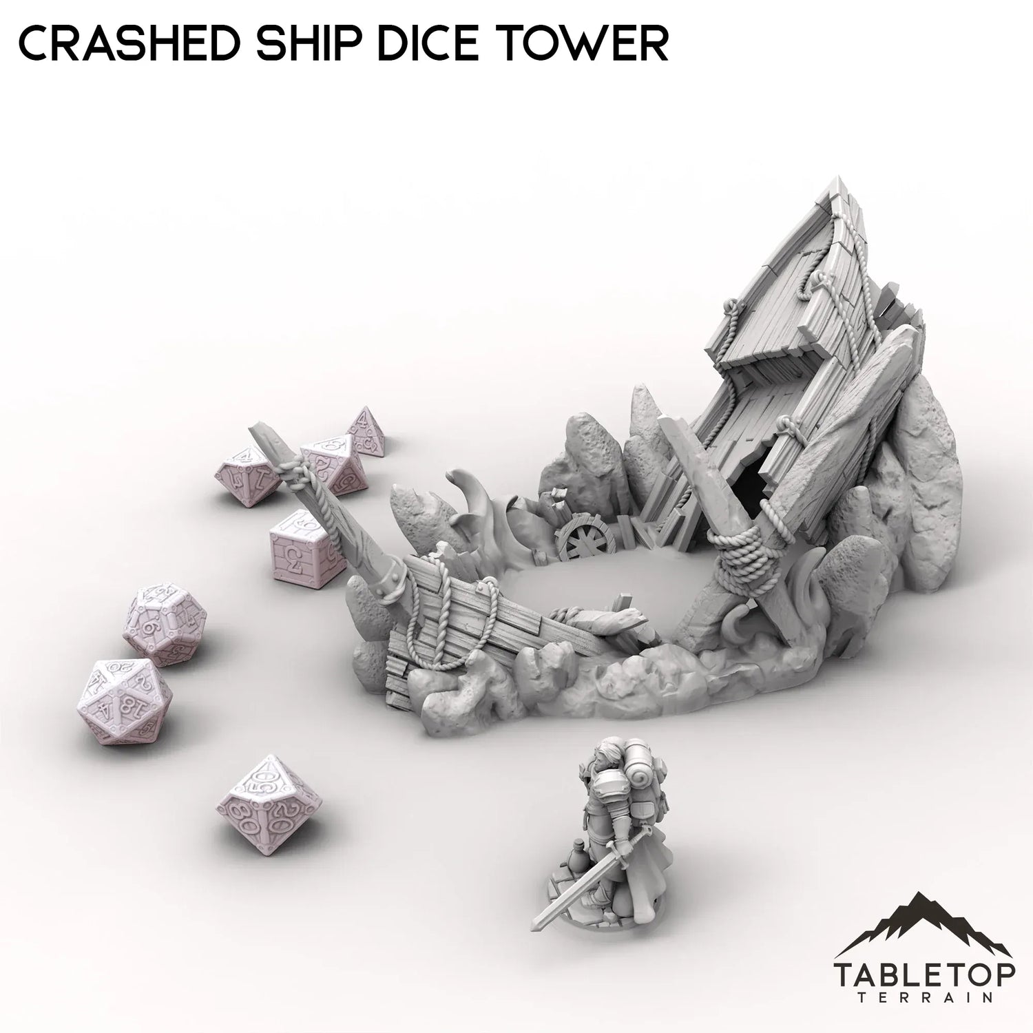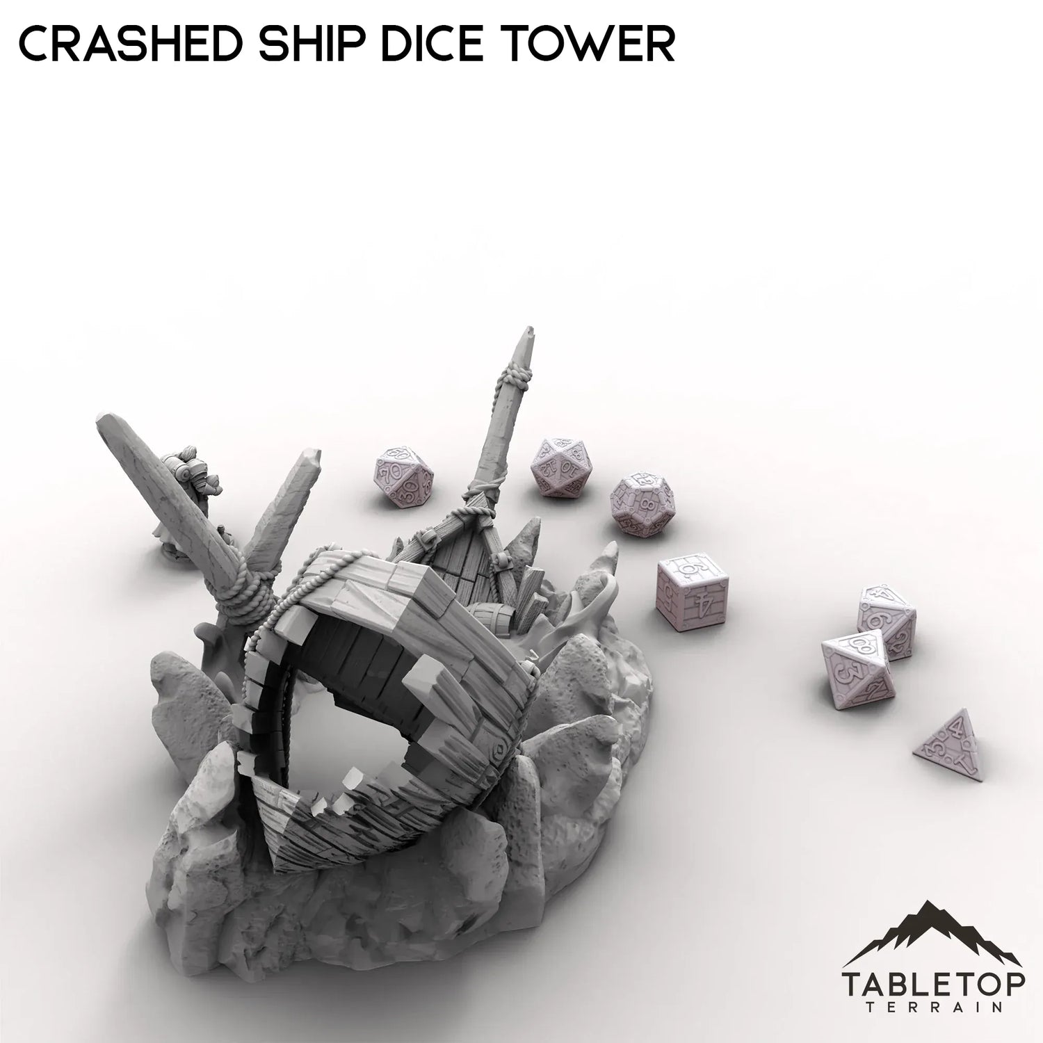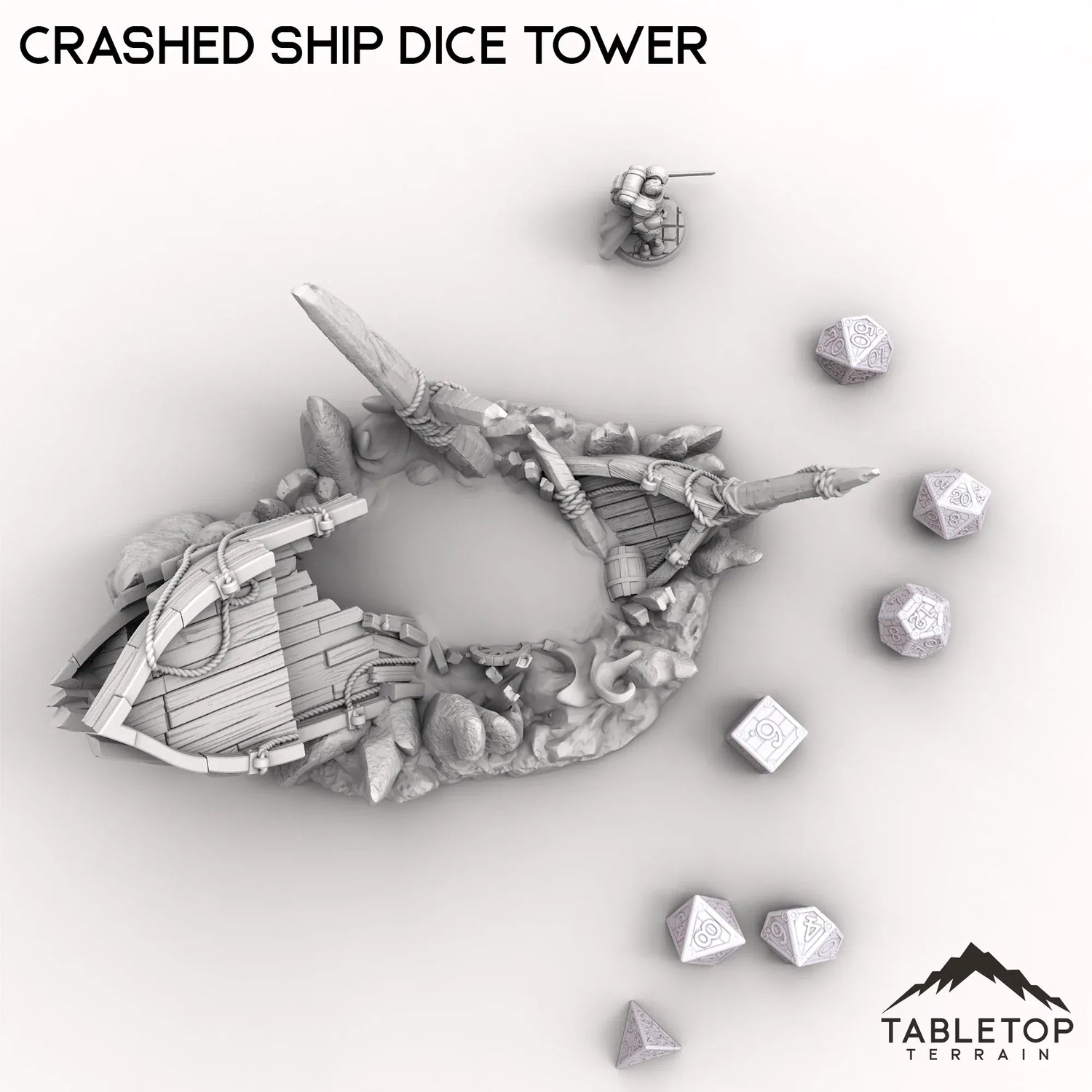 Dieser Würfelturm mit dem Motiv „Abgestürztes Schiff“ bringt das Chaos eines Schiffswracks auf Ihren Tisch. Würfel rollen durch den zerbrochenen Rumpf, navigieren über zersplitterte Planken und schroffe Felsen, bevor sie im Wrack darunter landen.