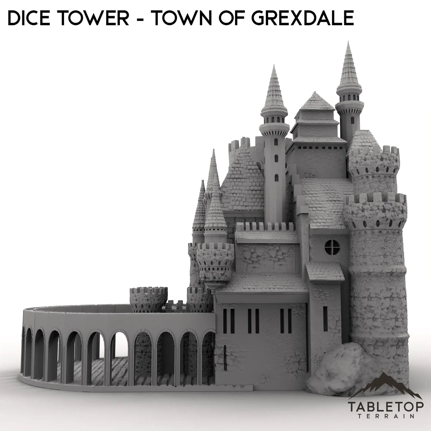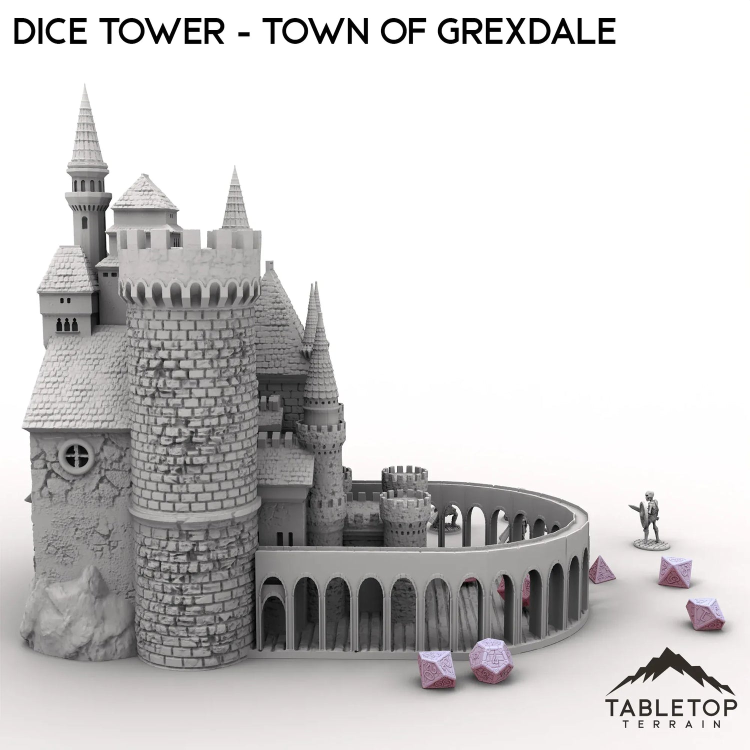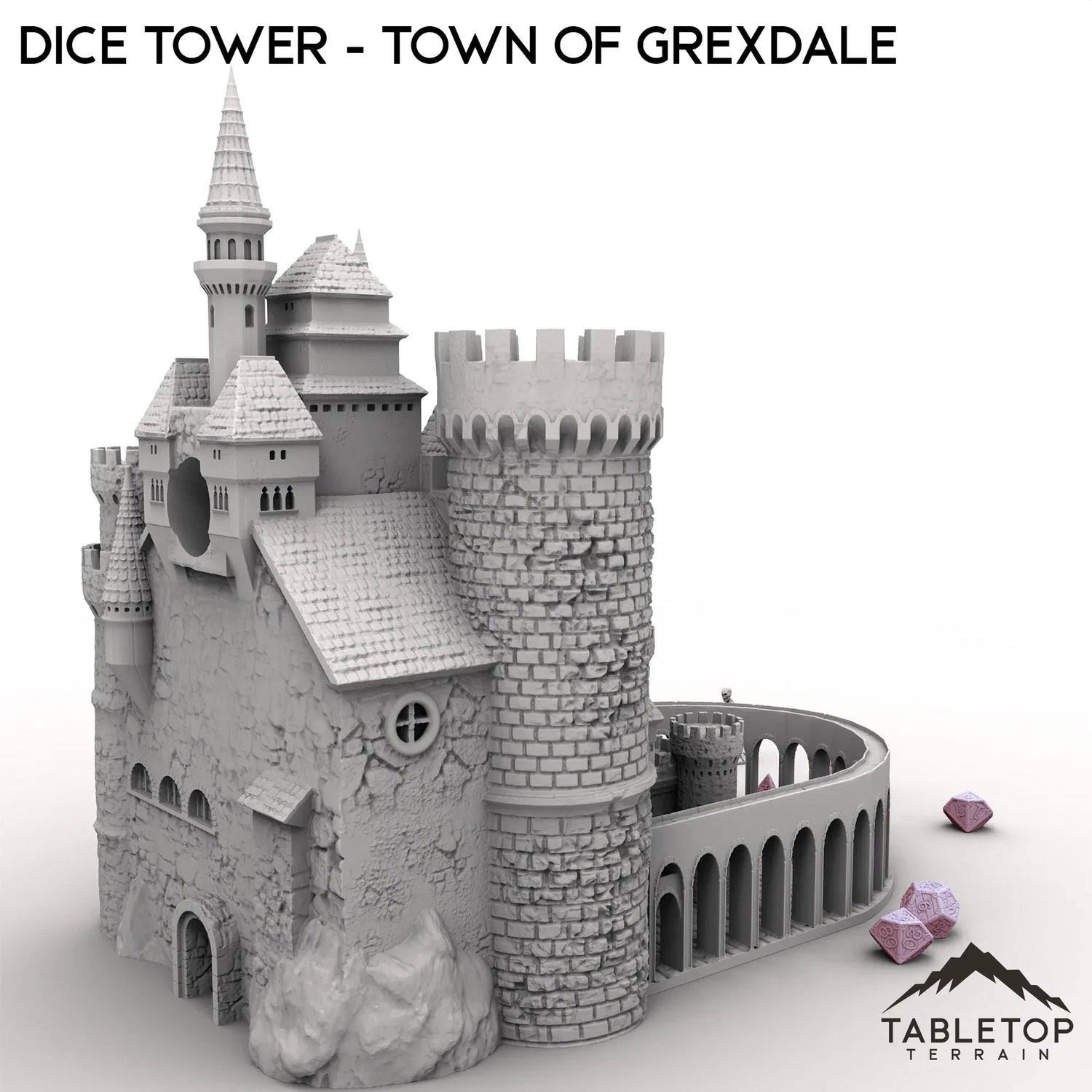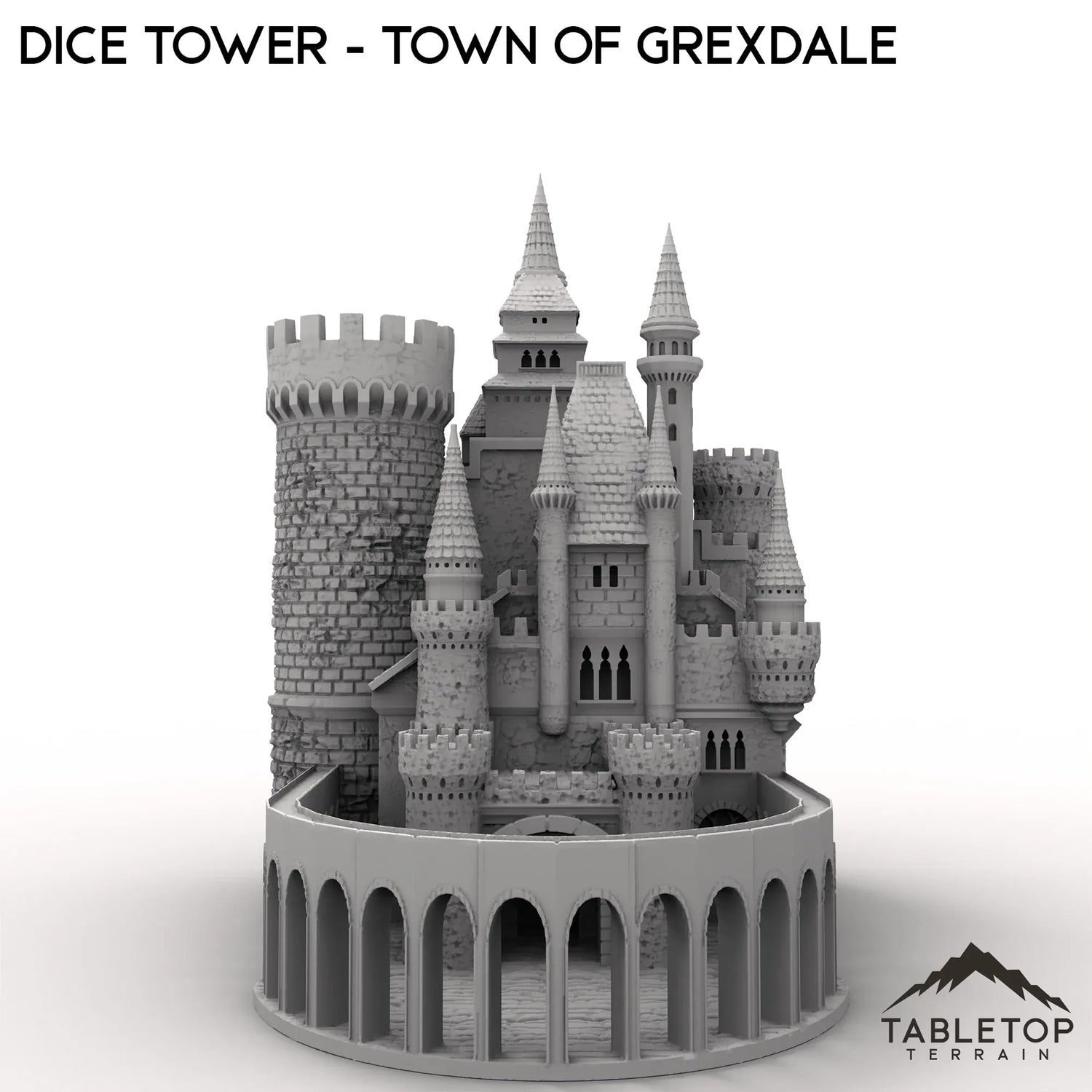 Der Würfelturm aus der Stadt Grexdale ist eine massive Burg mit Türmen und Zinnen, die das Gebäude umgeben. Er verfügt über eine Würfelrutsche und eine Ablage am Boden zum Auffangen der Würfel. Der Turm ist für Fantasy-Spiele konzipiert, funktioniert aber mit allen gängigen Spielwürfeln.