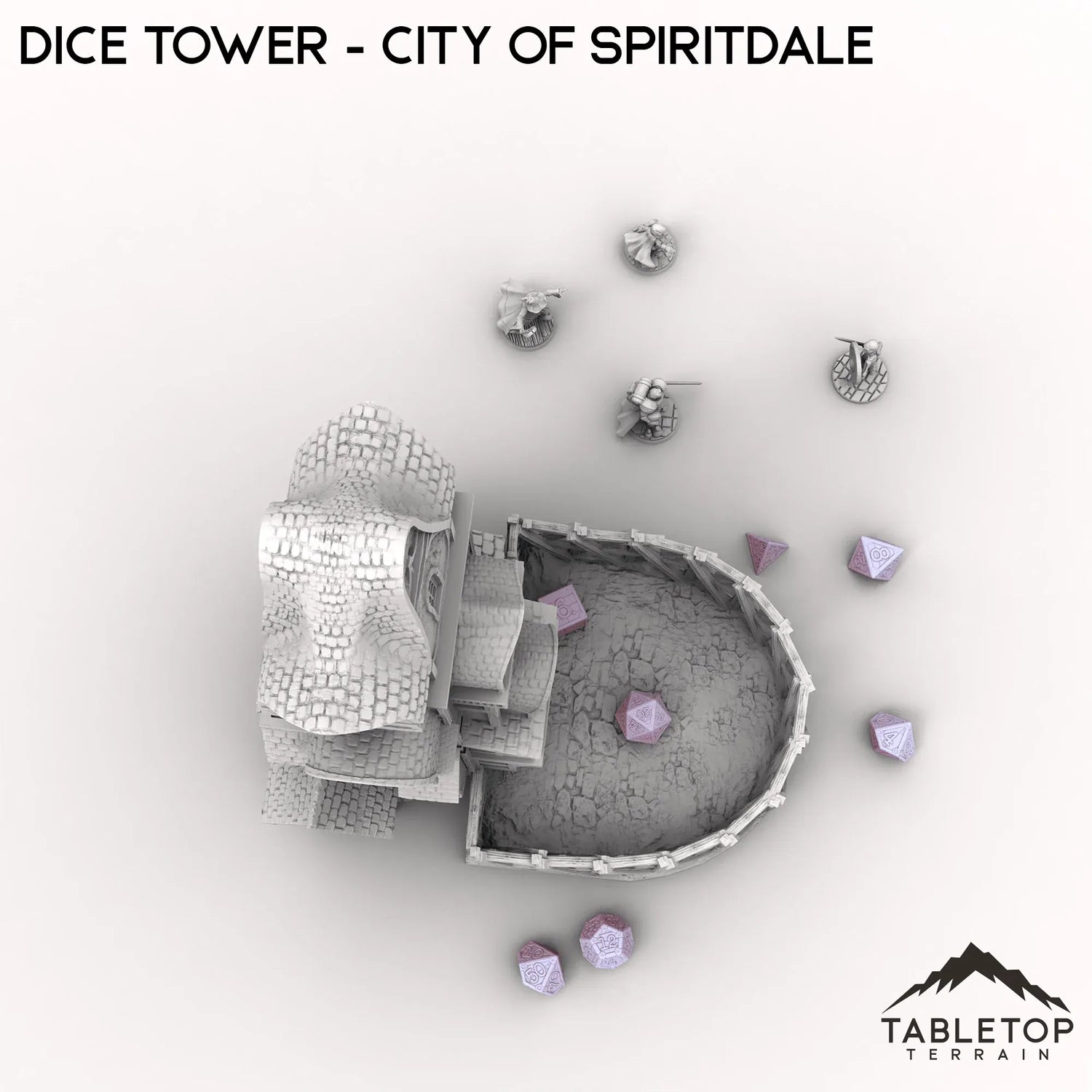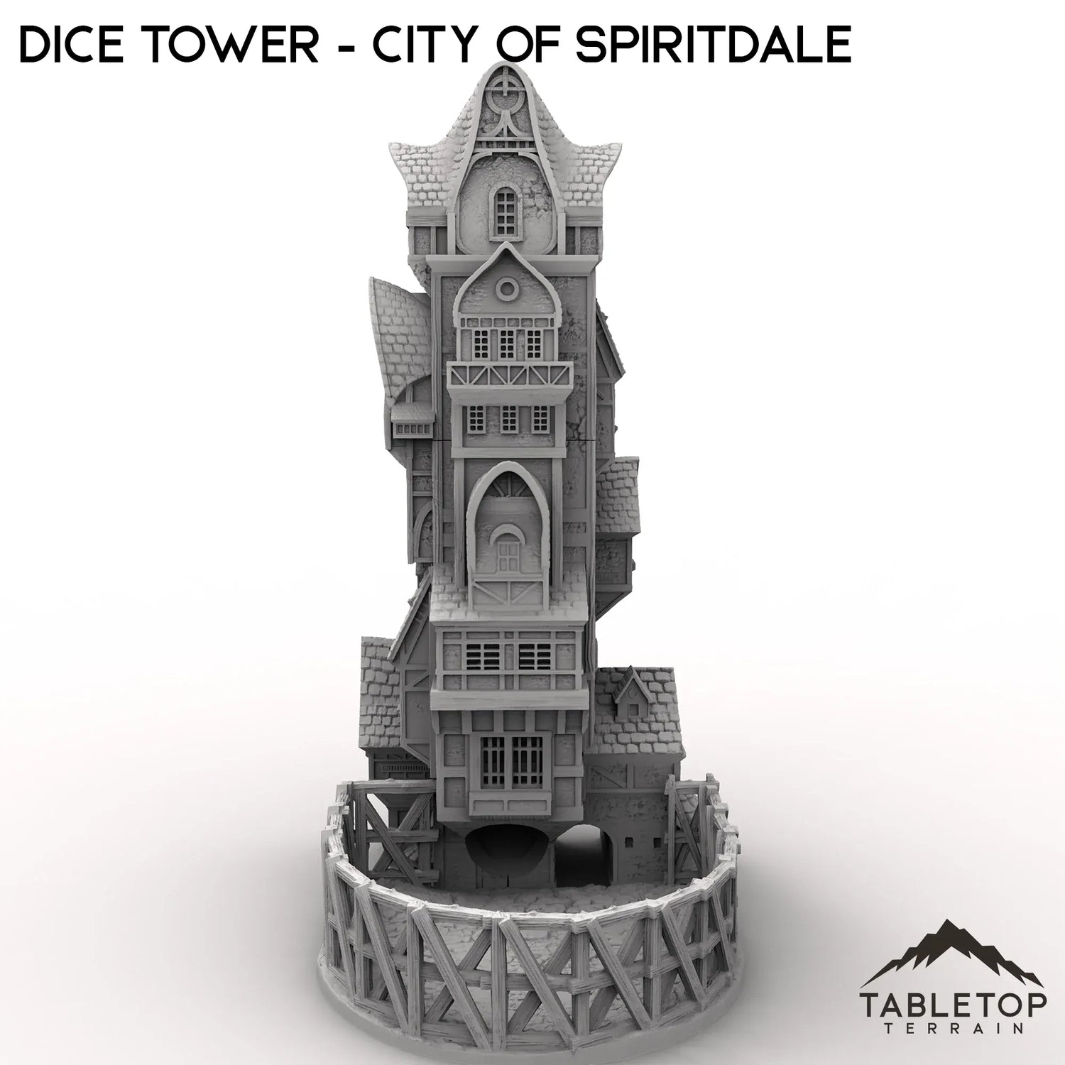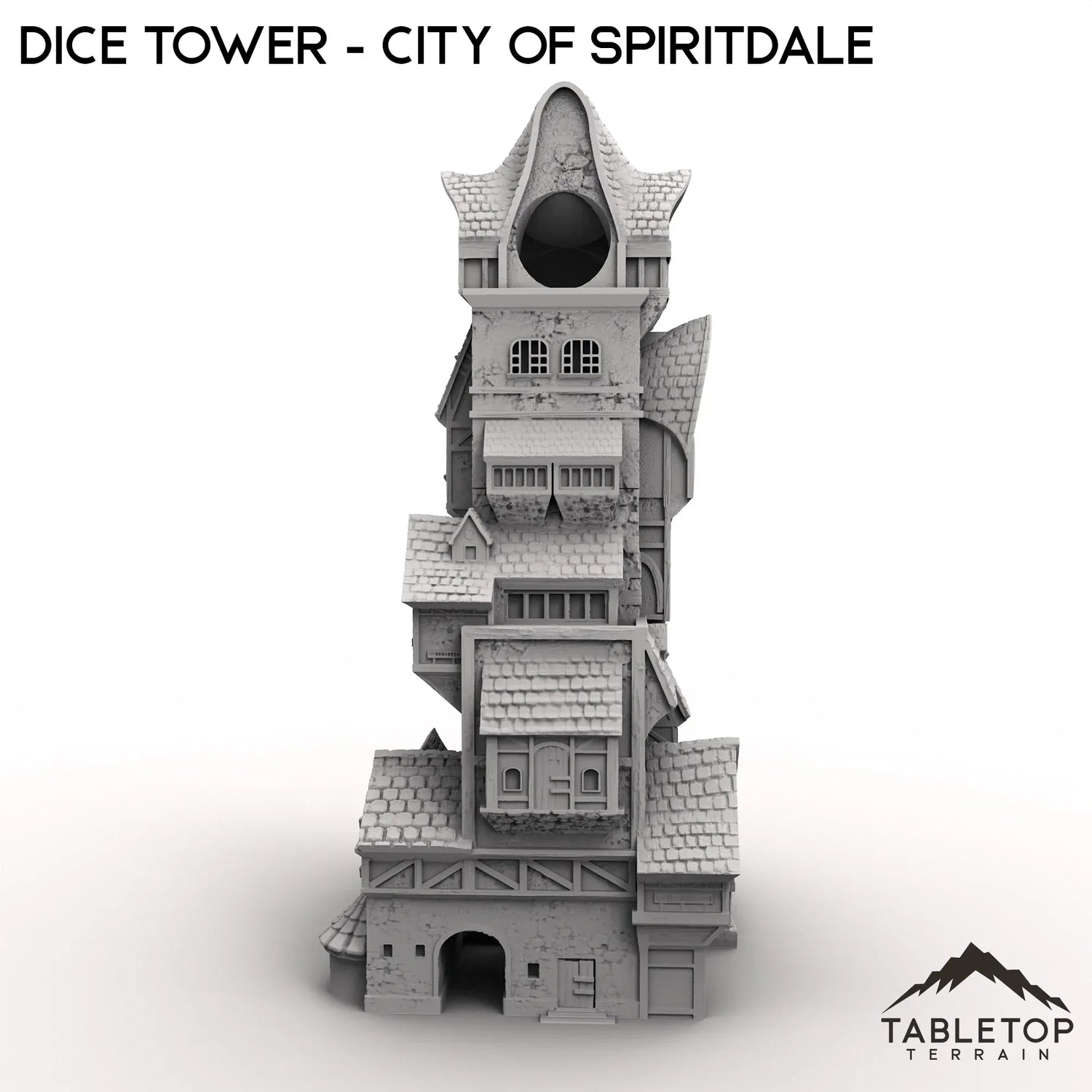 Der Würfelturm aus der Stadt Spiritdale besteht aus mehreren hoch gestapelten und ineinander verschlungenen Gebäuden. Er verfügt über eine Würfelrutsche und eine Ablage am Boden zum Auffangen der Würfel. Der Turm ist für Fantasy-Spiele konzipiert, funktioniert aber mit allen gängigen Spielwürfeln.