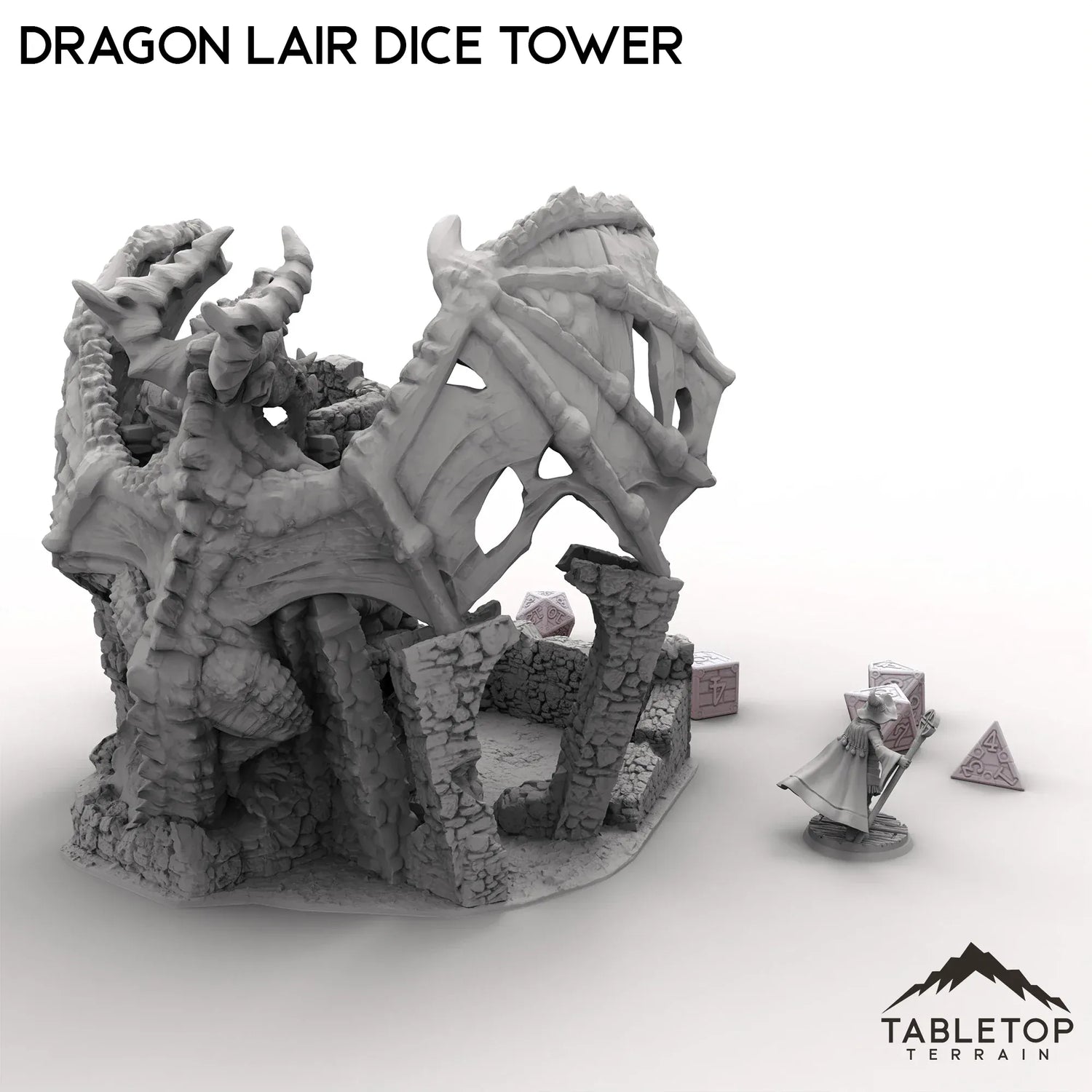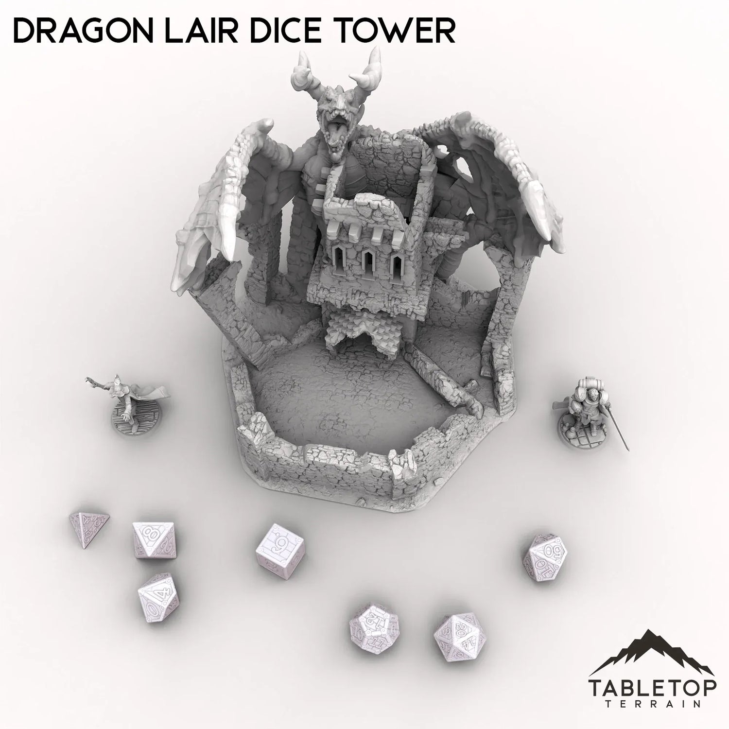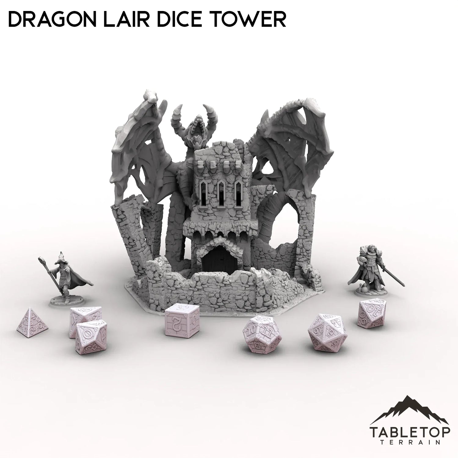 Der Würfelturm „Dragon Lair“ zeigt einen furchterregenden Drachen auf einer Burgruine. Die skulpturalen Details, von den Drachenschuppen bis zum umgebenden Mauerwerk, schaffen eine dramatische Atmosphäre für Ihre Tabletop-Abenteuer.