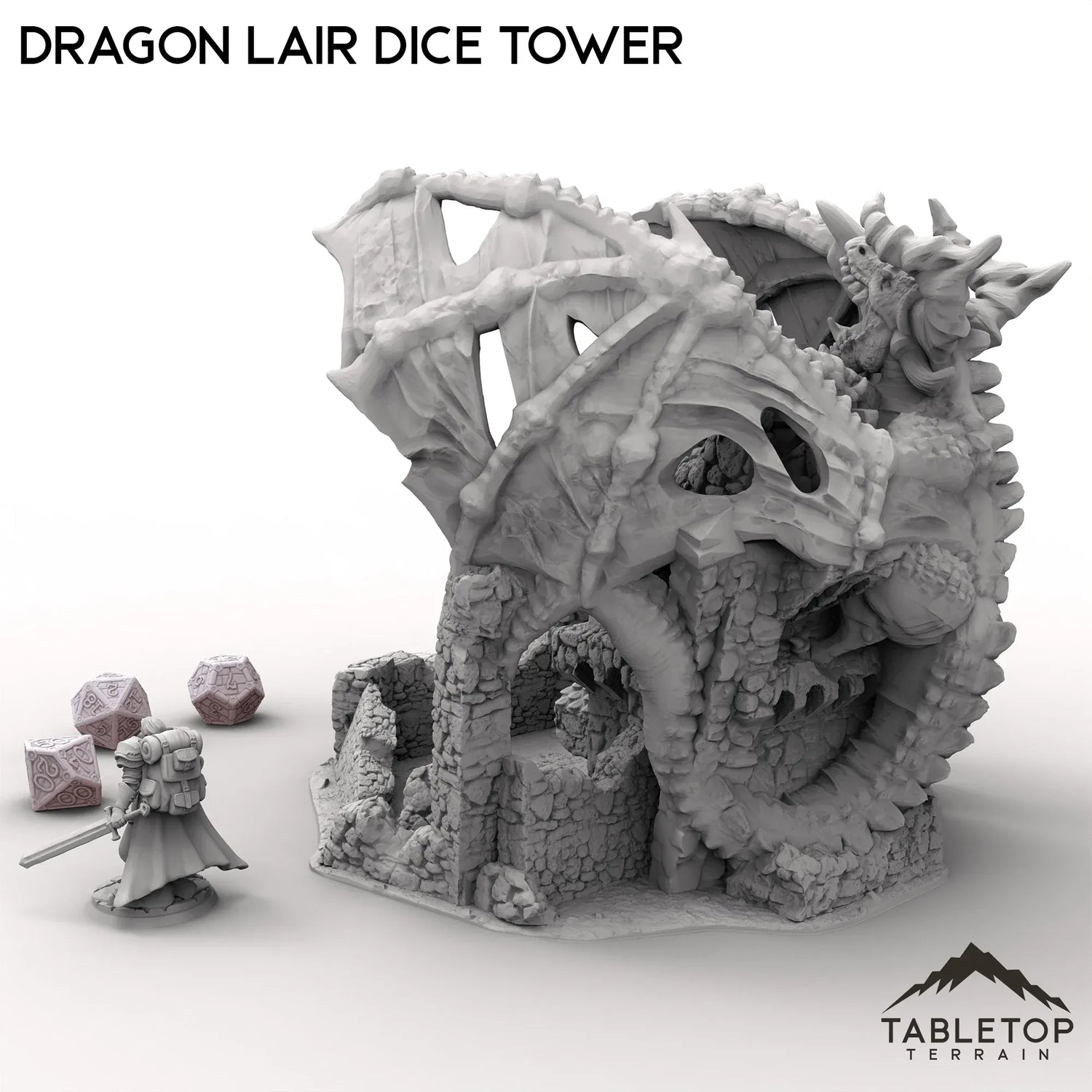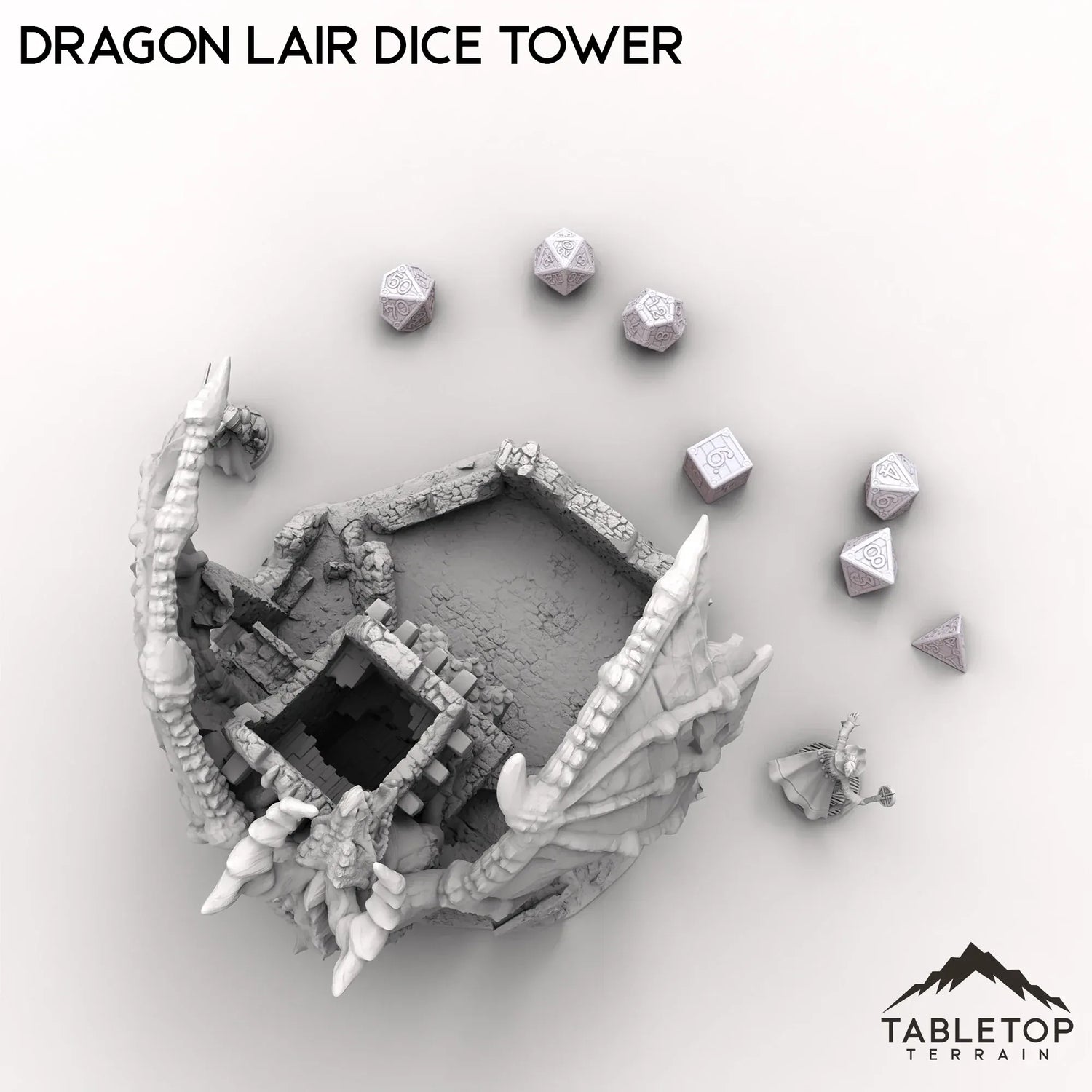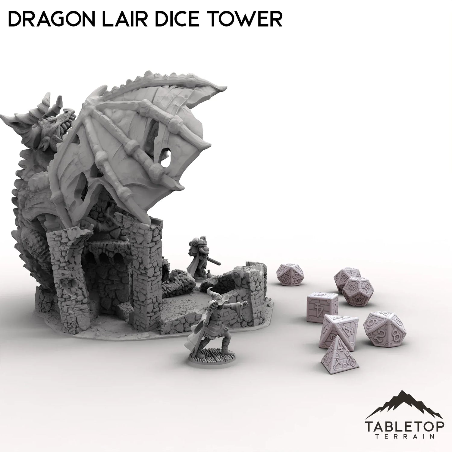 Der Würfelturm „Dragon Lair“ zeigt einen furchterregenden Drachen auf einer Burgruine. Die skulpturalen Details, von den Drachenschuppen bis zum umgebenden Mauerwerk, schaffen eine dramatische Atmosphäre für Ihre Tabletop-Abenteuer.