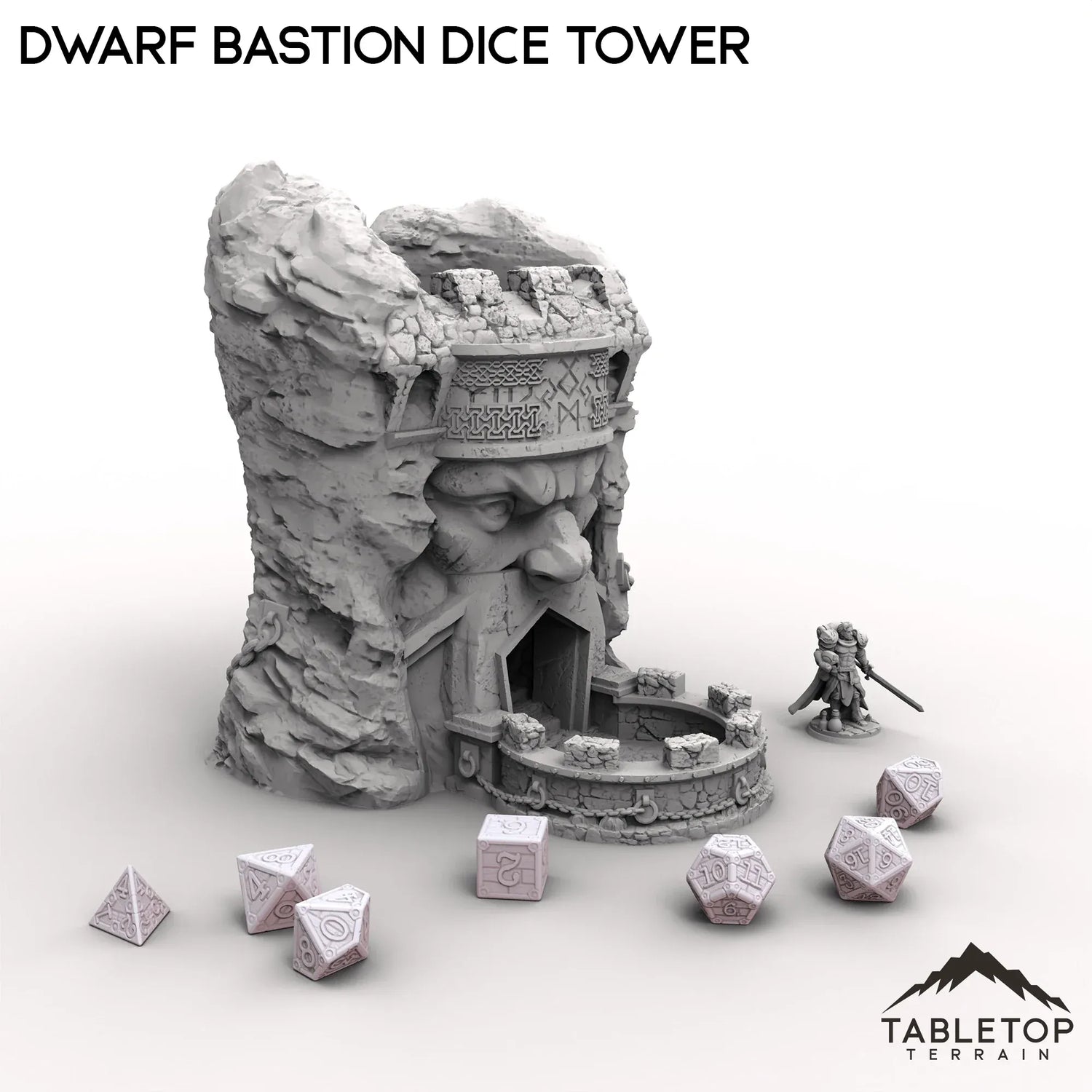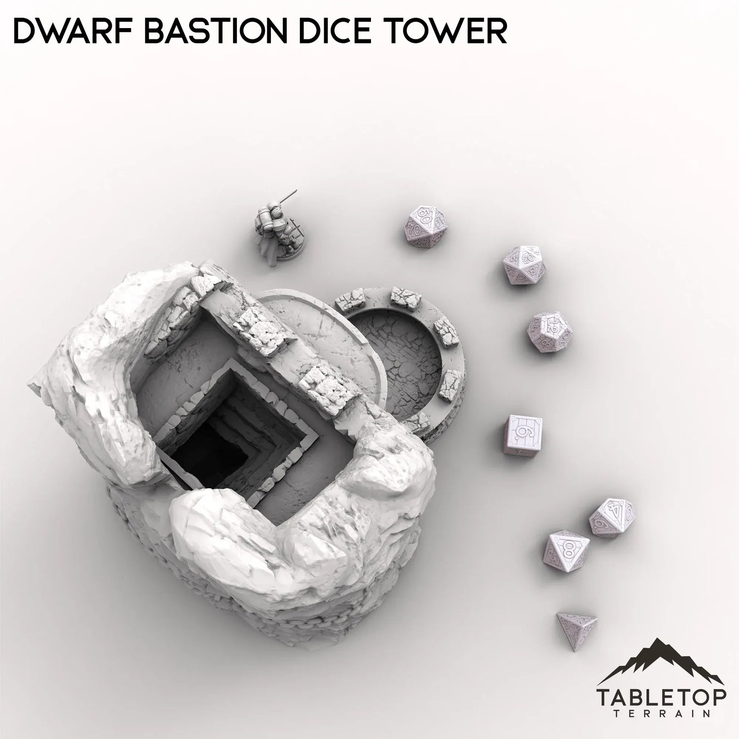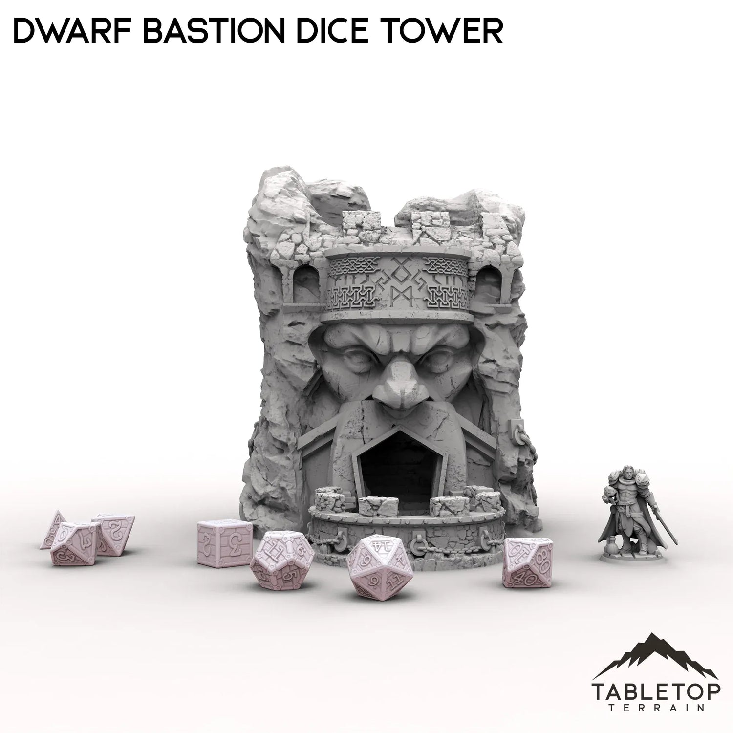 Ein robuster, aus Stein gebauter Würfelturm der Zwergenbastion erhebt sich mit dicken Mauern und eckigen Schnitzereien. Schwere Metallverstärkungen und Zwergenrunen zieren seine Oberfläche und zeugen von der Handwerkskunst meisterhafter Schmiede. Würfel purzeln von den oberen Zinnen und klappern wie Felsbrocken in einem Gebirgspass auf die untere Ebene.