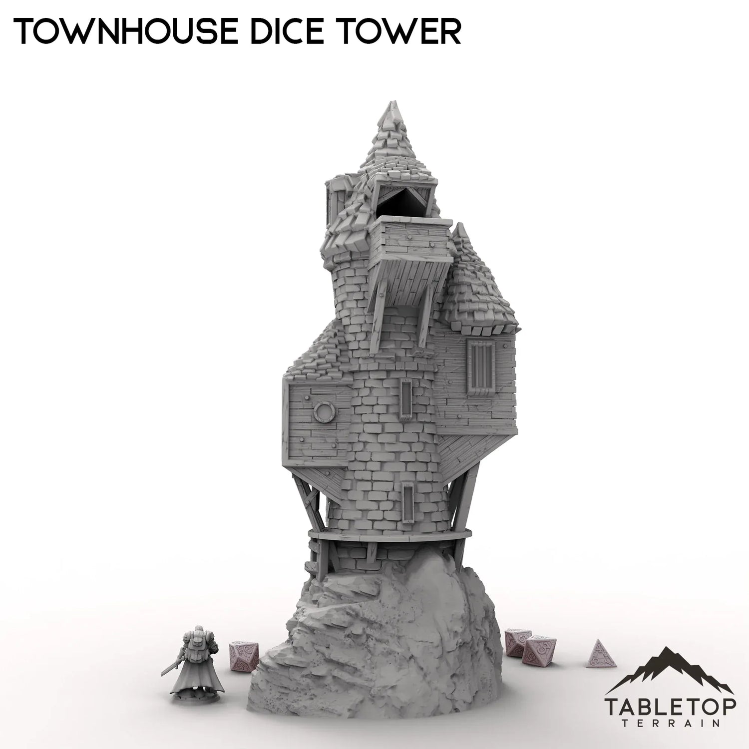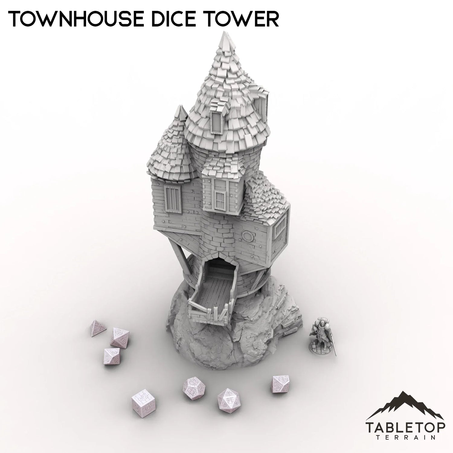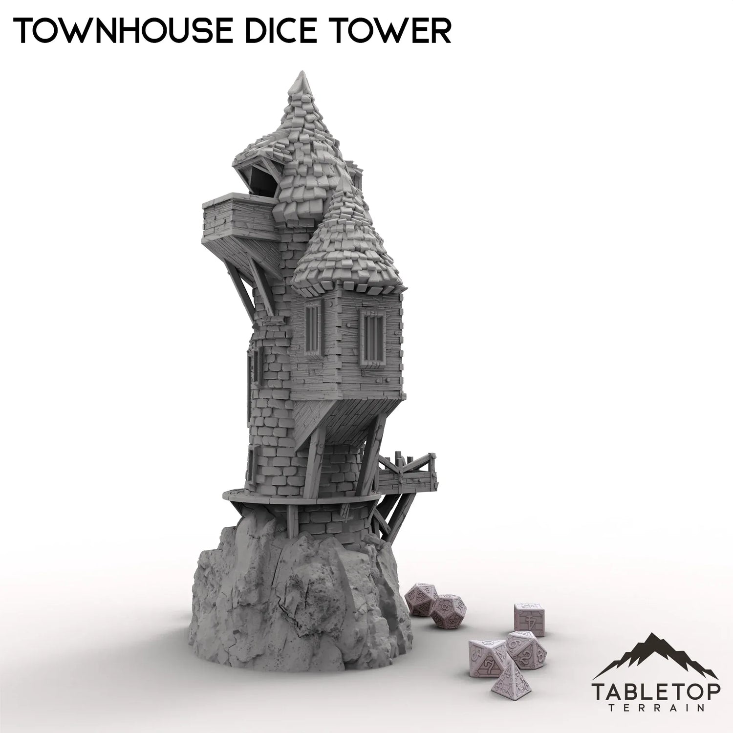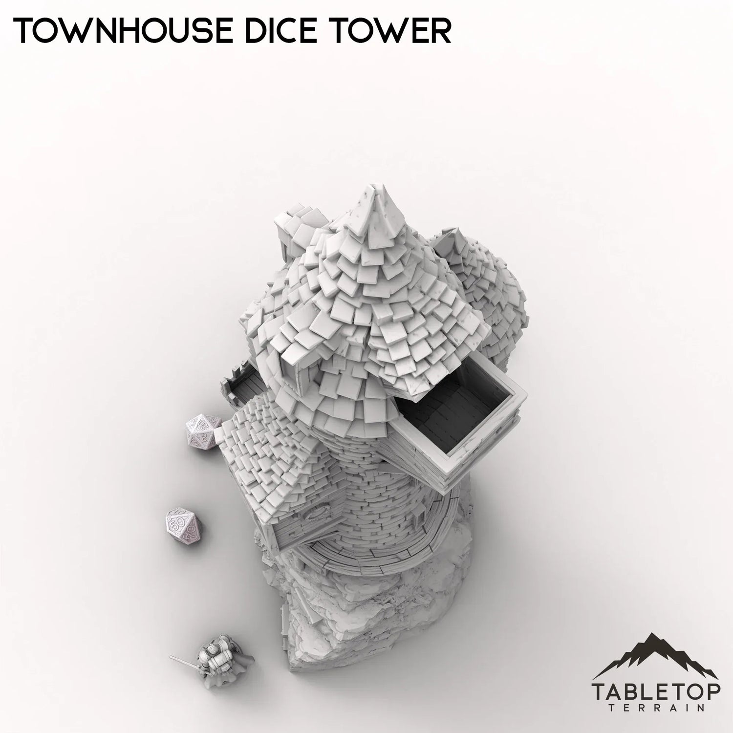 Dieser Würfelturm im Stadthausstil besticht durch sein skurriles, verzaubertes Design. Die Würfel werden auf das Dach geworfen, wo sie durch eine Reihe magischer Fenster und Wendeltreppen purzeln, bevor sie auf einen Balkon hinausrollen.