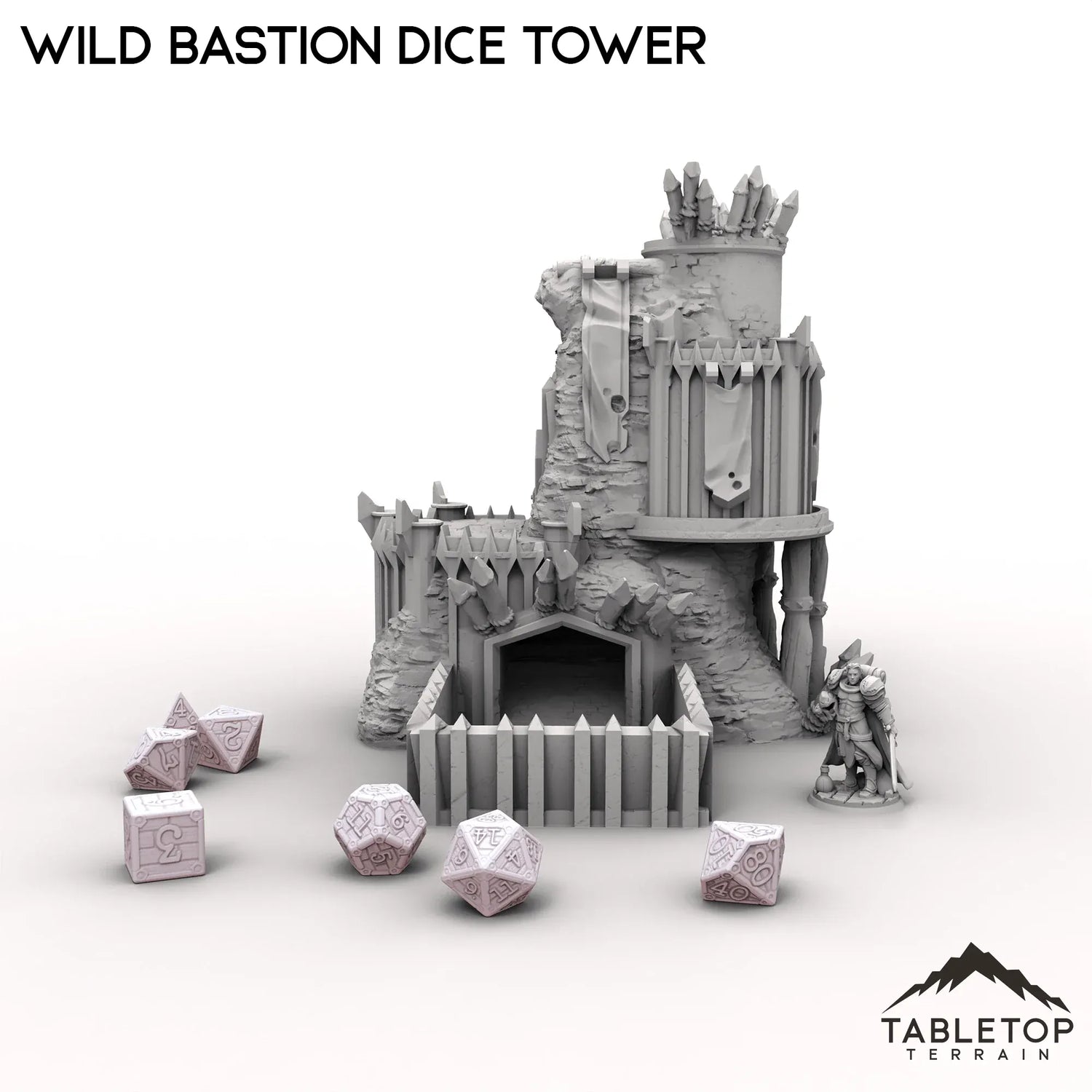 Der Wild Bastion Dice Tower erweckt den rauen Charme einer tief im Wald versteckten Festung. Würfel werden in die Spitze der Bastion geworfen, wo sie durch die Zinnen fliegen, bevor sie aus der Basis herauskommen.