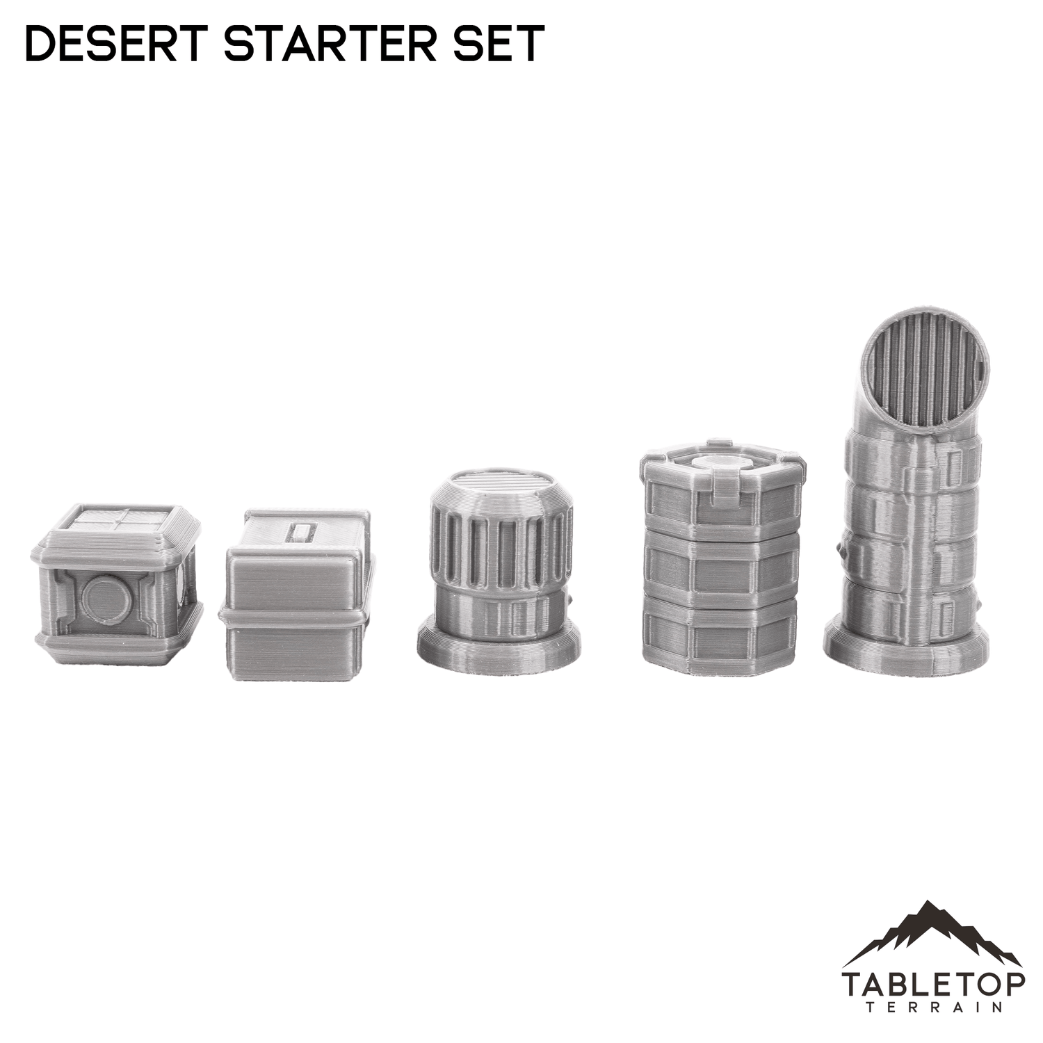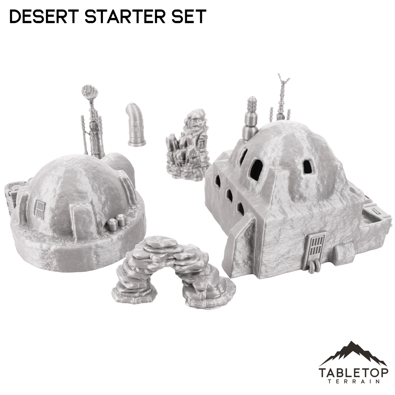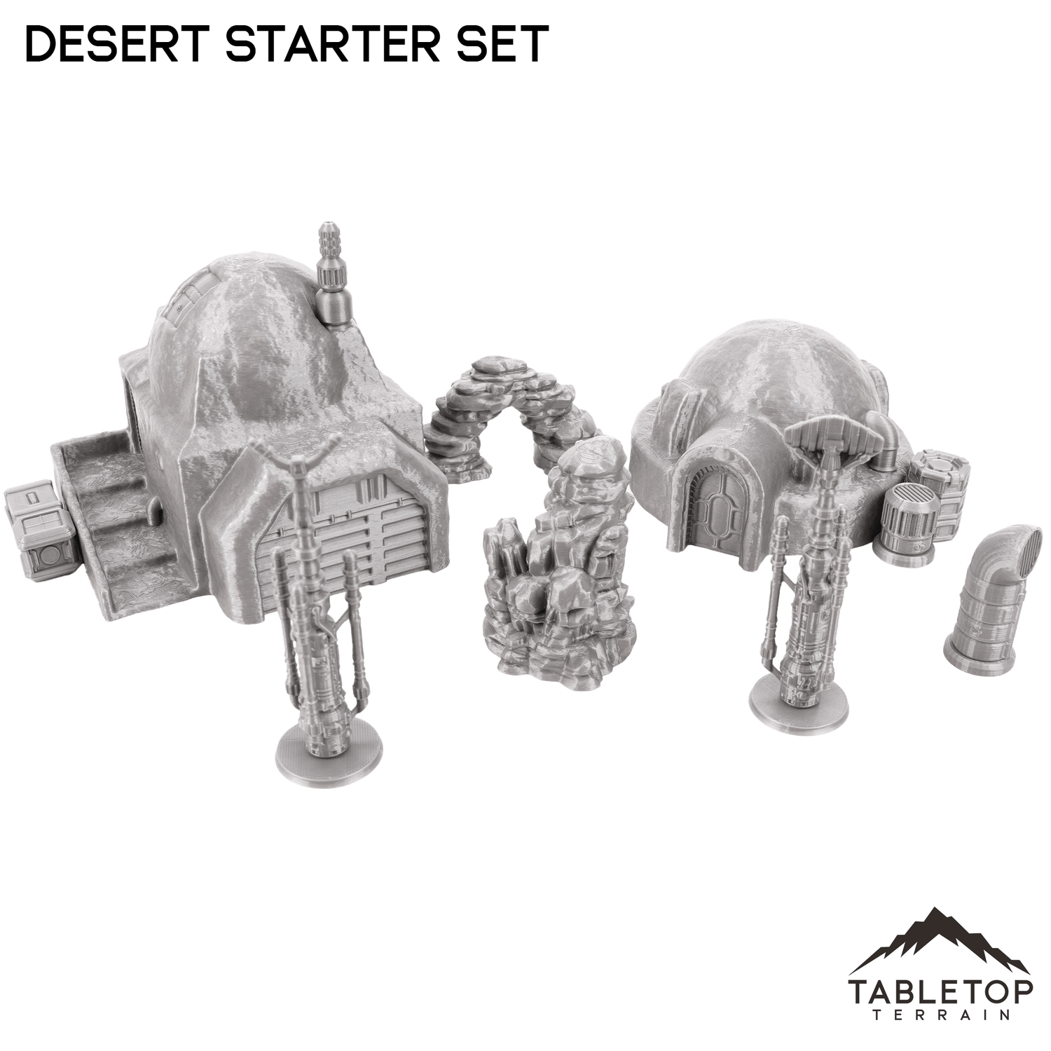 Dieses Desert Homestead Starter-Set enthält alles, was Sie brauchen, um mit Ihrem Wüstentisch zu beginnen oder Ihrer vorhandenen Ausstellung neues Flair zu verleihen. Es enthält zwei Lehmgebäude, zwei Stütztürme, ein kleines Streuset und zwei Wüstenfelsen.