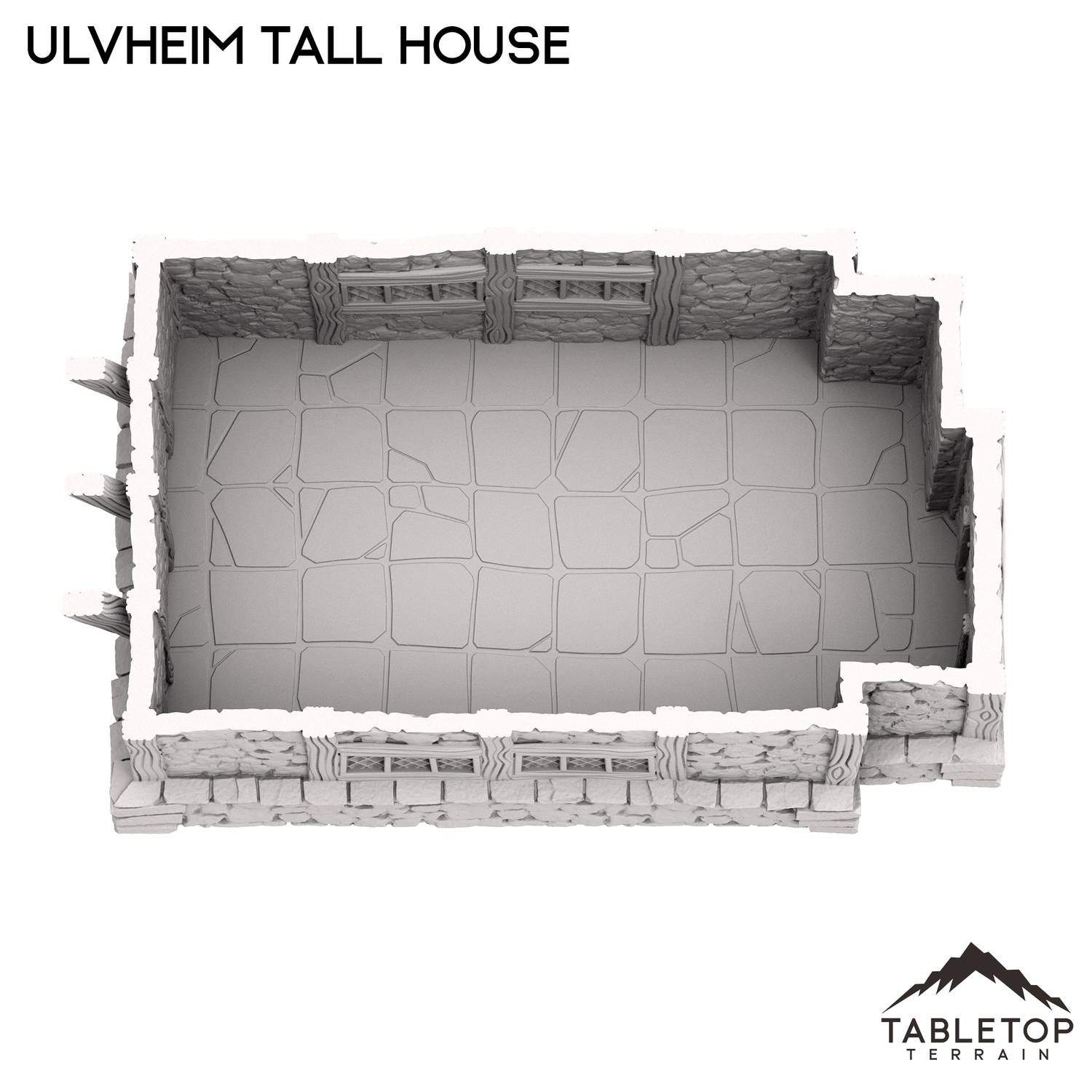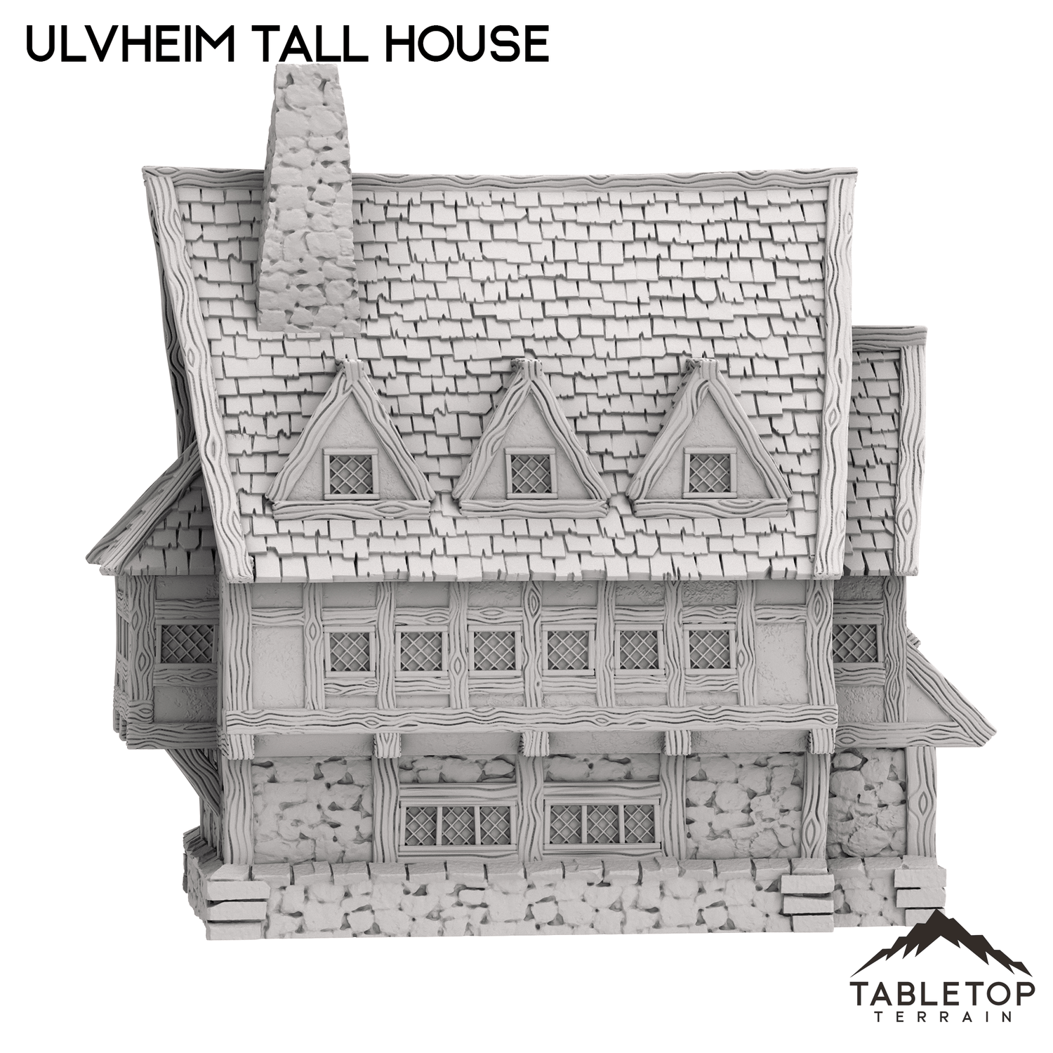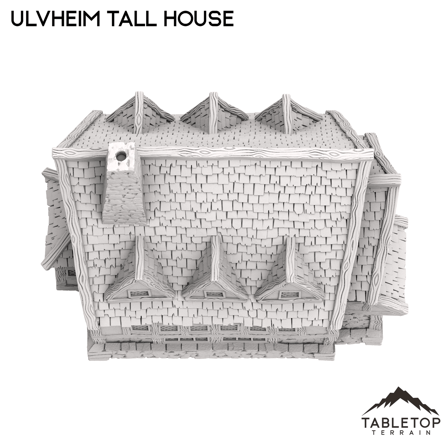 Das Ulvheim Tall House ist ein zweistöckiges mittelalterliches Steinhaus mit einem hohen Dachgaubendach. Jede Etage ist abnehmbar, damit die Miniaturen darin platziert werden können, und kann entweder mit Stapelstiften oder Magneten befestigt werden.