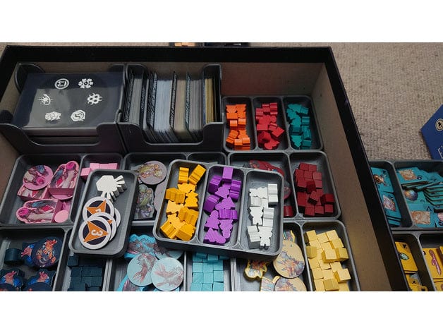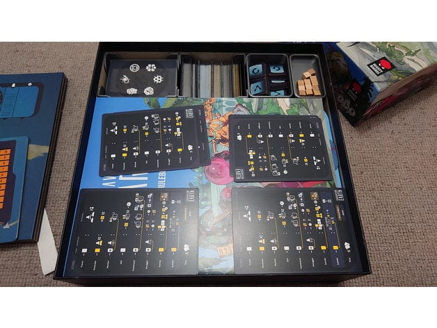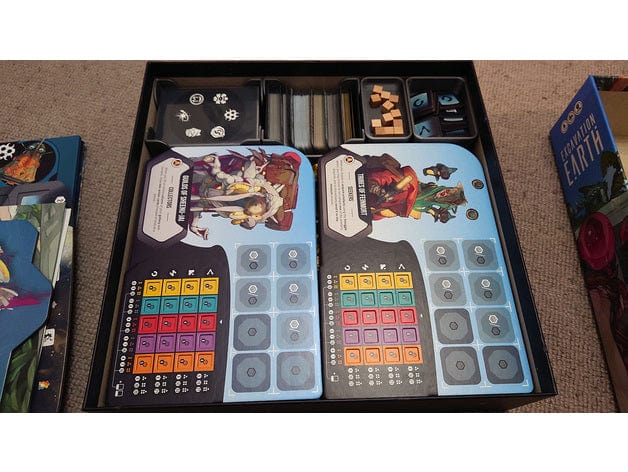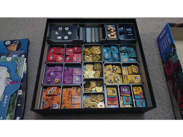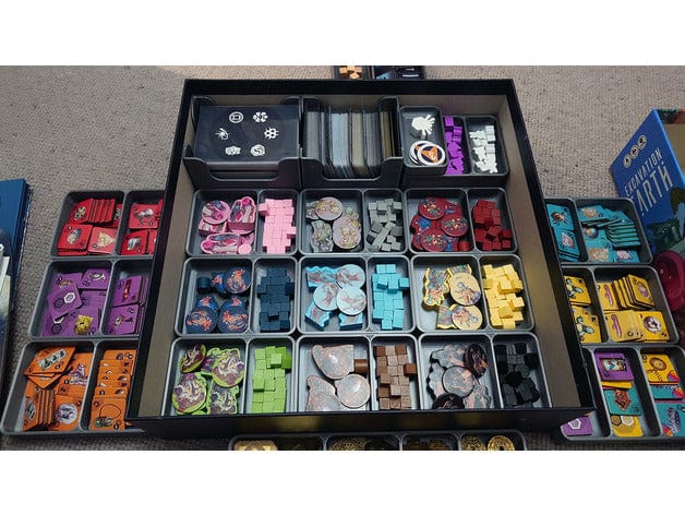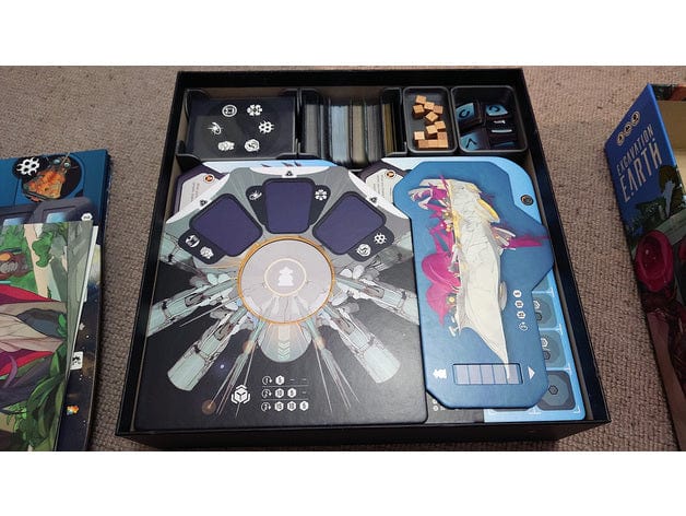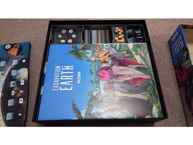 Dies ist ein 3D-gedruckter Einsatz für das Brettspiel Excavation Earth, einschließlich der Erweiterungen Second Wave und It Belongs In A Museum (einschließlich der Promos Oooh, Pretty Boxes und Junk Metal). Er ist so konzipiert, dass alles in der Hauptbox zusammengefasst werden kann.