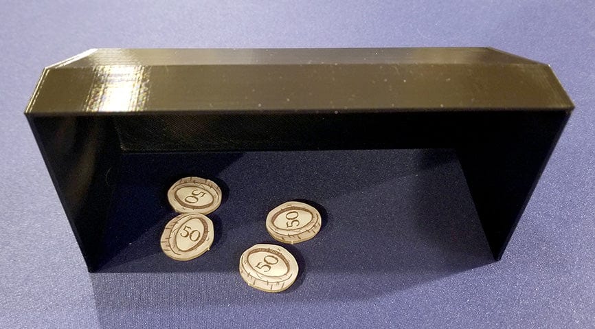 Ich habe mich entschieden, den Einsatz aufzuwerten, indem ich den Originalkarton entferne und den zusätzlichen Platz nutze, um einige Spielerschilder unterzubringen. Ich war es WIRKLICH leid, herauszufinden, was jede Münze wert ist. Mit den Schildern können Sie die Informationen als versteckte Information behalten, aber trotzdem den Wert jeder Münze sehen.