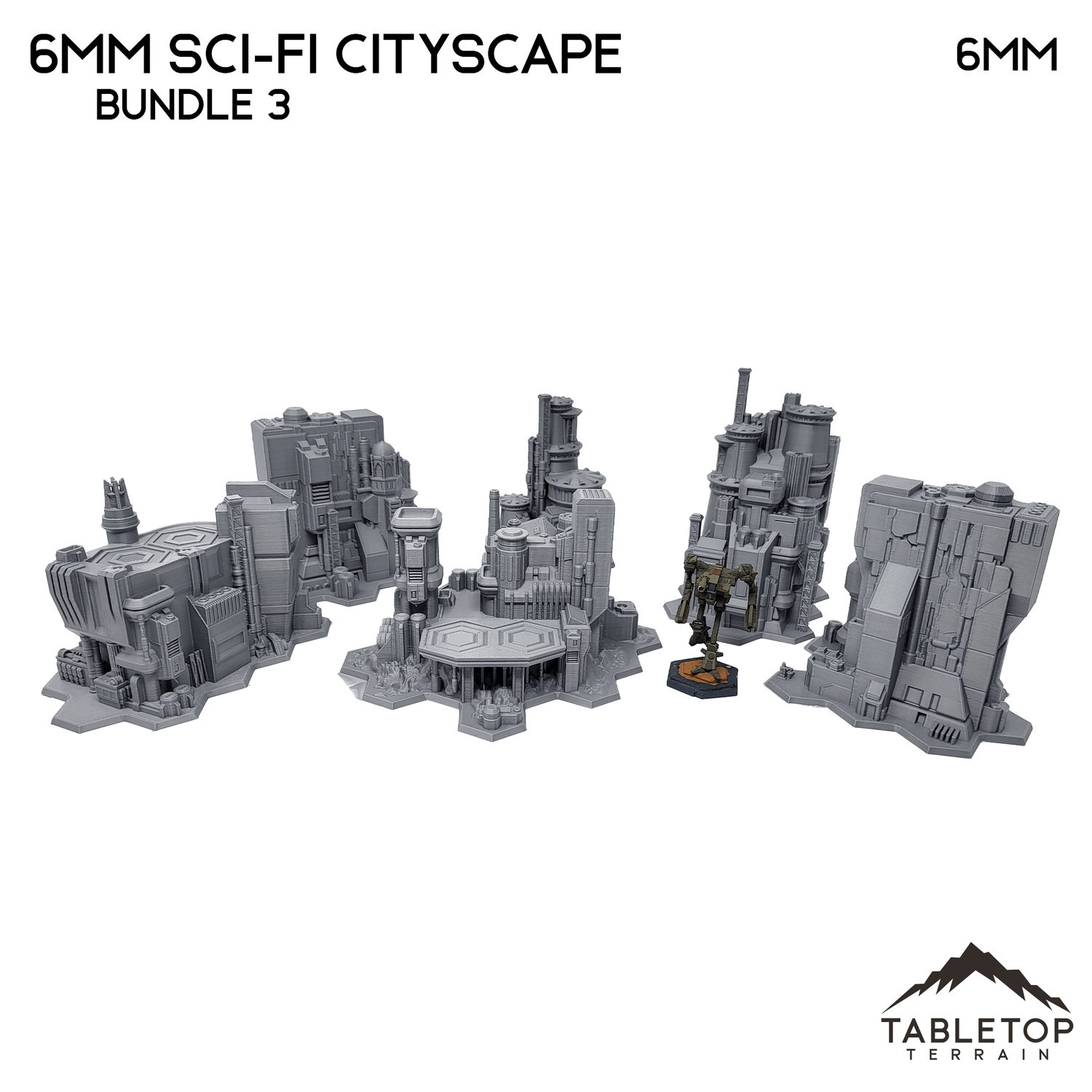 A set of 6 6mm Sci-Fi Cityscape buildings. You can choose to have them come with or without hexes. It would work great in any 6mm mech scale tabletop wargame.