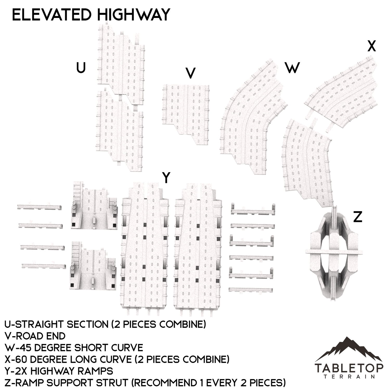 Consisting of a series of two and four lane surface roads and a raised six lane highway system, the lengths and angles of the included pieces integrate with the City Blocks to provide a foundation for your city structures.