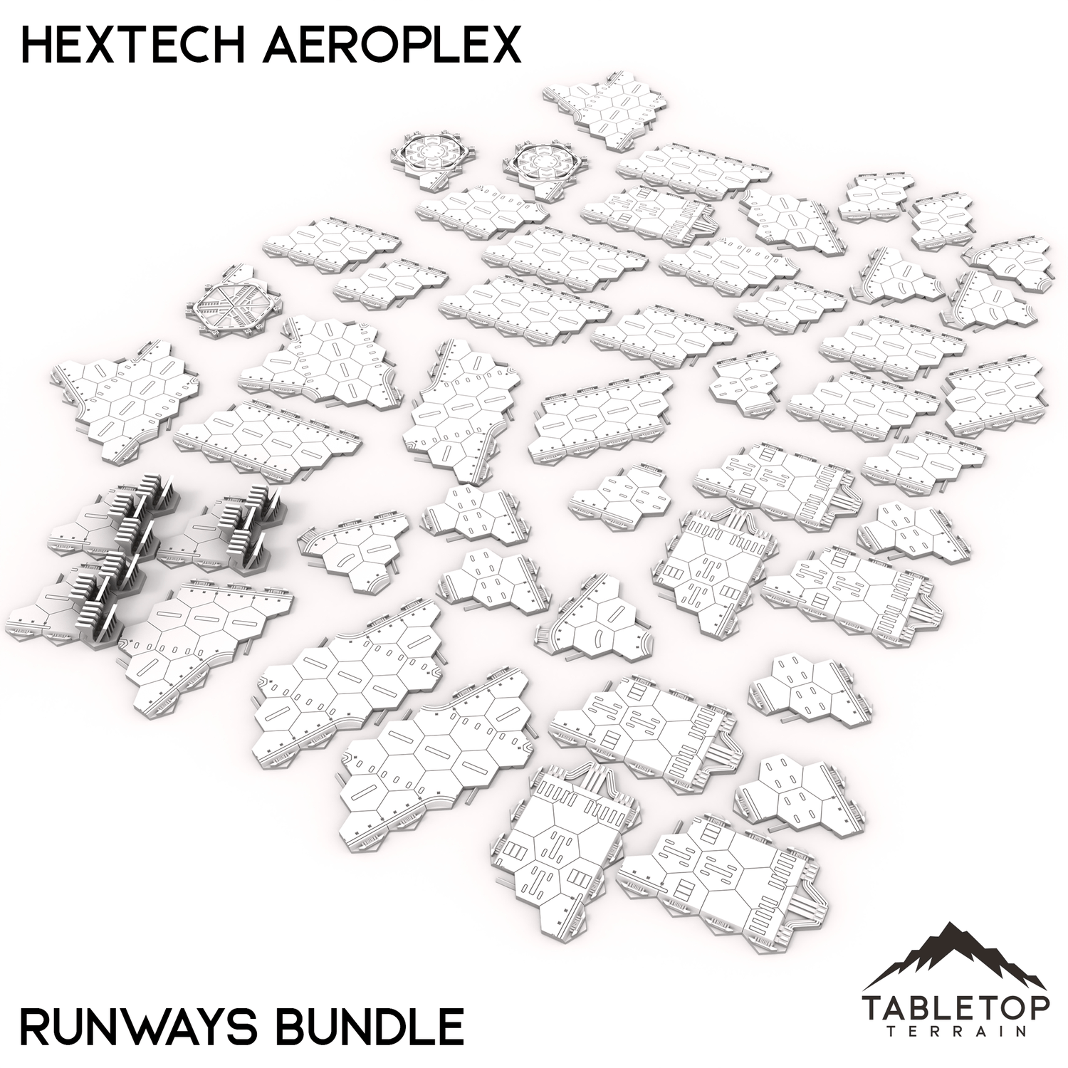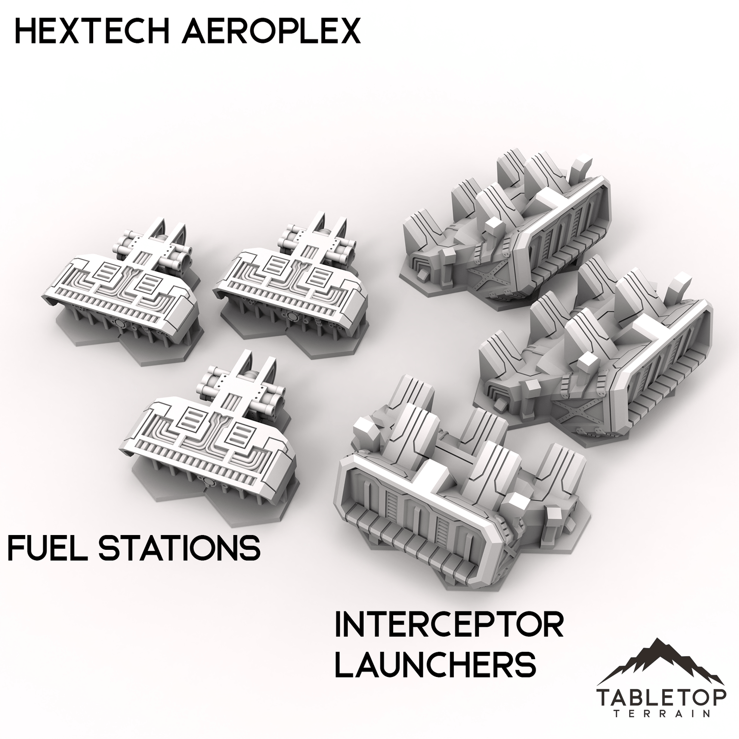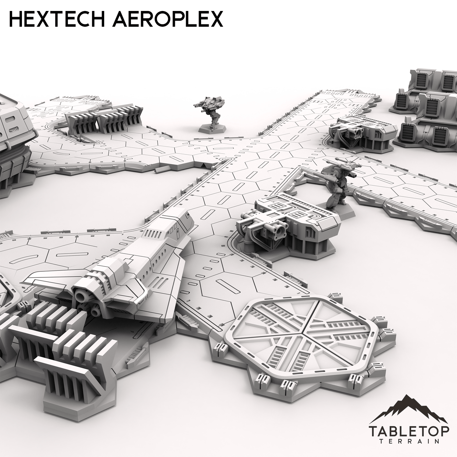 HEXTECH Aeroplex Center is a collection of buildings and runways for creating an immersive air and space center for 6mm-scaled tabletop games. The collection can but bought part-by-part, or in a few different bundles that come with a discount built-in. The styling of the Aeroplex set is made to match the look and feel of the Trinity City collection, allowing for massive combinations for a sprawling city. The "Fuel Stations" item in this collection have connections that match the pipes from both the "Power Complex" and "Industrial Fluidworks" collections on our store if you'd like to connect them to the Aeroplex.