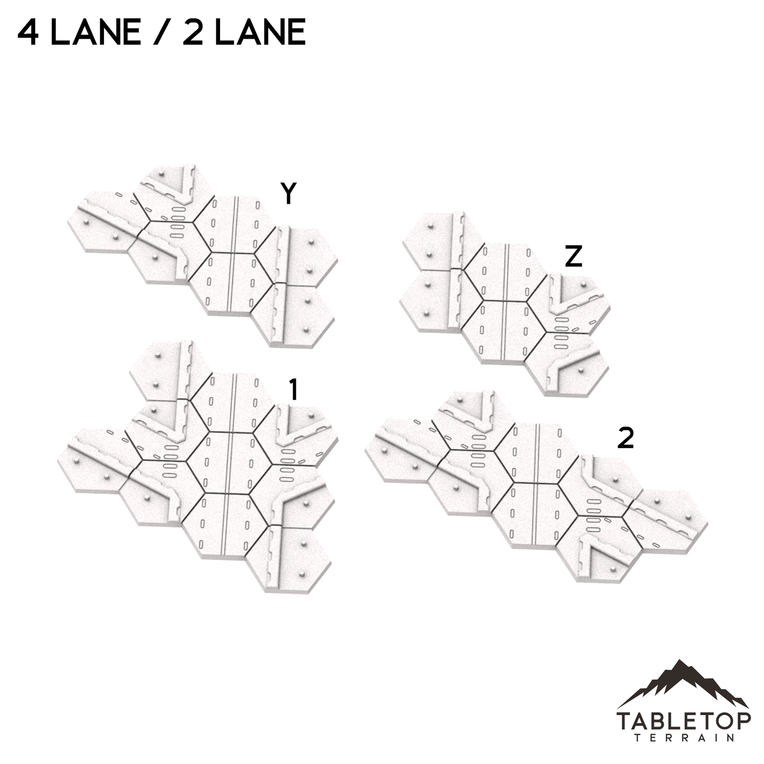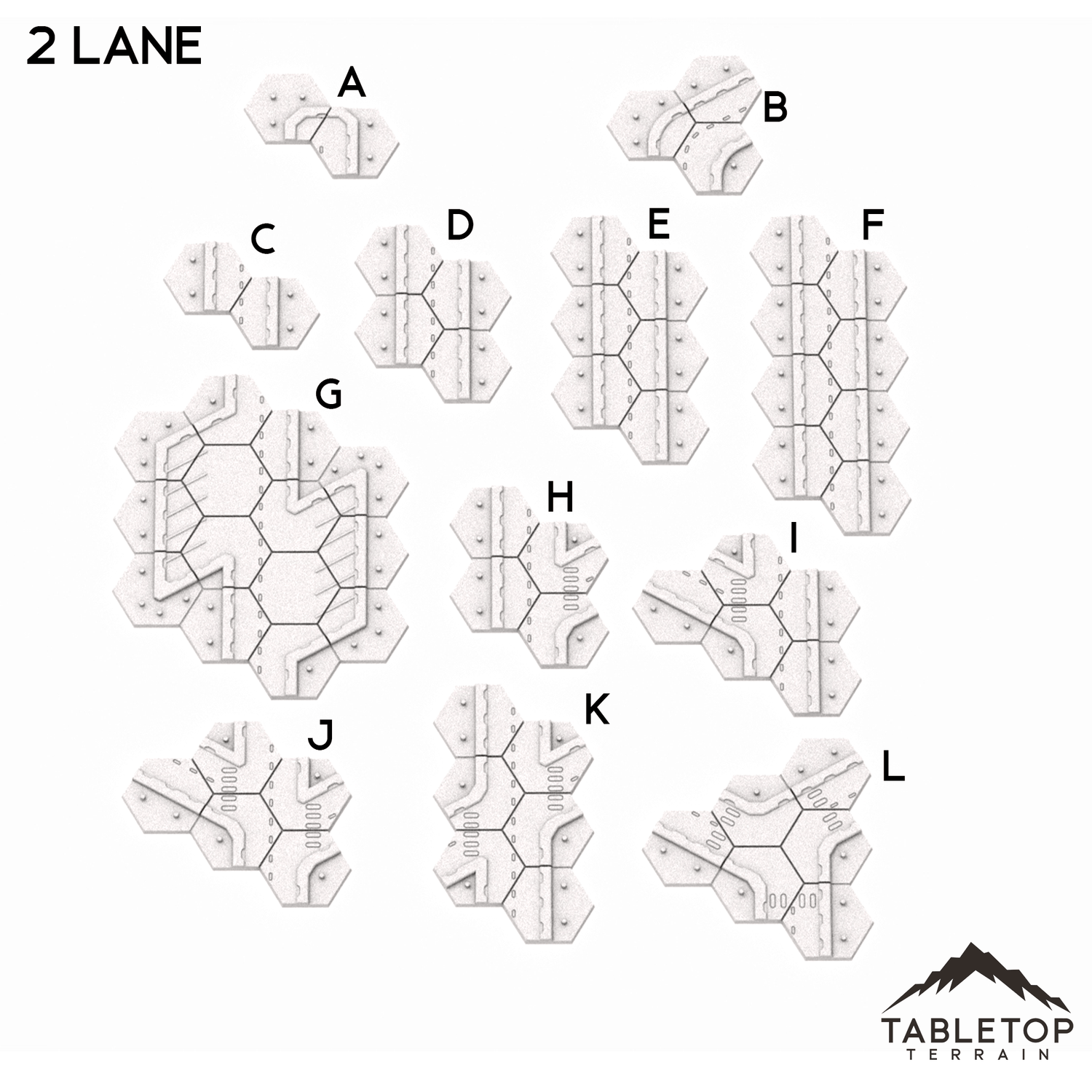 Available in both two and four lane formats (2 and 3 hexes wide respectively) along with intersections that allow you to connect them.