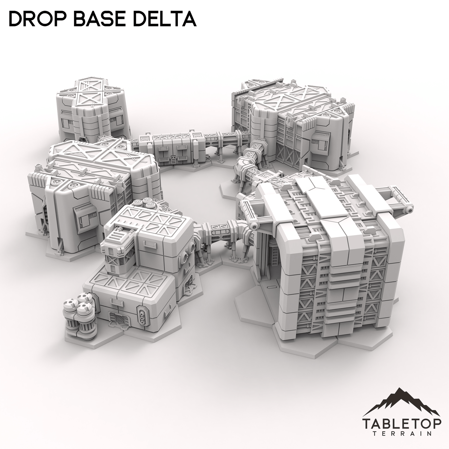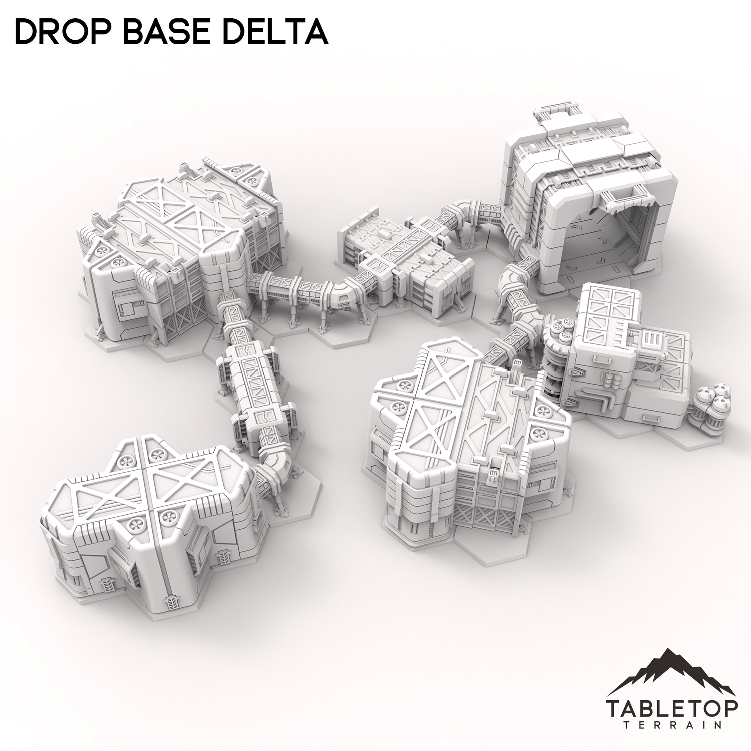 HEXTECH Drop Base Delta is a set of prefab buildings, including personnel quarters and power supply. The set includes corridors for attached the buildings in any way you need for your tabletop. The styling of the Drop Base Delta set is made to match the look and feel of the Trinity City collection as well.