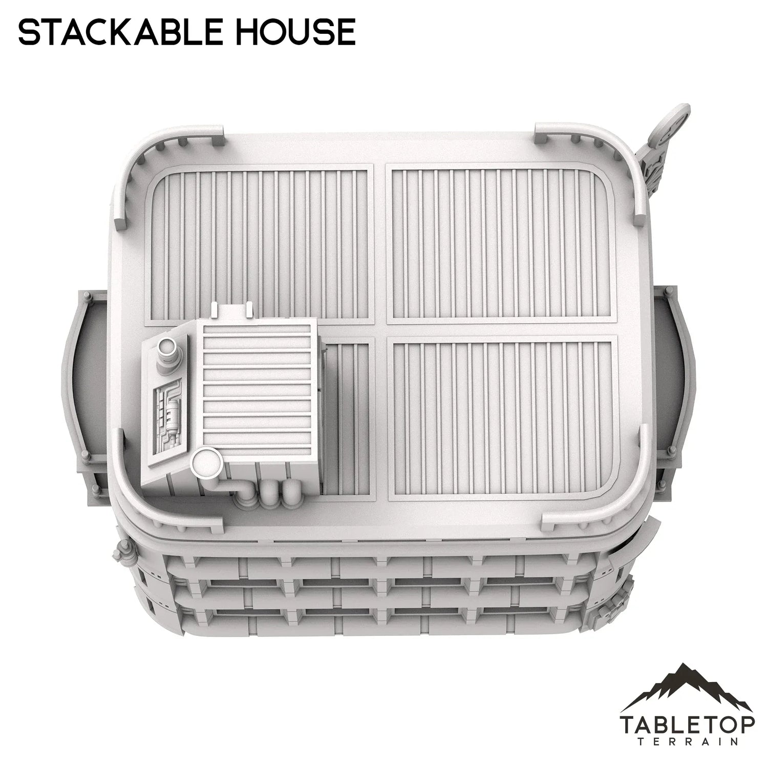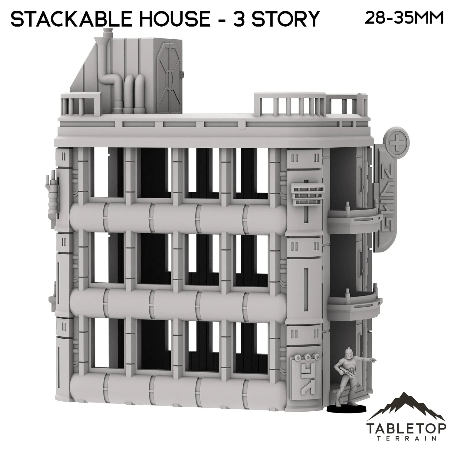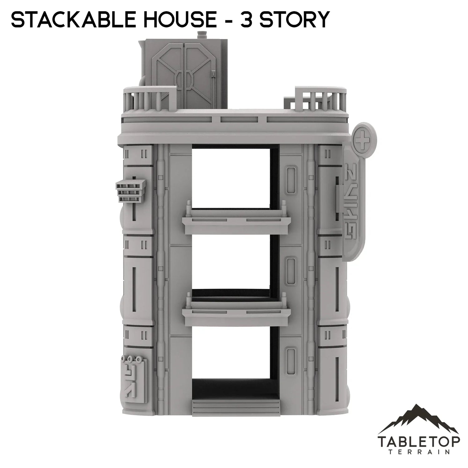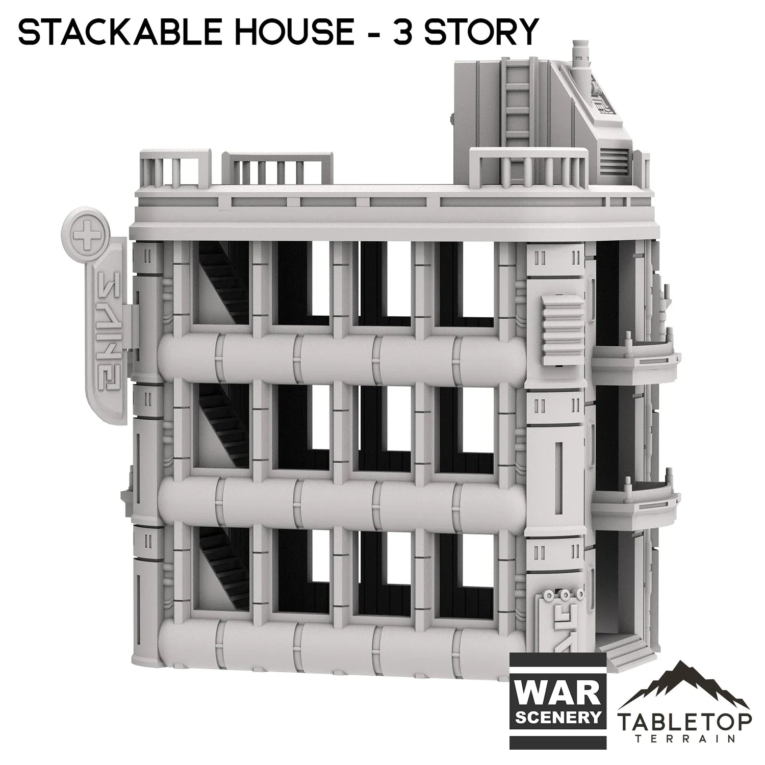 The Stackable House is a fully modular apartment set for sci-fi tabletop gaming. Each set includes three attachable signs, attachable speaker, generator, antenna, exterior balconies for the upper floors, and ramps for the lower floor. The sets are sold in 3-floor variants and 4-floor variants. If desired, the sets can be combined to make much larger buildings for towering city skylines. The Stackable House set is made for sci-fi tabletop games, but could work with any genre.