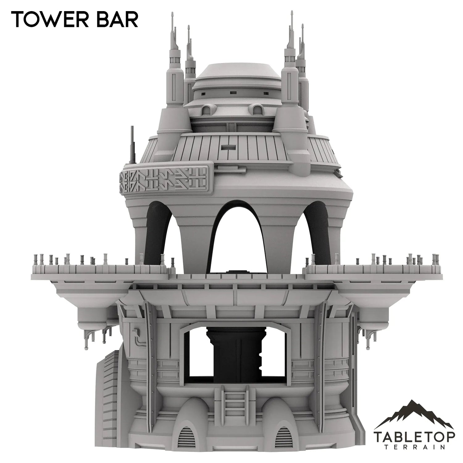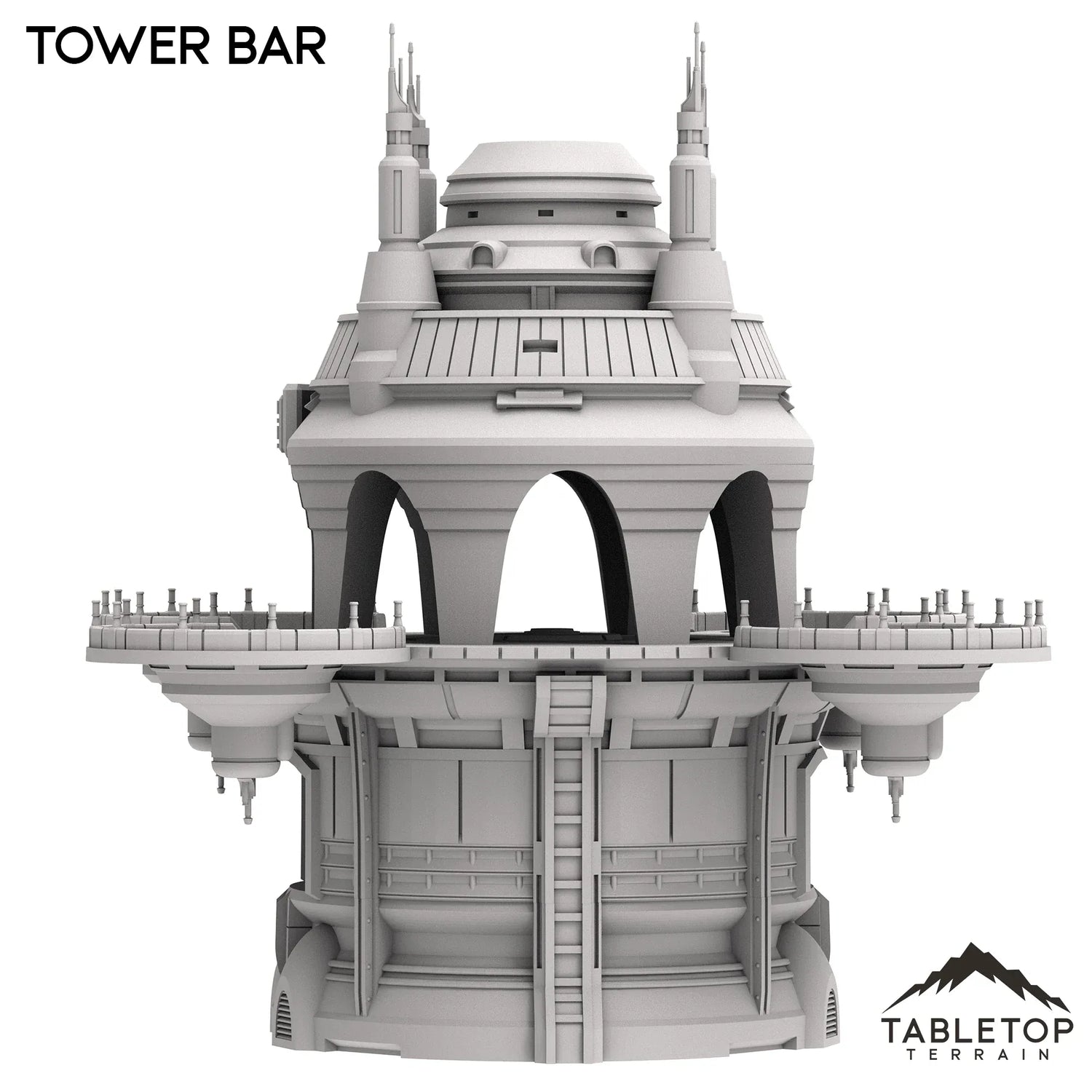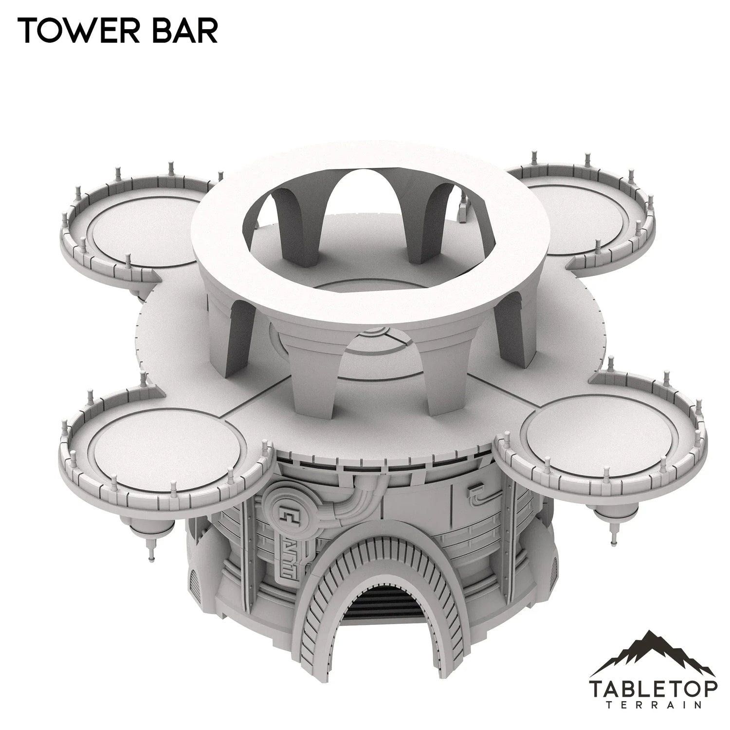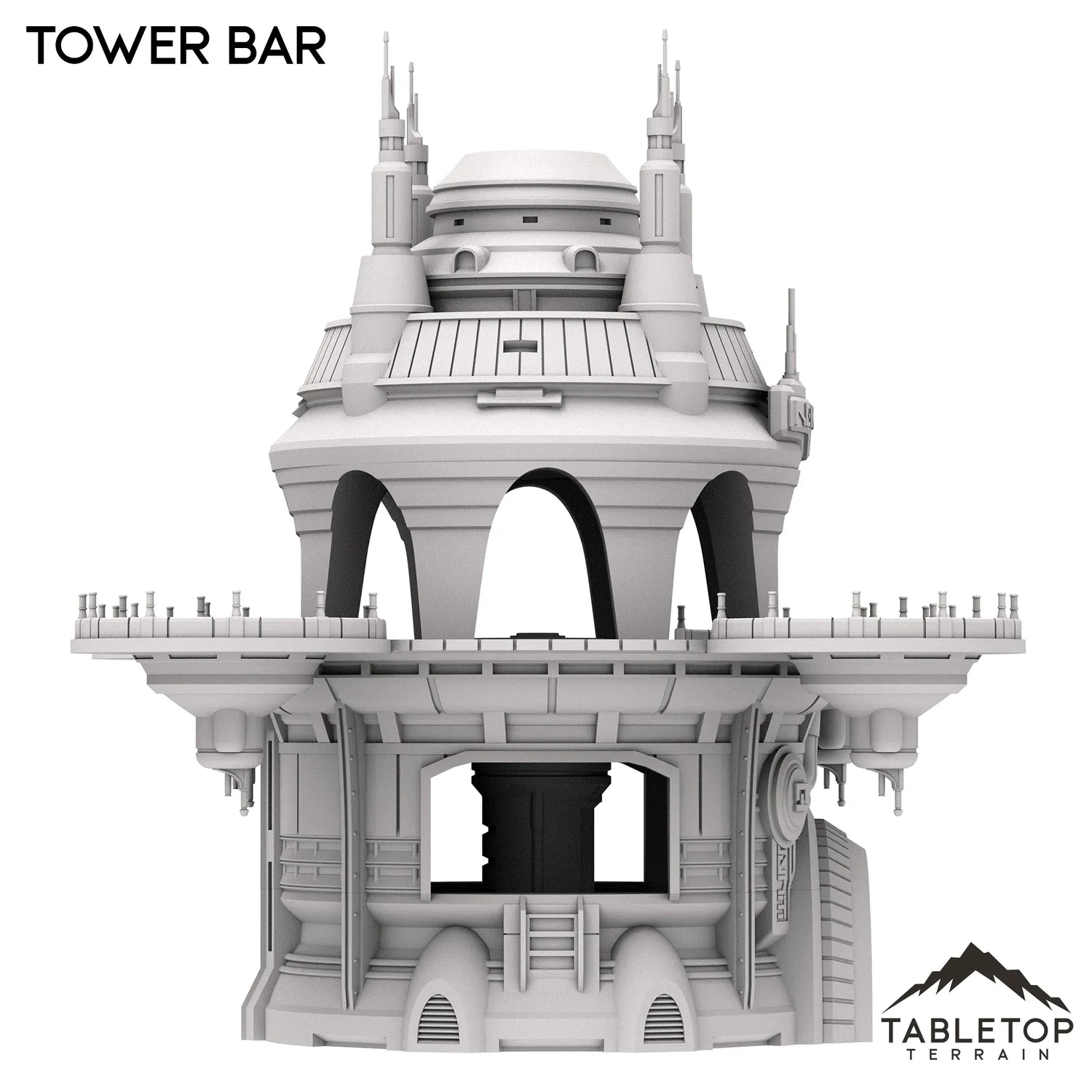 The Tower Bar is a large multi-story building, with a useable interior bottom floor and a top floor with circular balconies. The building is made to be large enough to fit a good number of minis at any given time, and the open-style design allows for easy access and usability in play. The Tower Bar is made for sci-fi tabletop games, but could work with any genre.