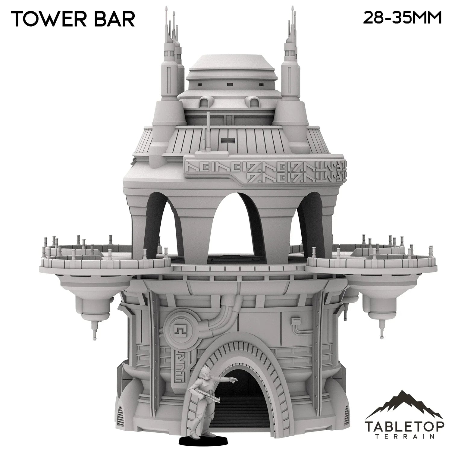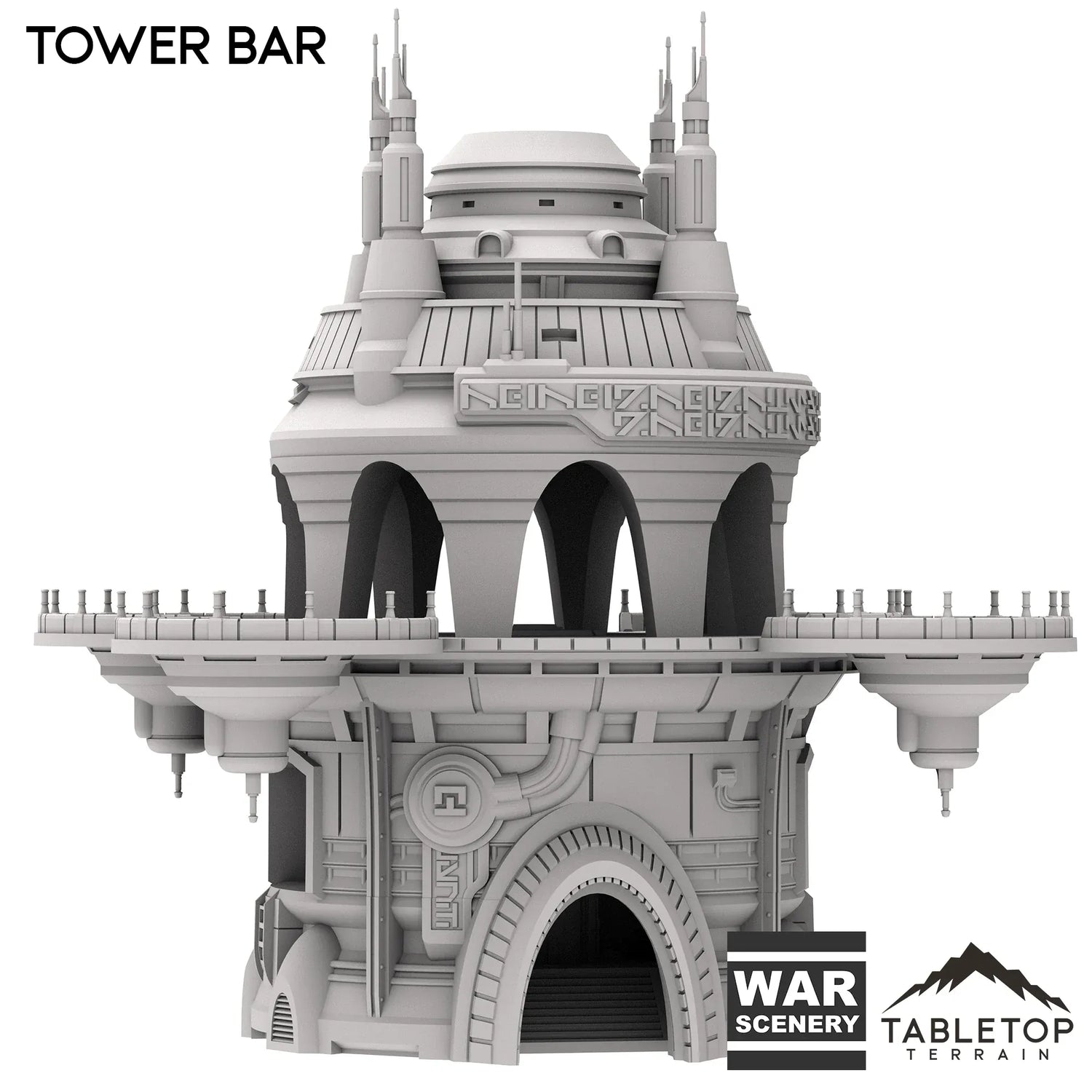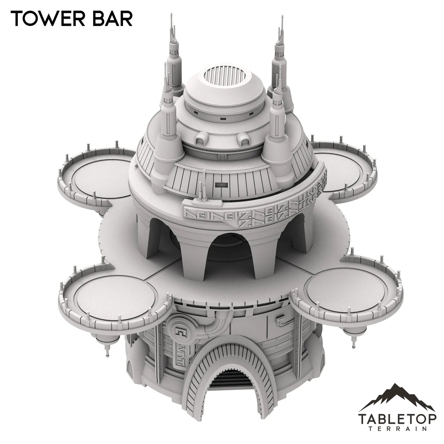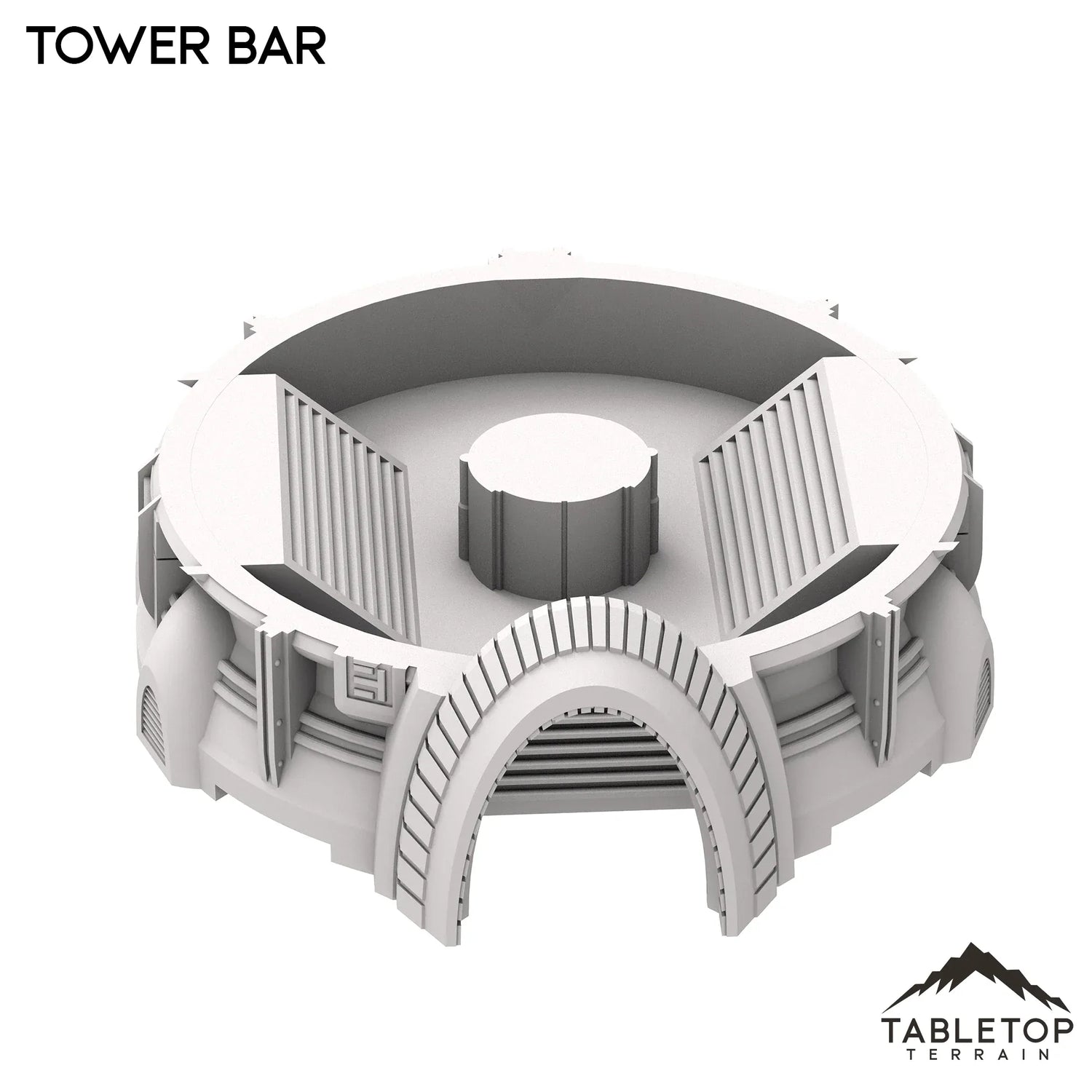 The Tower Bar is a large multi-story building, with a useable interior bottom floor and a top floor with circular balconies. The building is made to be large enough to fit a good number of minis at any given time, and the open-style design allows for easy access and usability in play. The Tower Bar is made for sci-fi tabletop games, but could work with any genre.