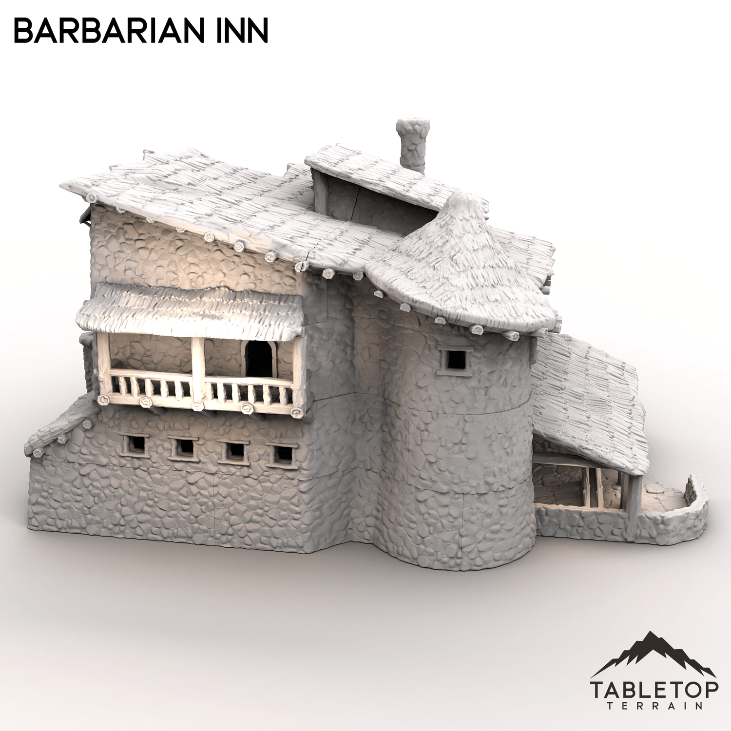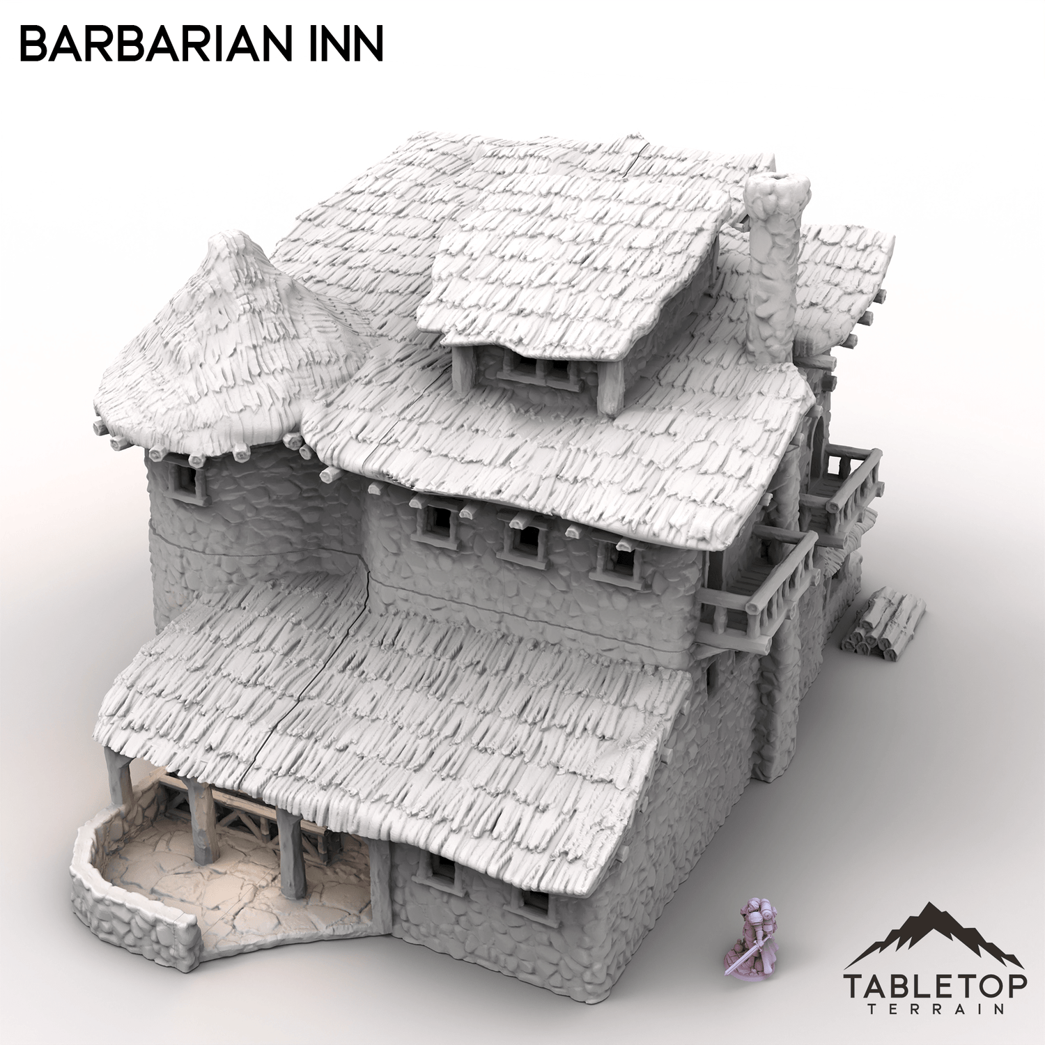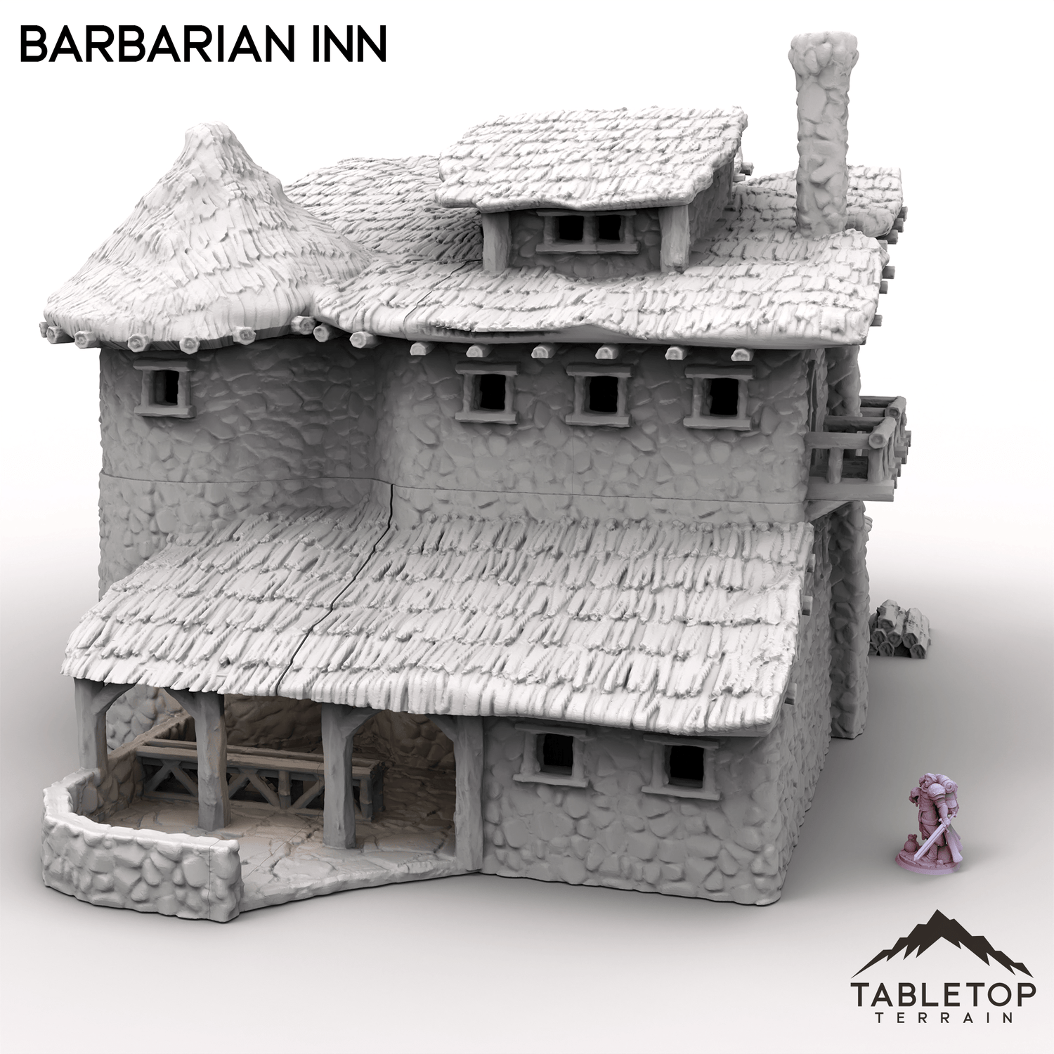 This rugged Barbarian Inn is built from thick stone and heavy timbers, with rough-hewn walls and a steep, sloped roof suitable for harsh northern climates. A prominent chimney and upper balcony offer opportunities for warmth and stories shared over strong drink. Ideal as a wilderness outpost or mountain stronghold tavern, this "barbari-inn" offers a perfect rest stop for adventurers braving the frontier .