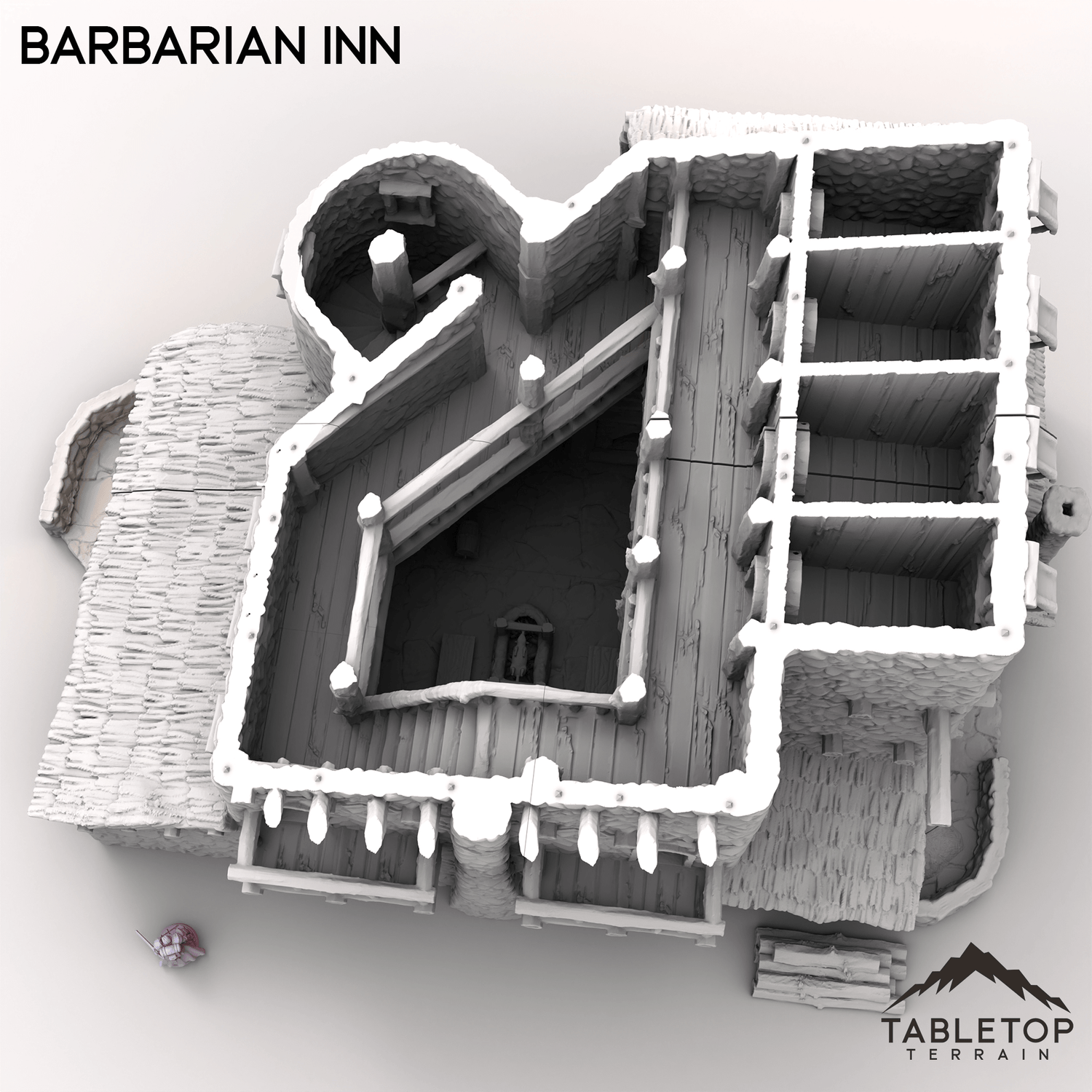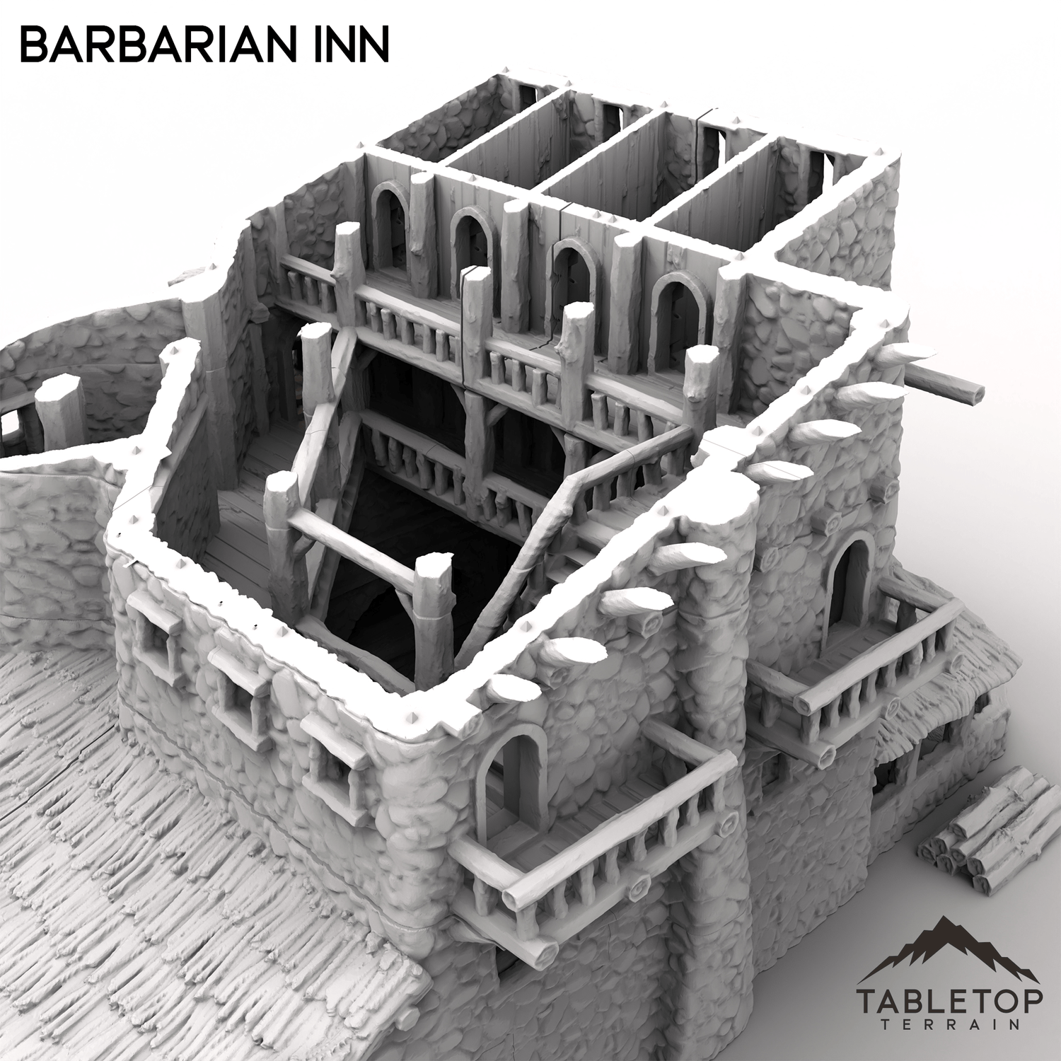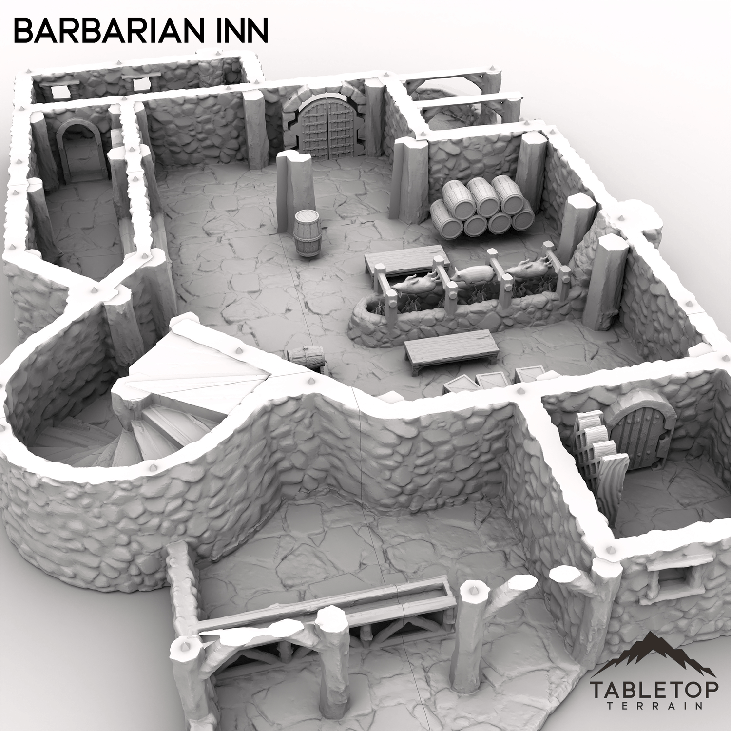 This rugged Barbarian Inn is built from thick stone and heavy timbers, with rough-hewn walls and a steep, sloped roof suitable for harsh northern climates. A prominent chimney and upper balcony offer opportunities for warmth and stories shared over strong drink. Ideal as a wilderness outpost or mountain stronghold tavern, this "barbari-inn" offers a perfect rest stop for adventurers braving the frontier .