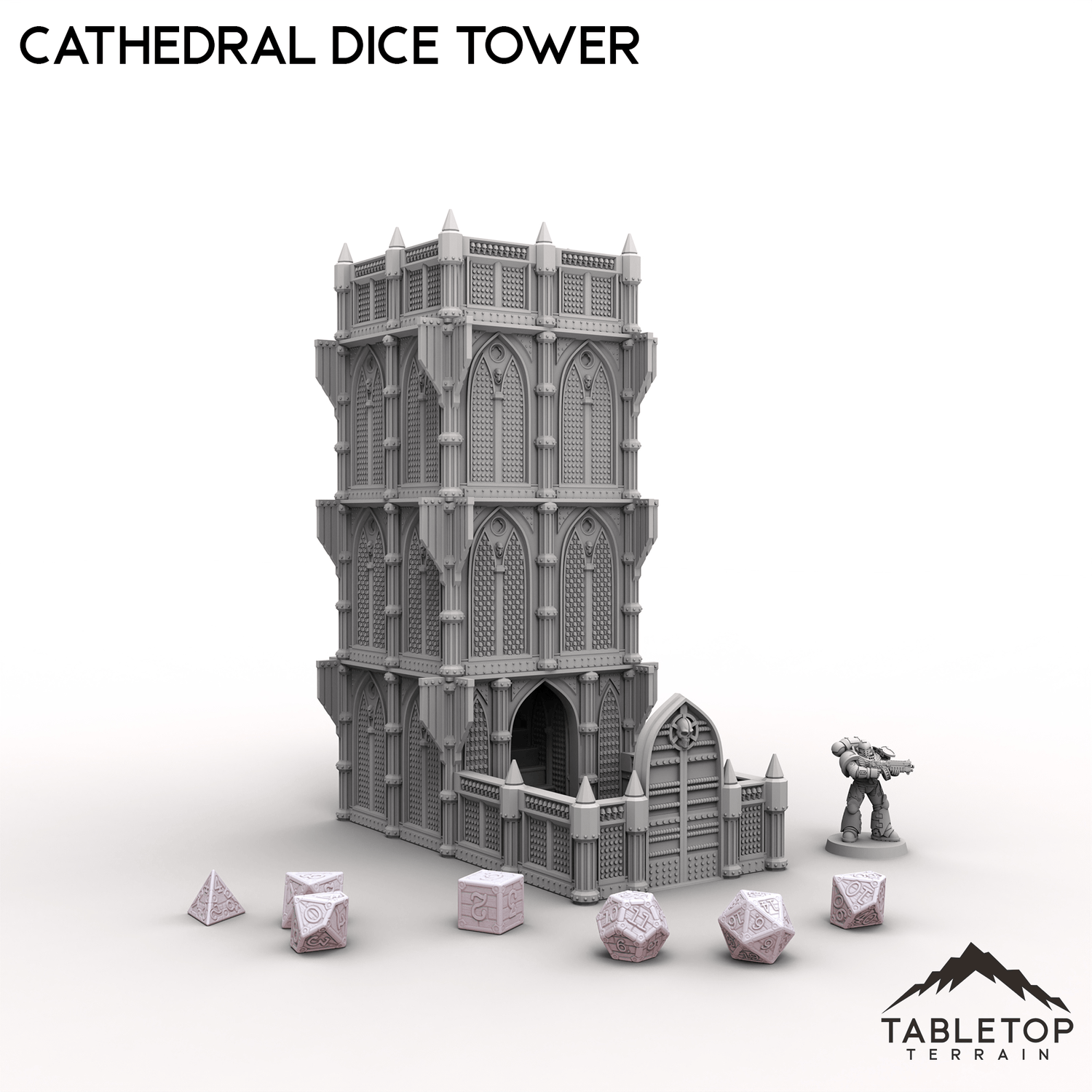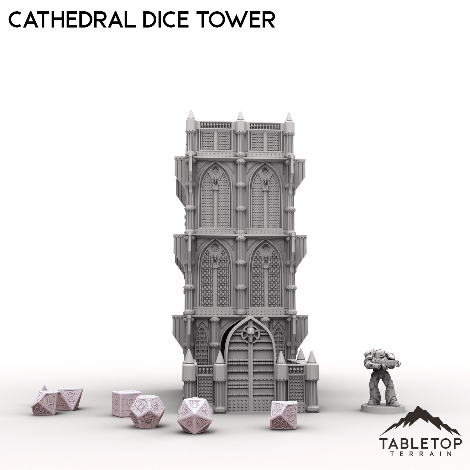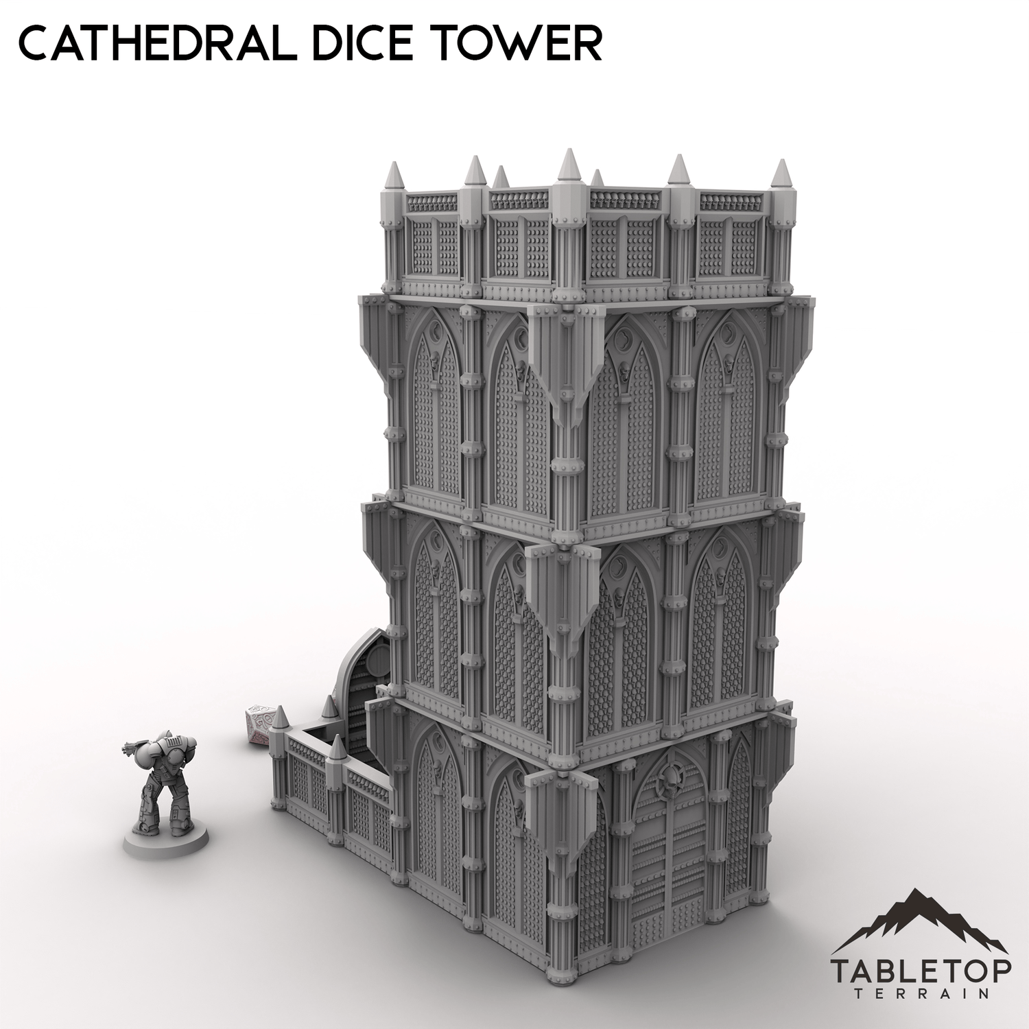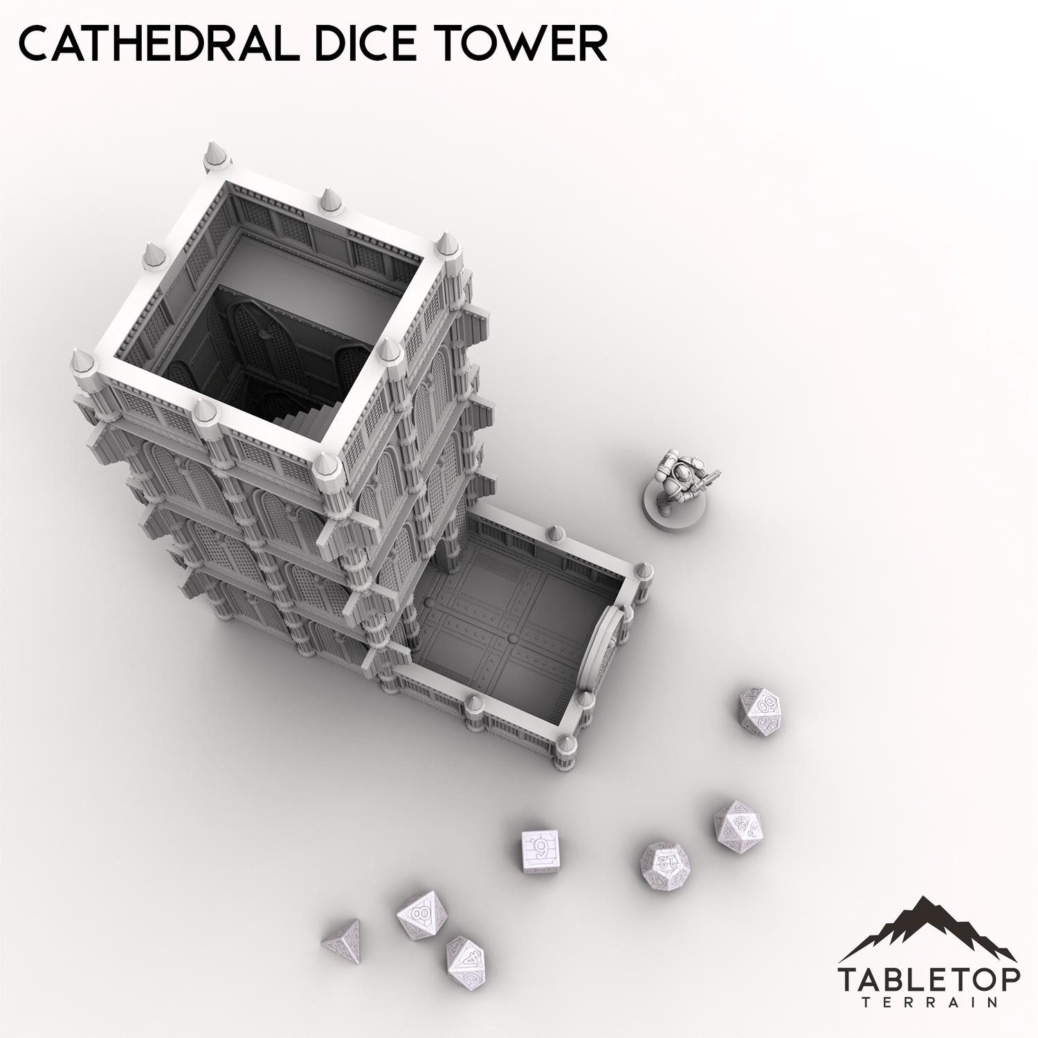 This gothic Cathedral Dice Tower stands tall with reinforced walls, arched windows, and riveted plating. Built for both style and function, it sends dice tumbling through its layered interior, before coming to rest in the walled courtyard below.
