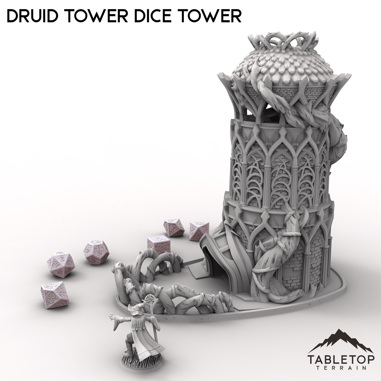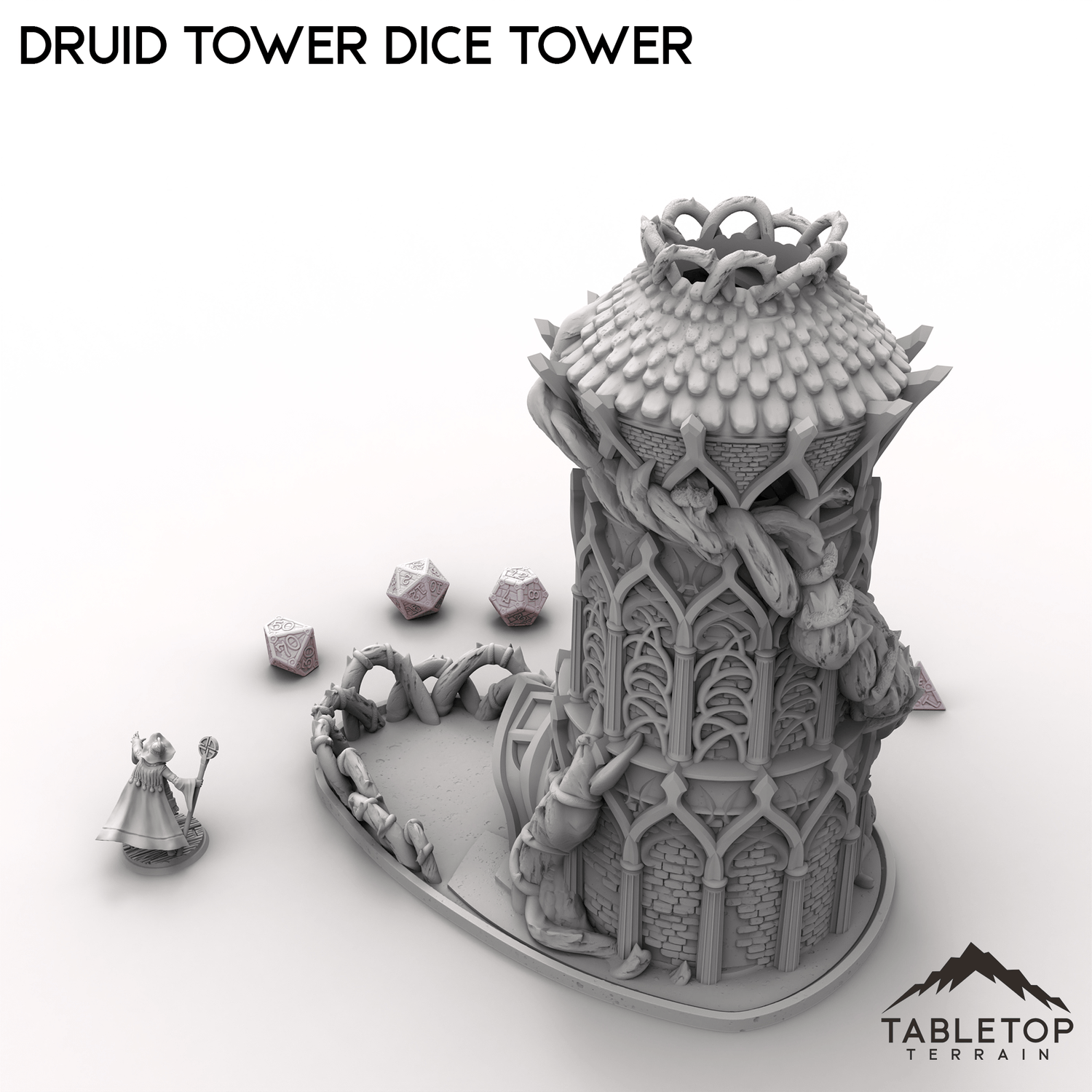 A tall, twisting Druid Tower Dice Tower of wood and stone stands covered in vines and moss. Carved runes line its surface, glowing faintly with old magic. Dice roll down through the central tower, landing amongst the vines at its base.