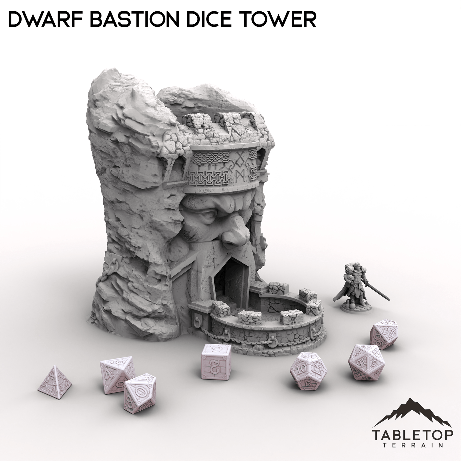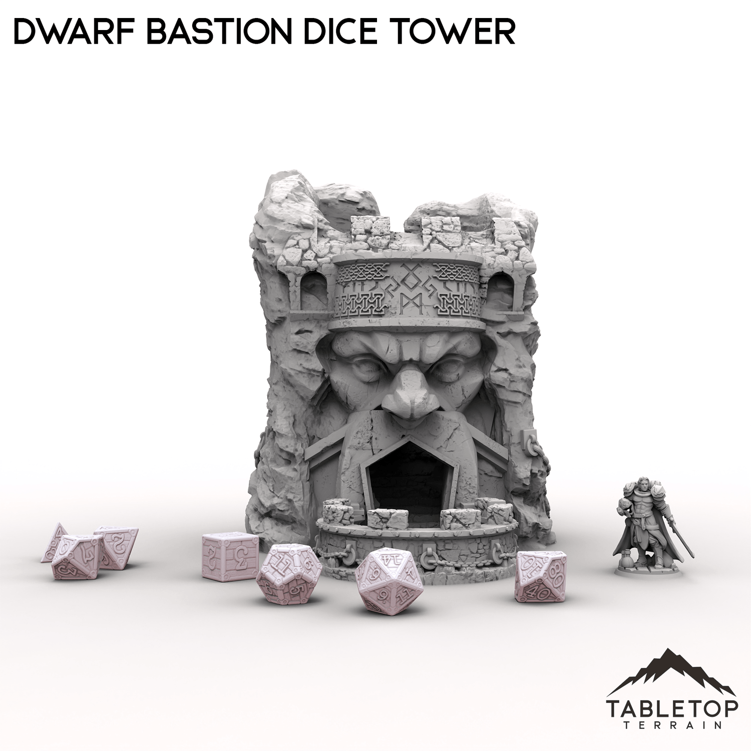A sturdy, stone-built Dwarf Bastion Dice Tower rises with thick walls and angular carvings. Heavy metal reinforcements and dwarven runes line its surface, showing the craftsmanship of master smiths. Dice tumble from the top battlements, clattering down to the lower level like boulders in a mountain pass