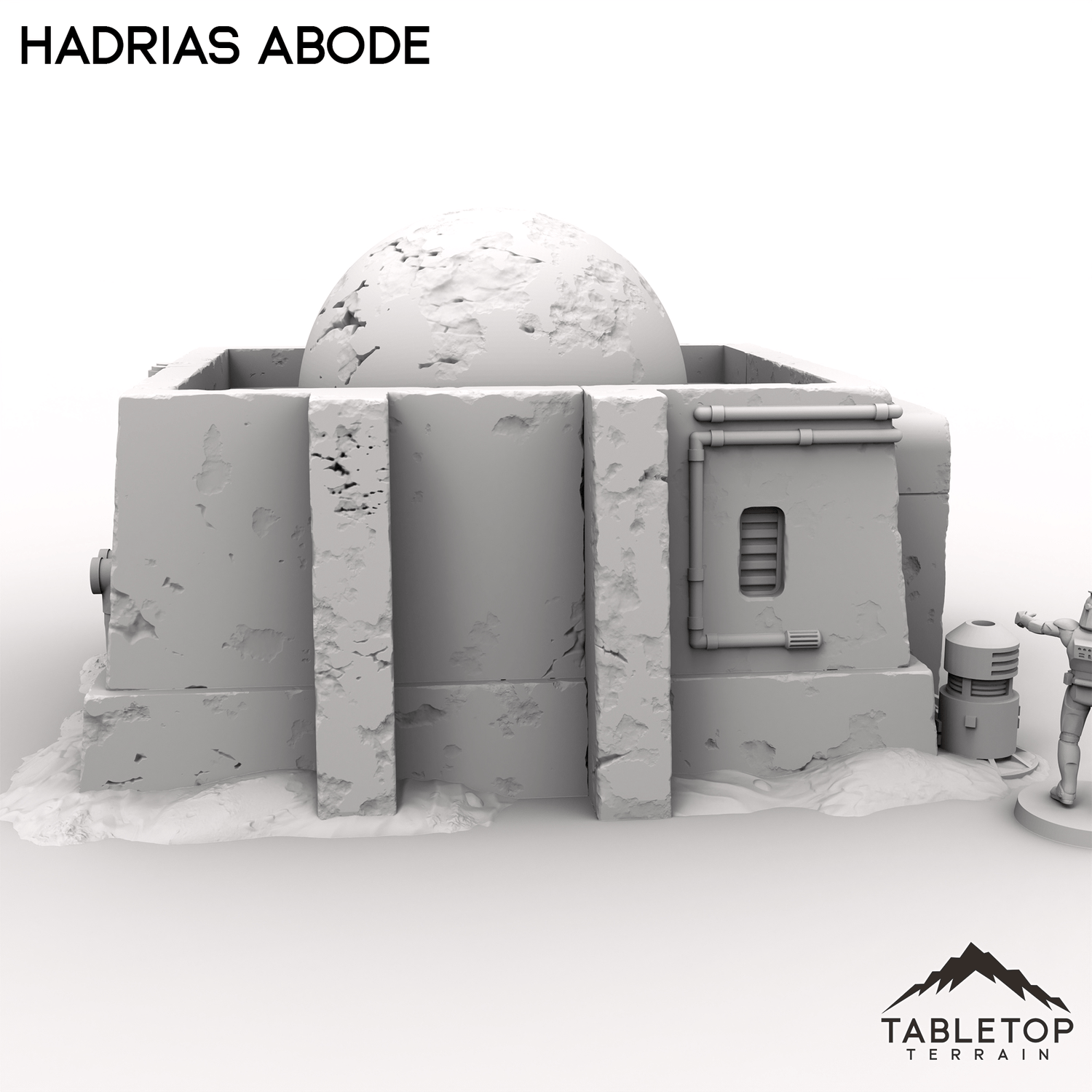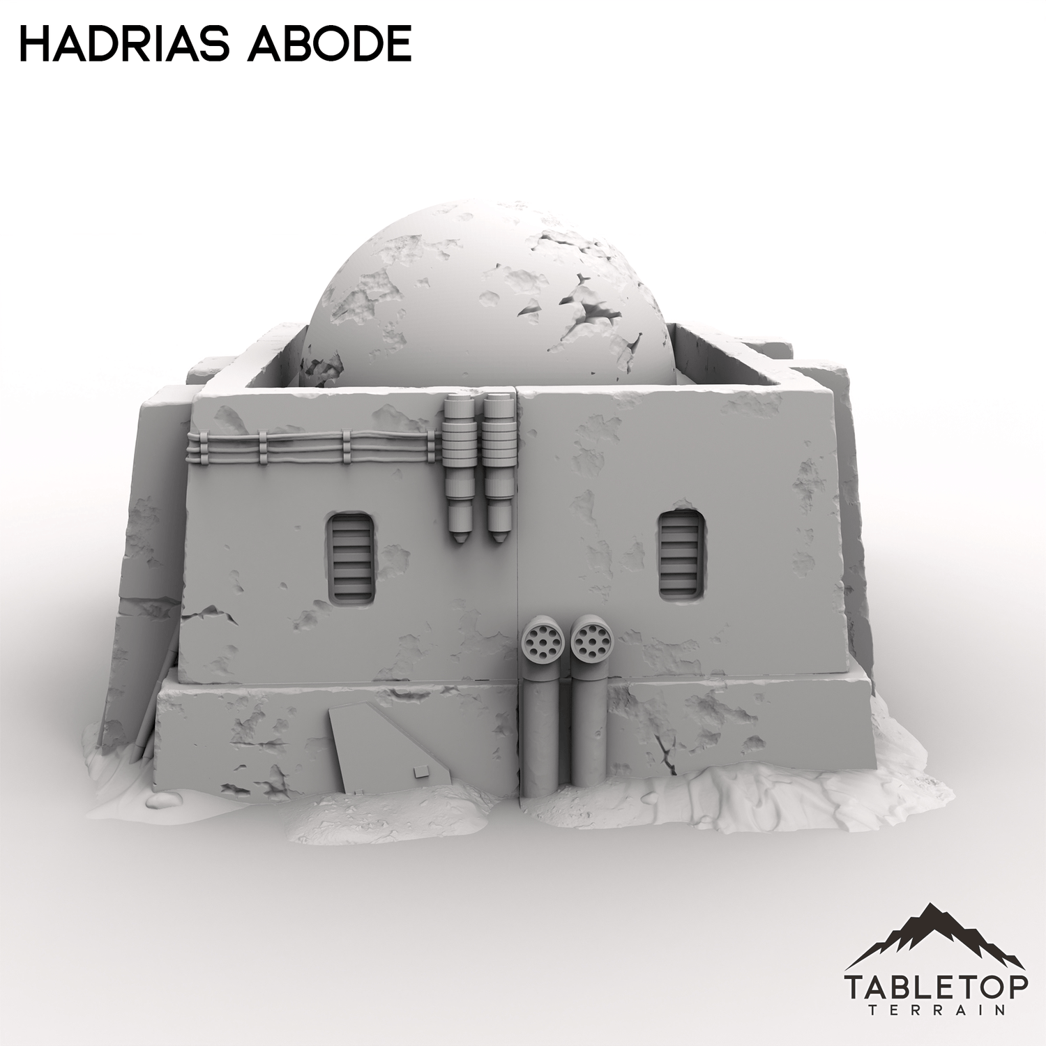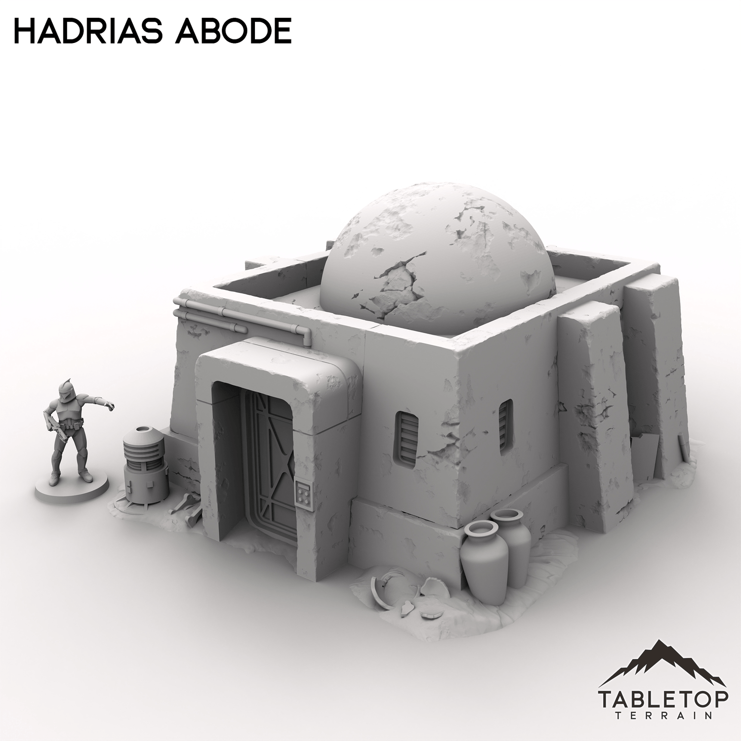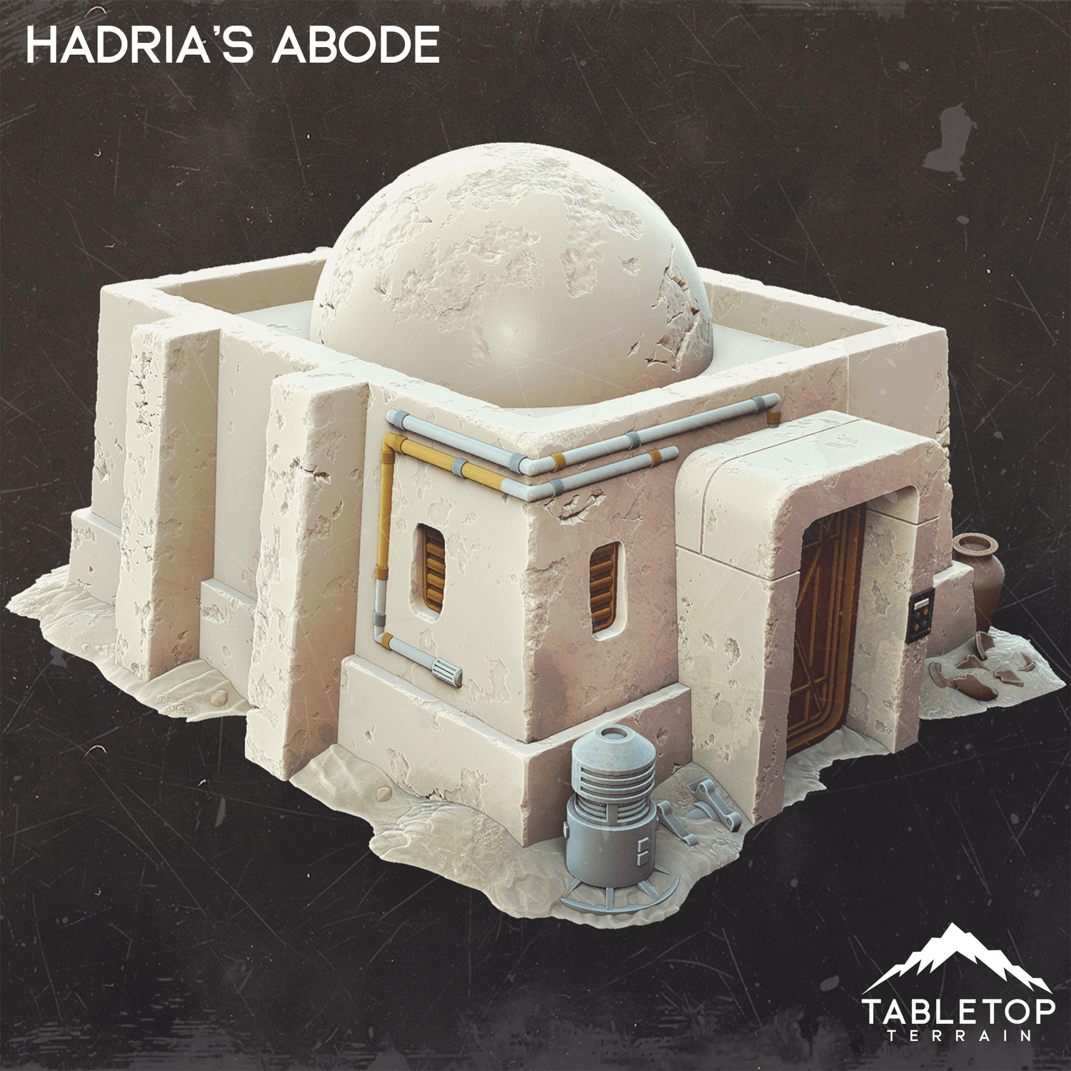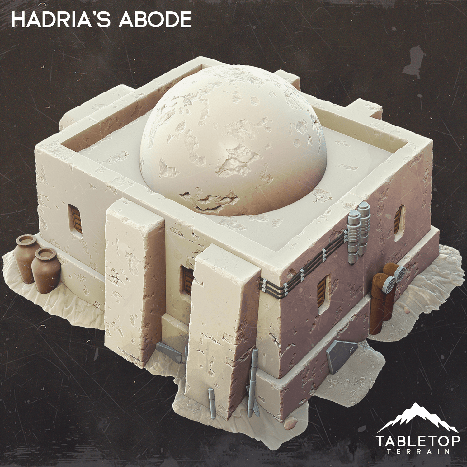 Hadrias Abode is a sturdy dwelling built to last in a harsh world. Featuring thick walls and reinforced supports while the dome add a distinctive desert feel to the building. A few scattered barrels and containers adds a homey touch to the scene.