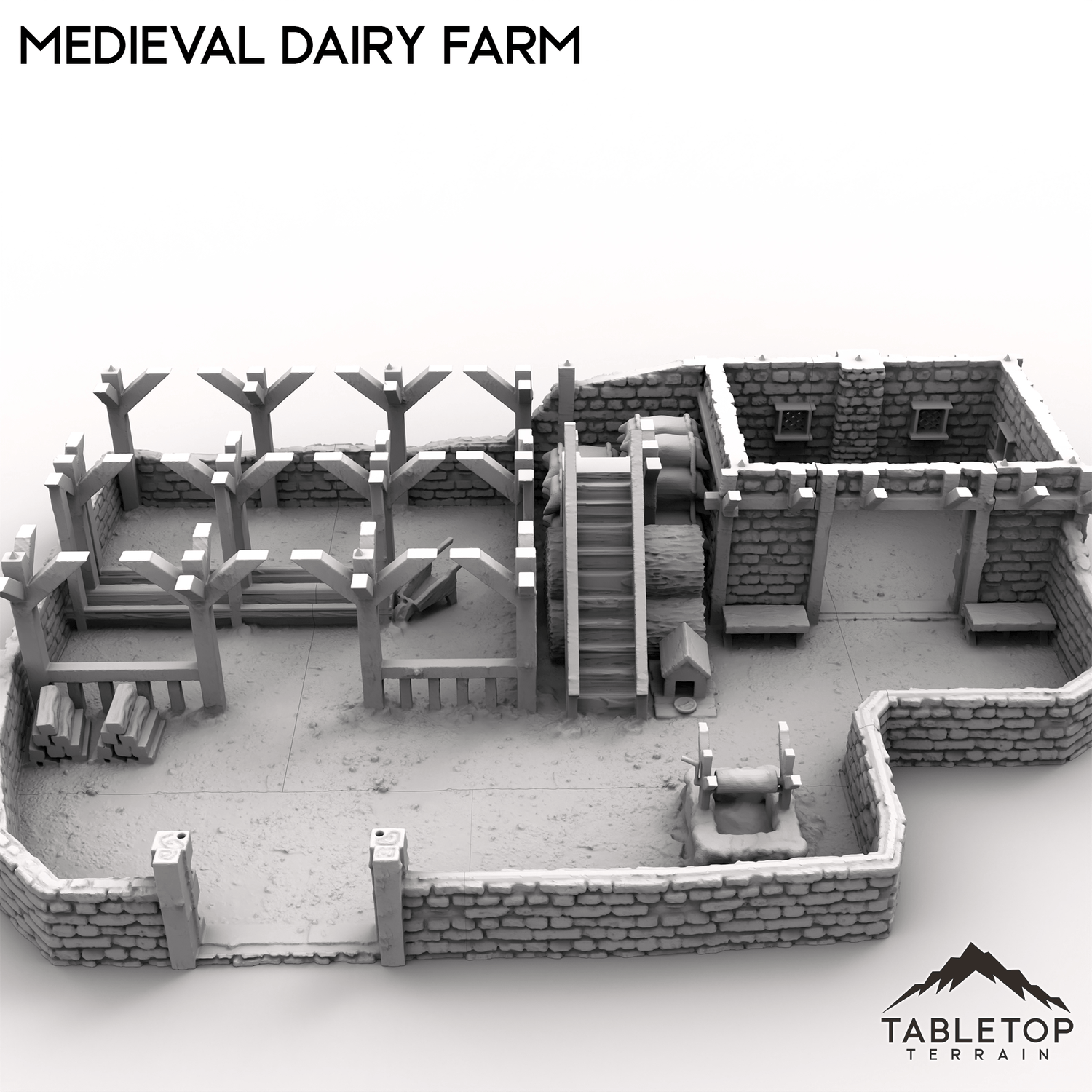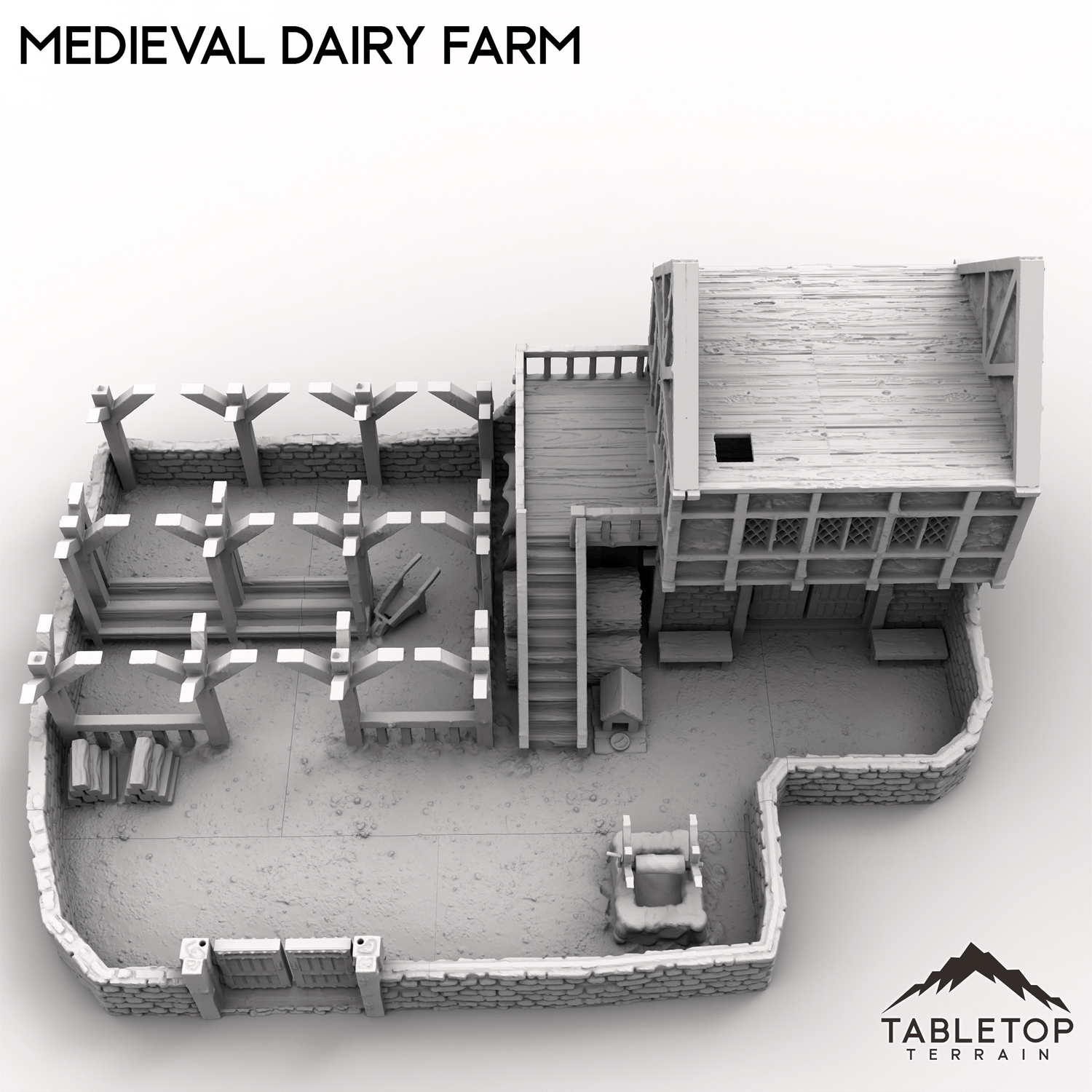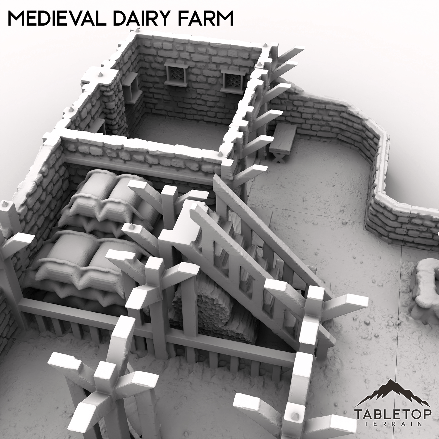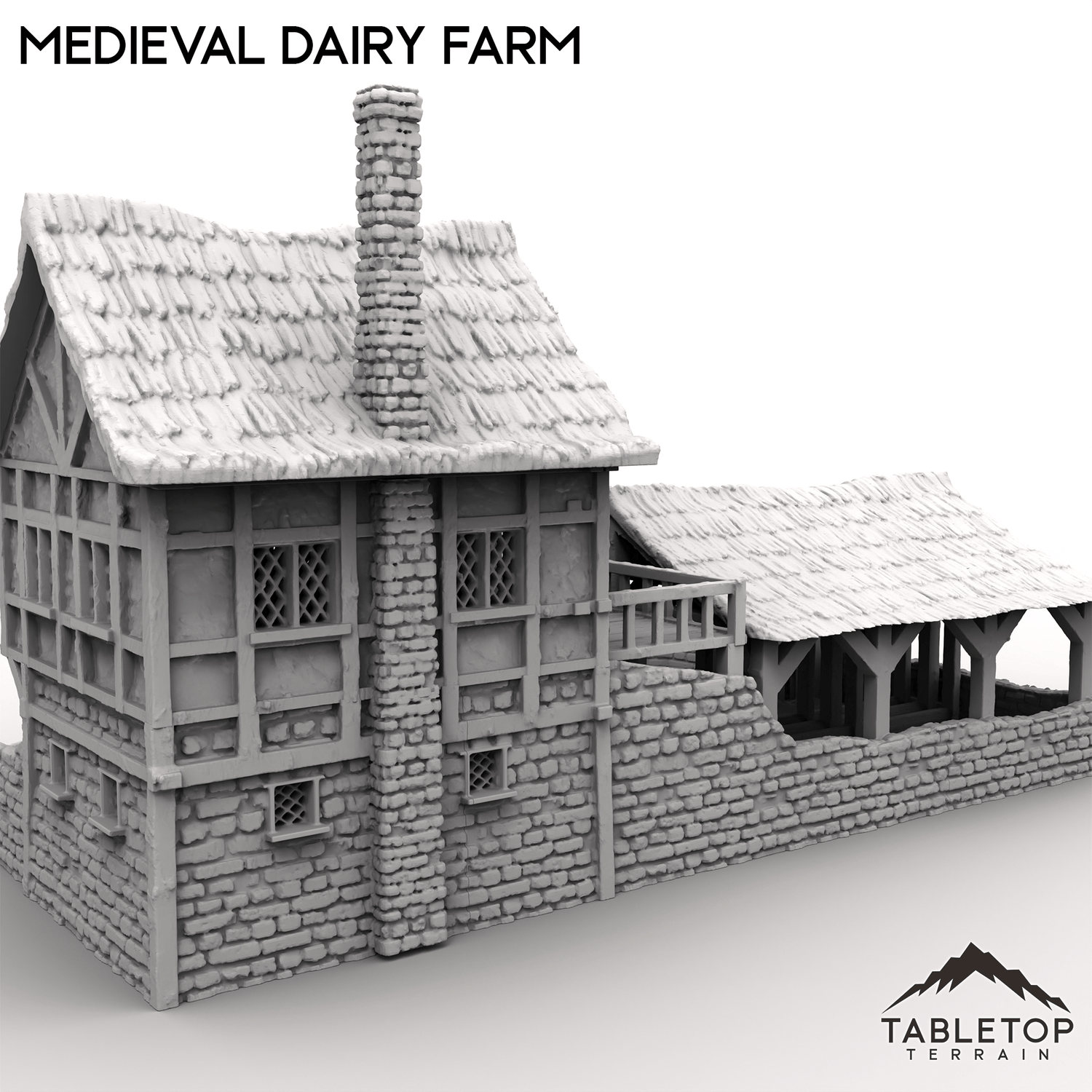 The Medieval Dairy Farm is a 2-story house with an attached barn, all set upon a detailed yard encircled by a stone wall. The doors are all functional, able to be opened and closed. The building is made in a classical style, allowing for use in a number of different genres of tabletop games. At 28mm scale, it will work nicely for most games.