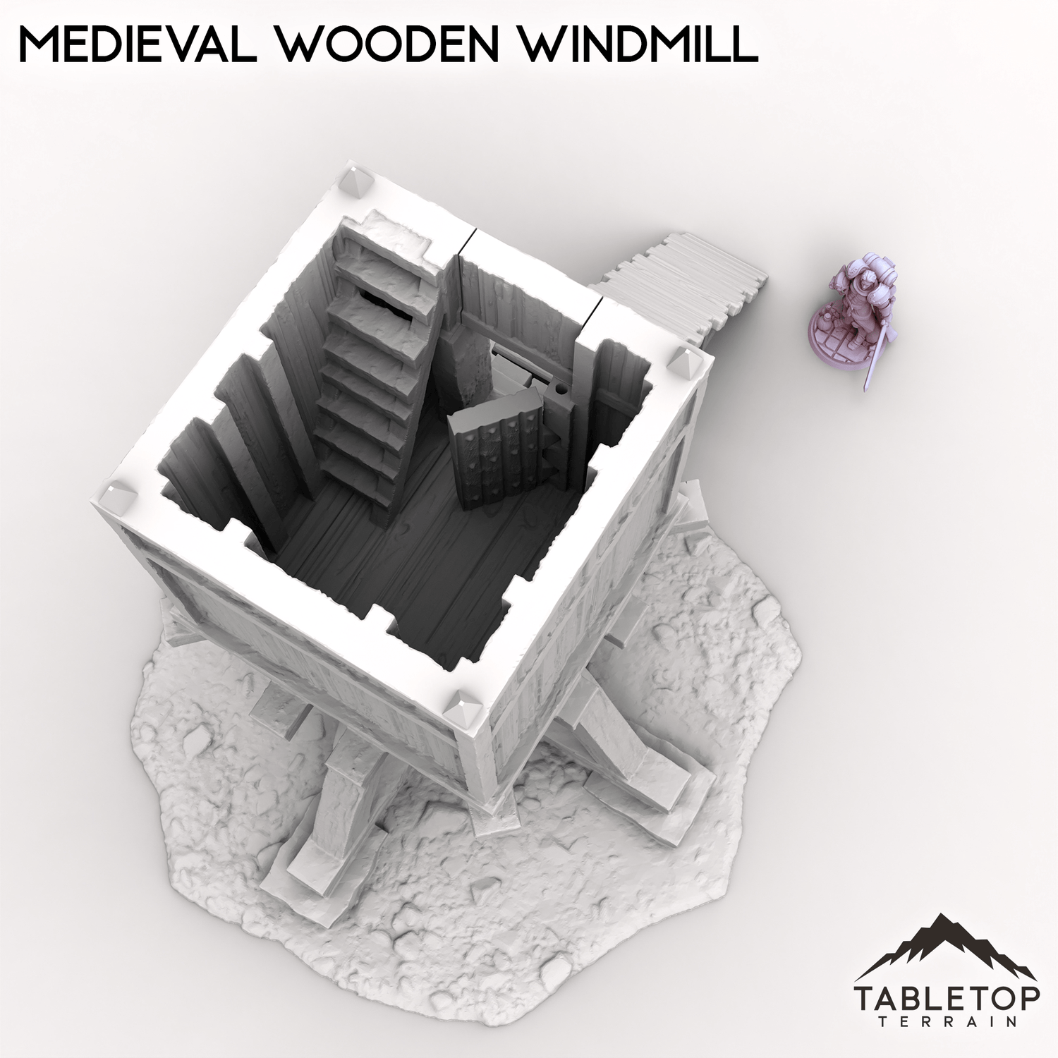 The Medieval Wooden Windmill rises on sturdy timber stilts. Weathered planks and a steep roof crown the structure, while a ladder and hatch grant entry to the milling chamber above. Opening the working door reveals the detailed interior including grinding stones and the rotating mechanism itself