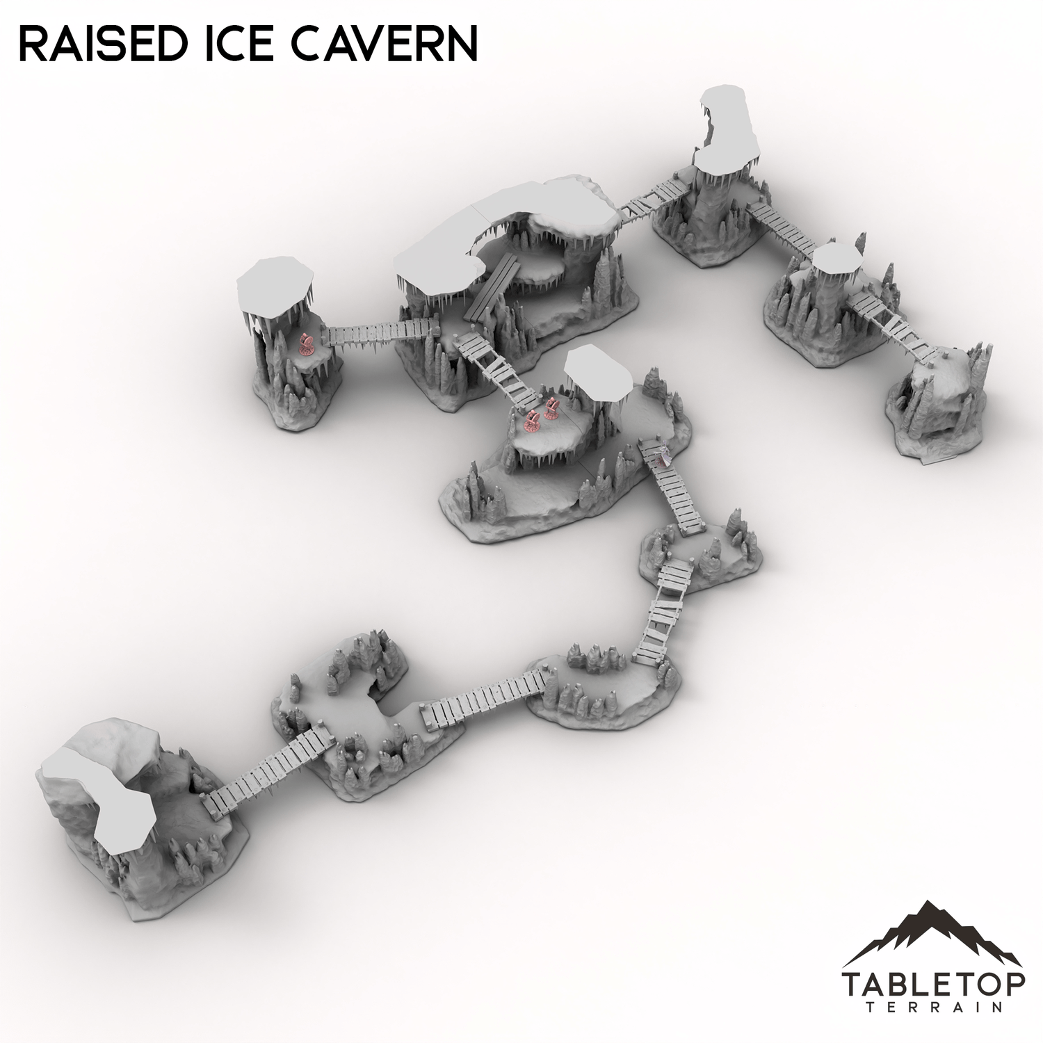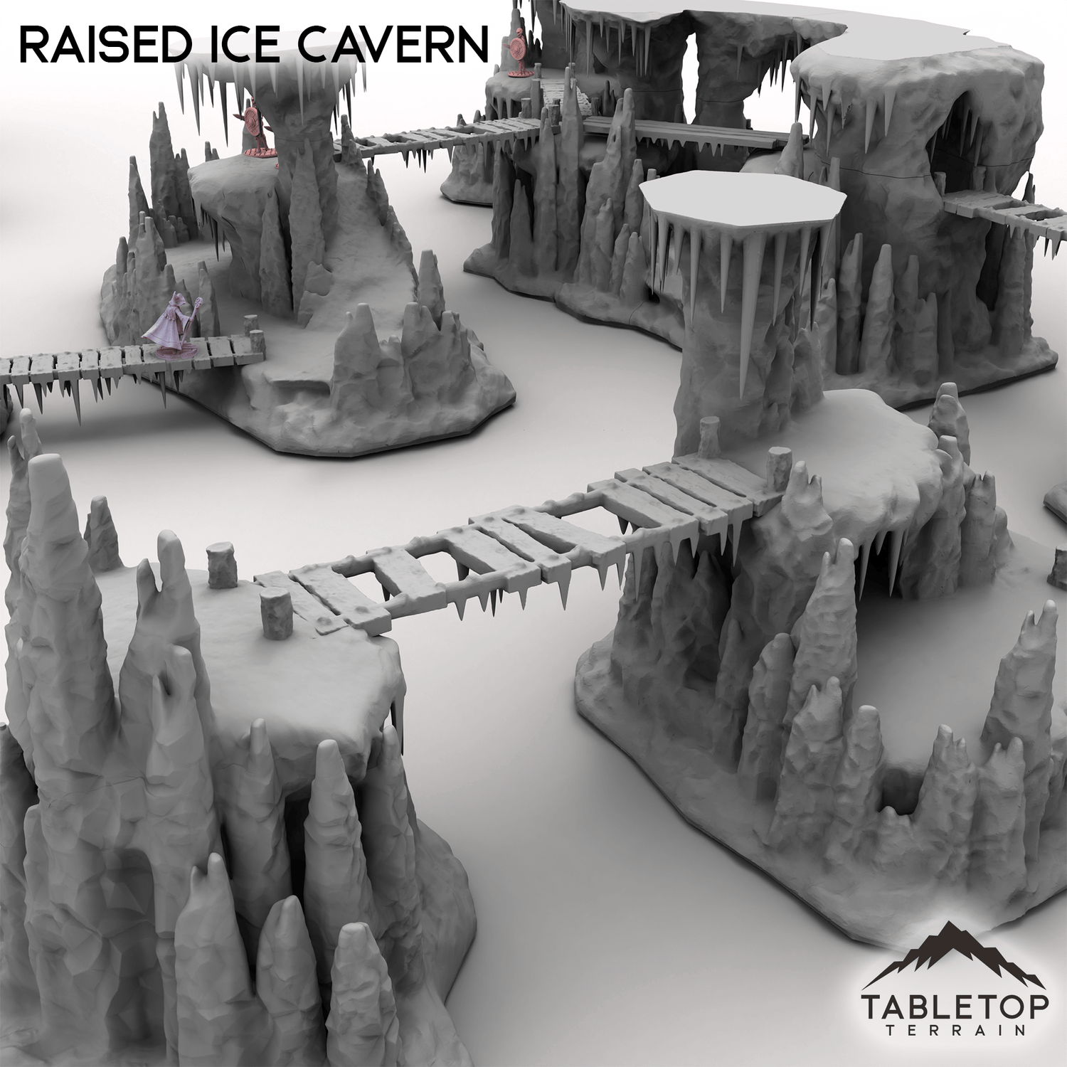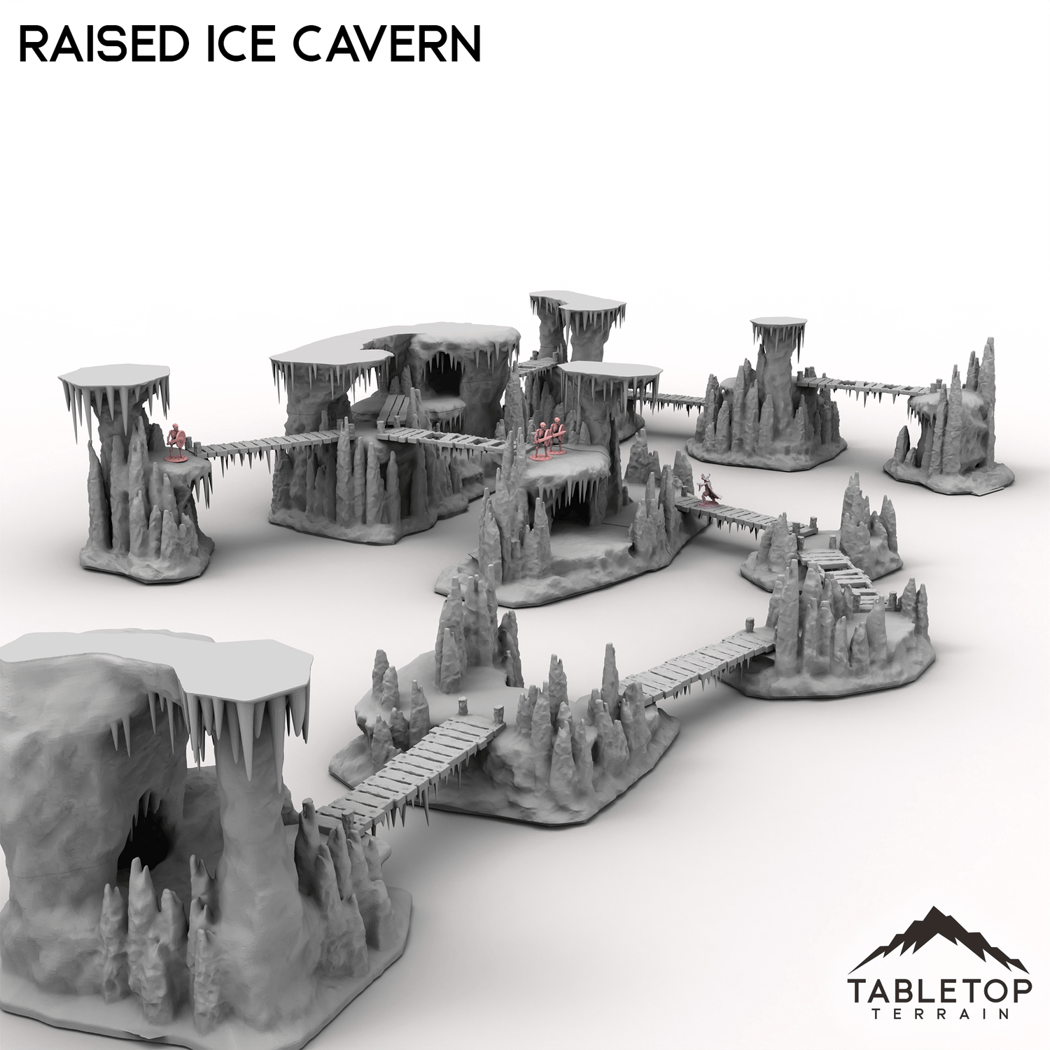The Raised Ice Cavern features towering walls, jagged icicles, and frozen bridges. Multiple levels and treacherous ledges add strategic depth and risk for gameplay, This terrain set can be configured however you want, letting you create your own frozen adventure every time.