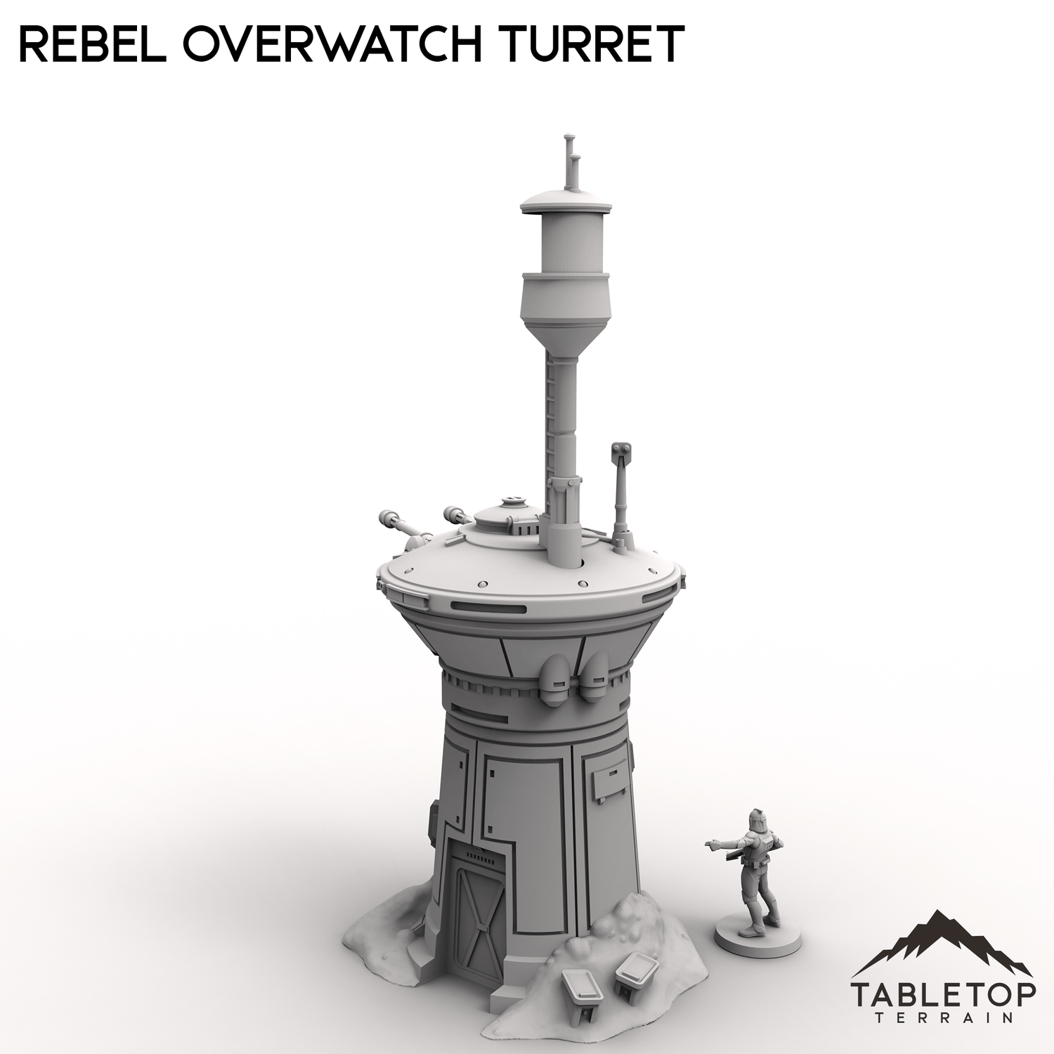 The Rebel Overwatch Tower is a standard part of most rebel bases, a useful tool for keeping an eye on the skies. This version has been modified for the snowy terrain the rebels have been forced to survive in for the time being. The top has a slot of fitting a mini inside, depending on the size of the mini and its base.