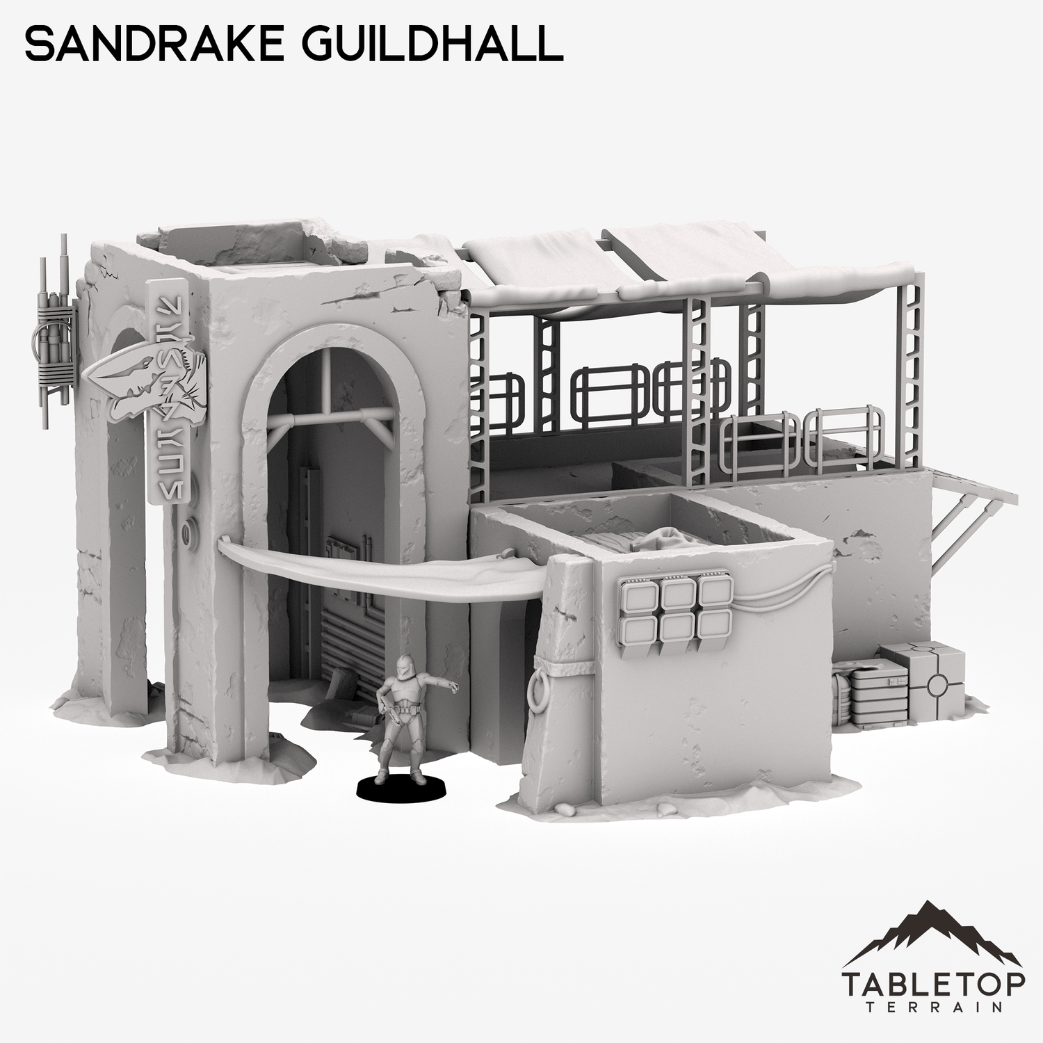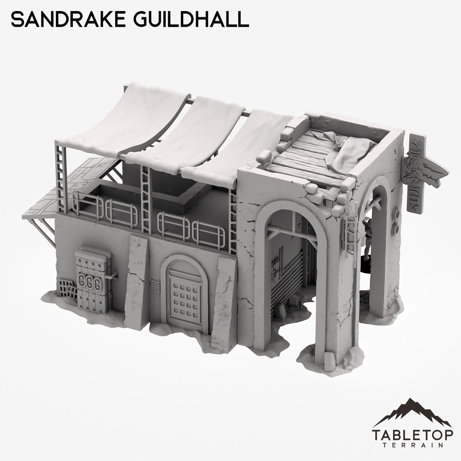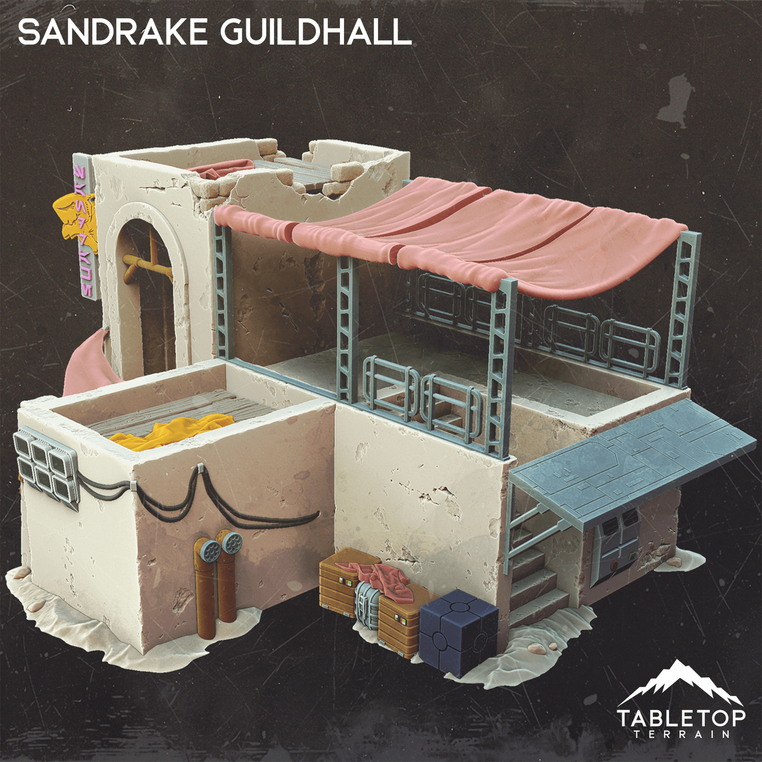 The Sandrake Guildhall stands as a rugged outpost serving as a vital hub for mercenaries and desert wanderers alike. Its layered architecture, with shaded canopies and a sturdy upper level, offers both protection from the elements and a commanding vantage point over the bustling streets below.