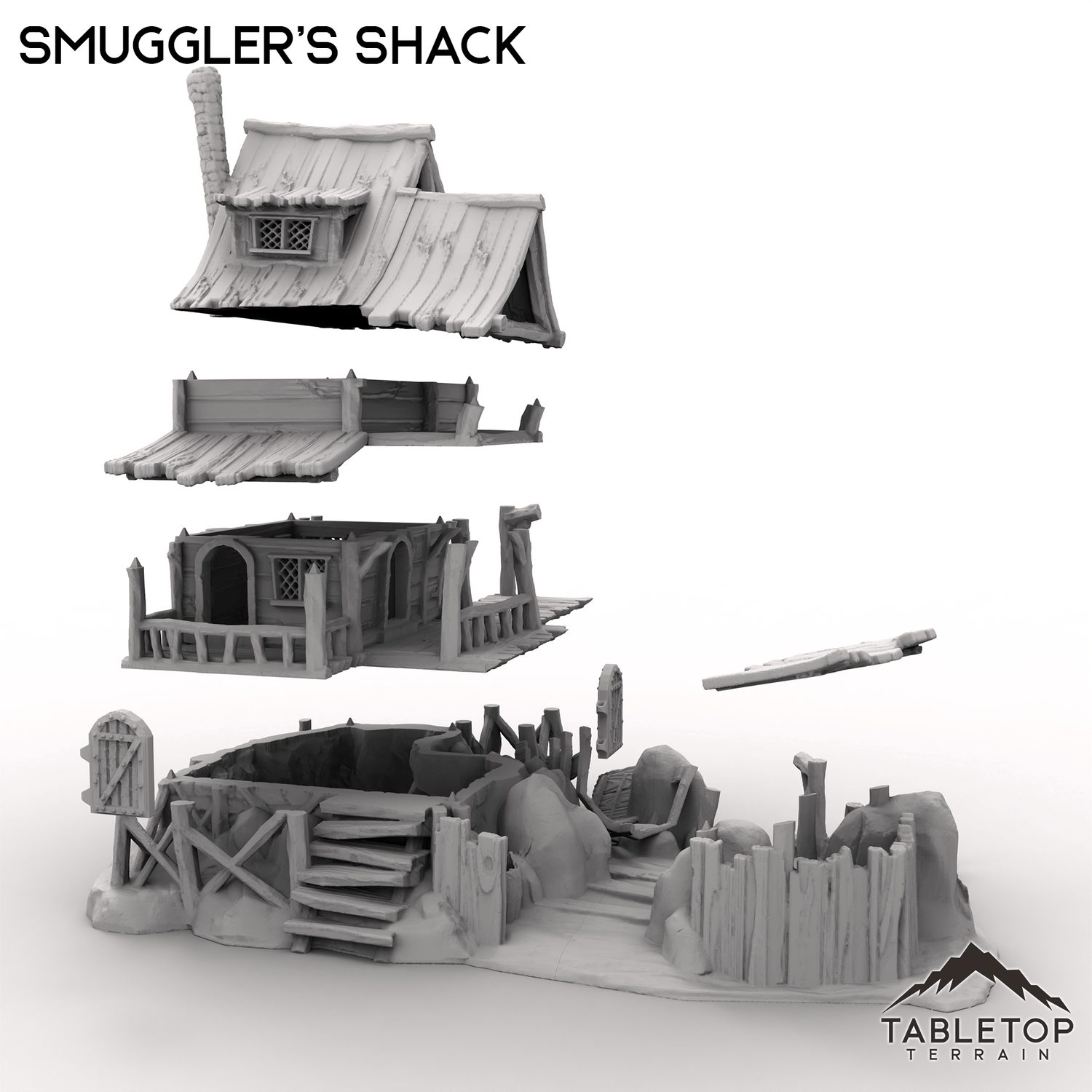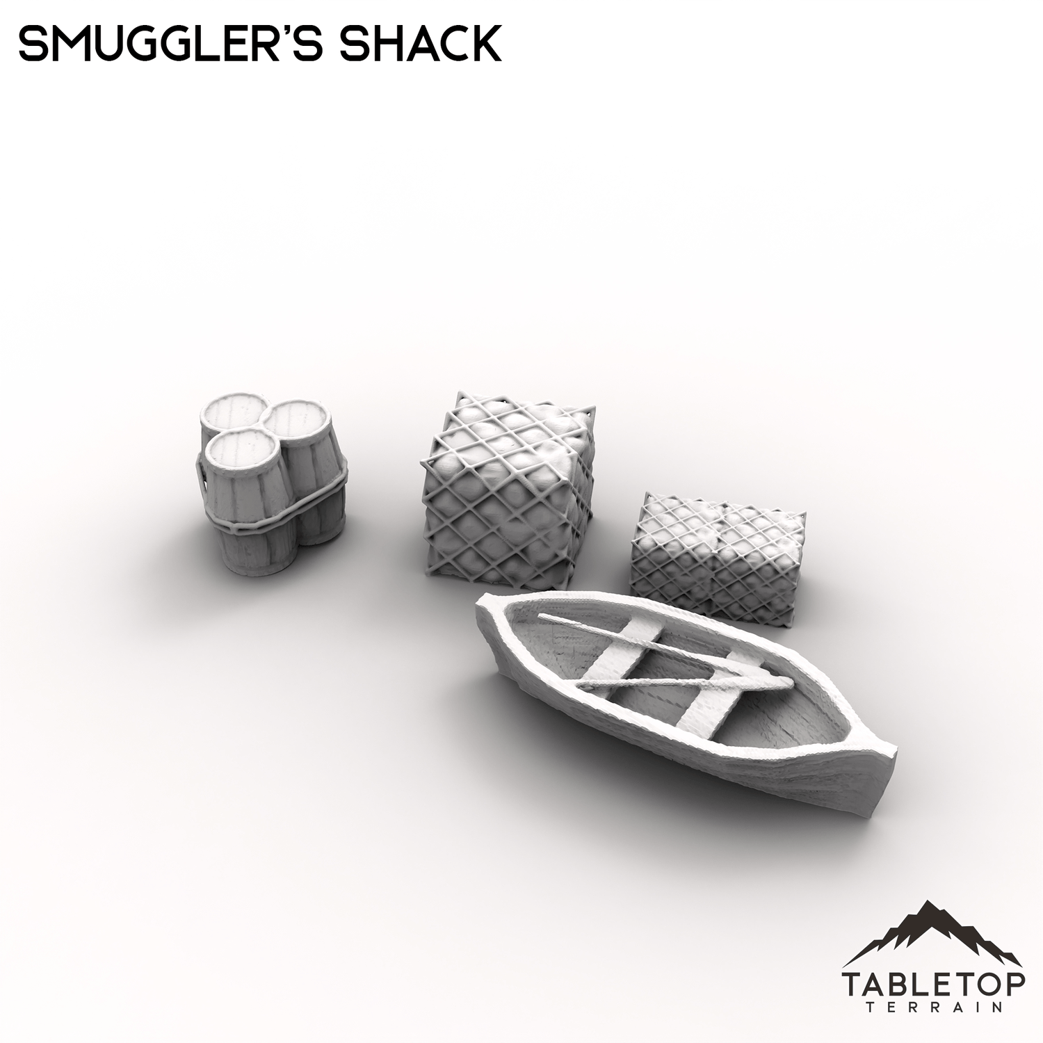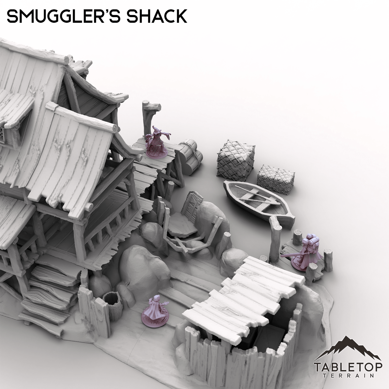 Smuggler's Shack lies on the waterfront, a simple shack covering a hidden cave below. The house has a small attic, but the real fun is the hidden cave that can be access by removing the house. Each section is separately made, for easier painting and storage. The Smuggler's Shack set includes a few boxes and crates, as well as a small row boat, as scatter for matching the building.