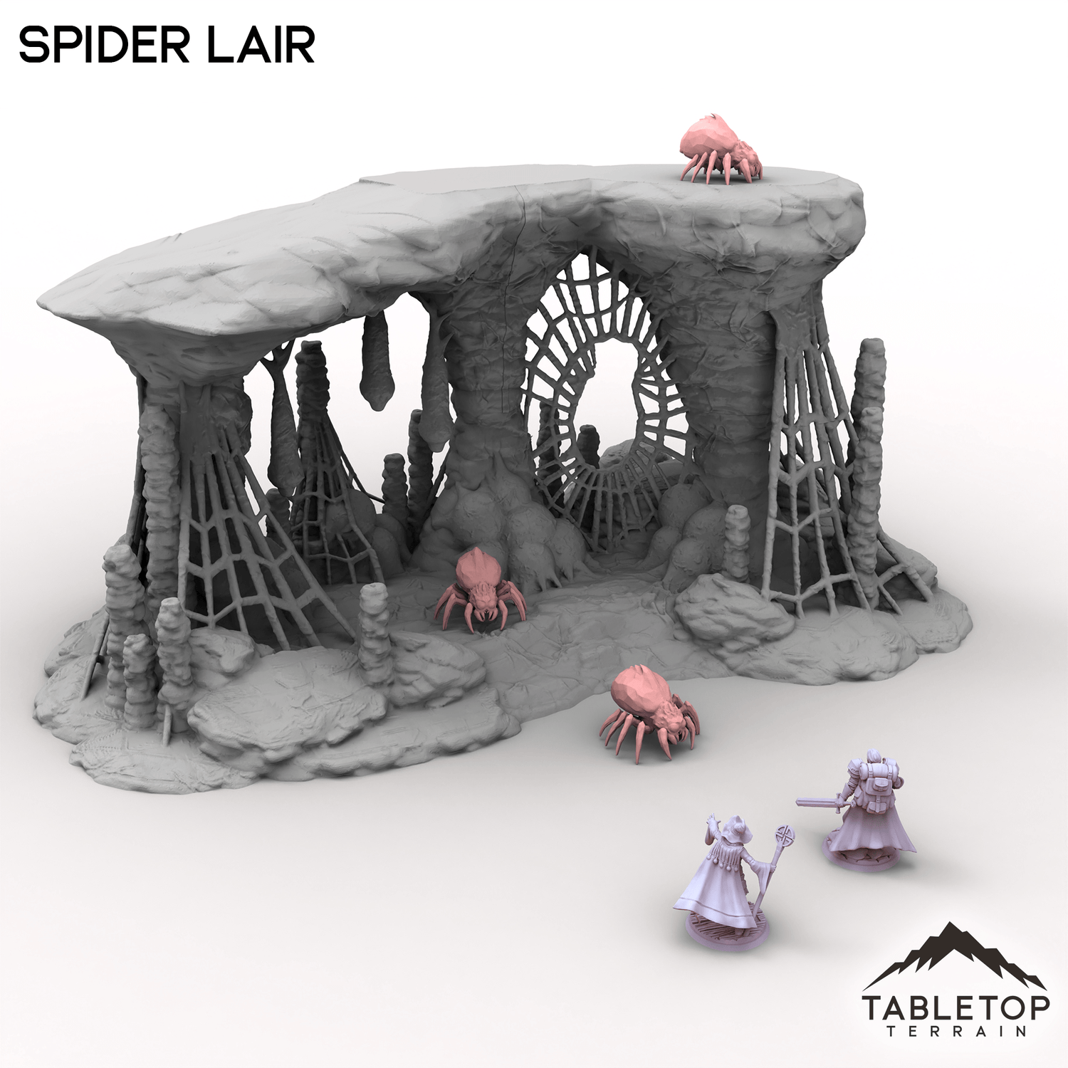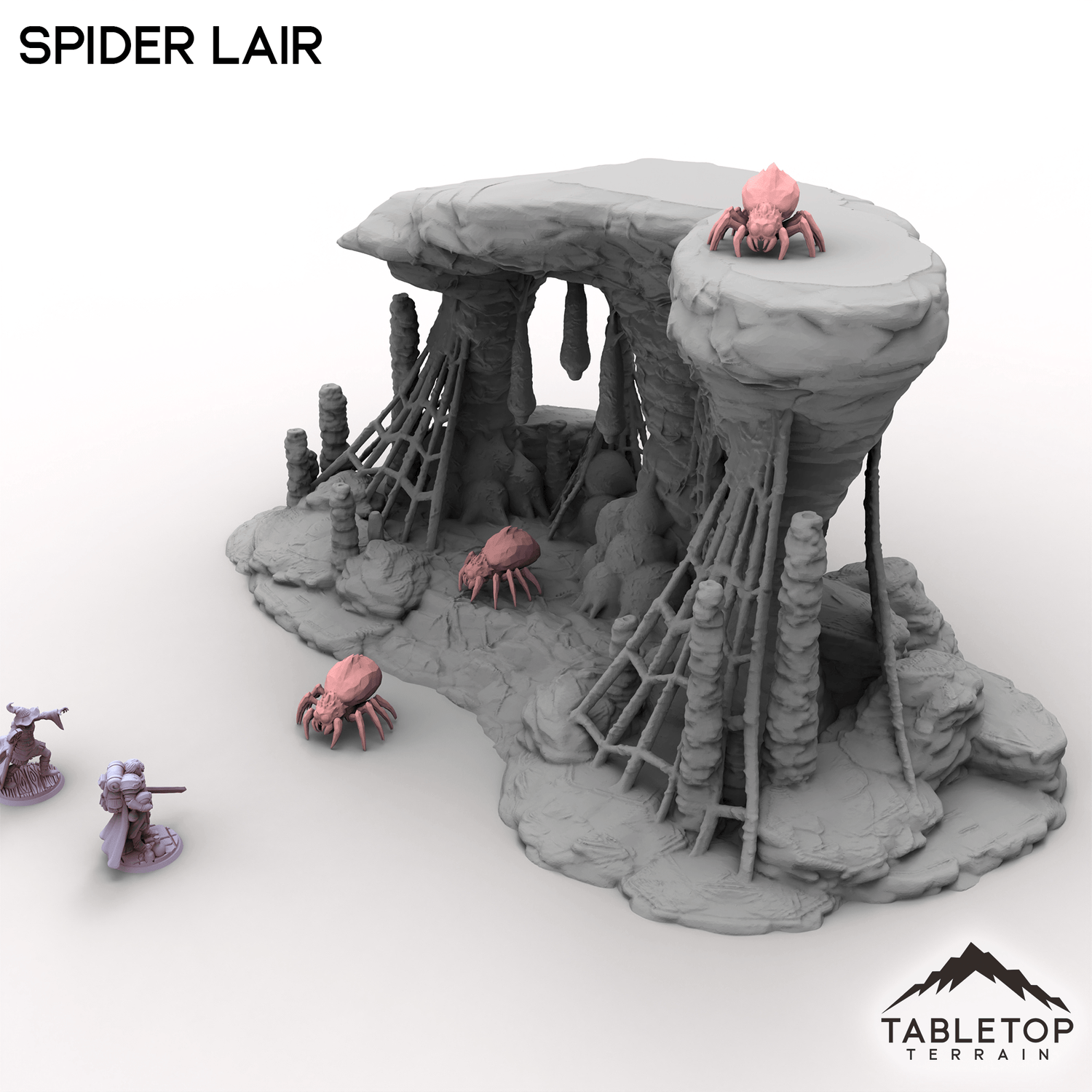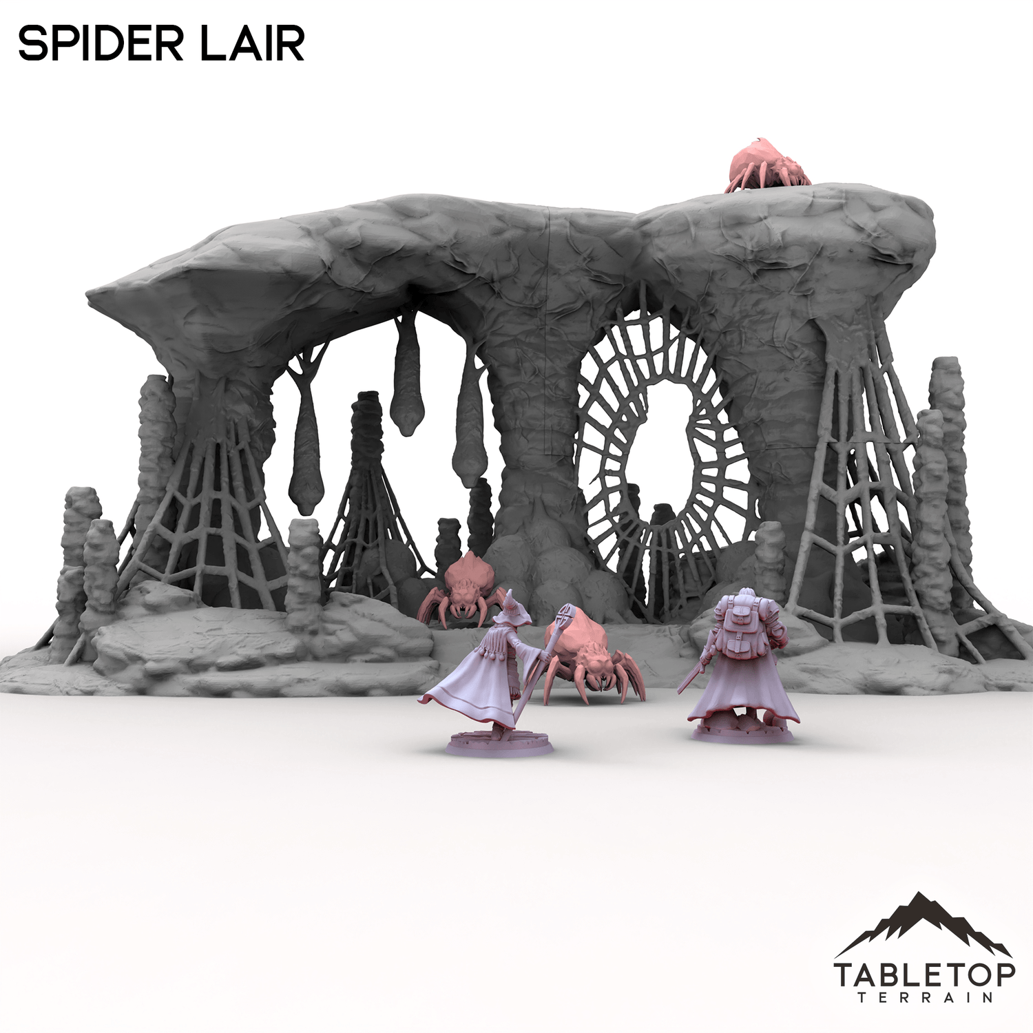 The Spider Lair is a shadowy cavern of stone pillars draped in thick webbing. Each pillar has texturing to show web spread throughout the cave, and of course there are massive spun webs for trapping larger prey. The set also features cocooned bodies hanging ominously from the cave's ceiling, dangling helplessly. This set is a good way to have terrain for an encounter inside a spider's cave, without needing to buy an entire cave!