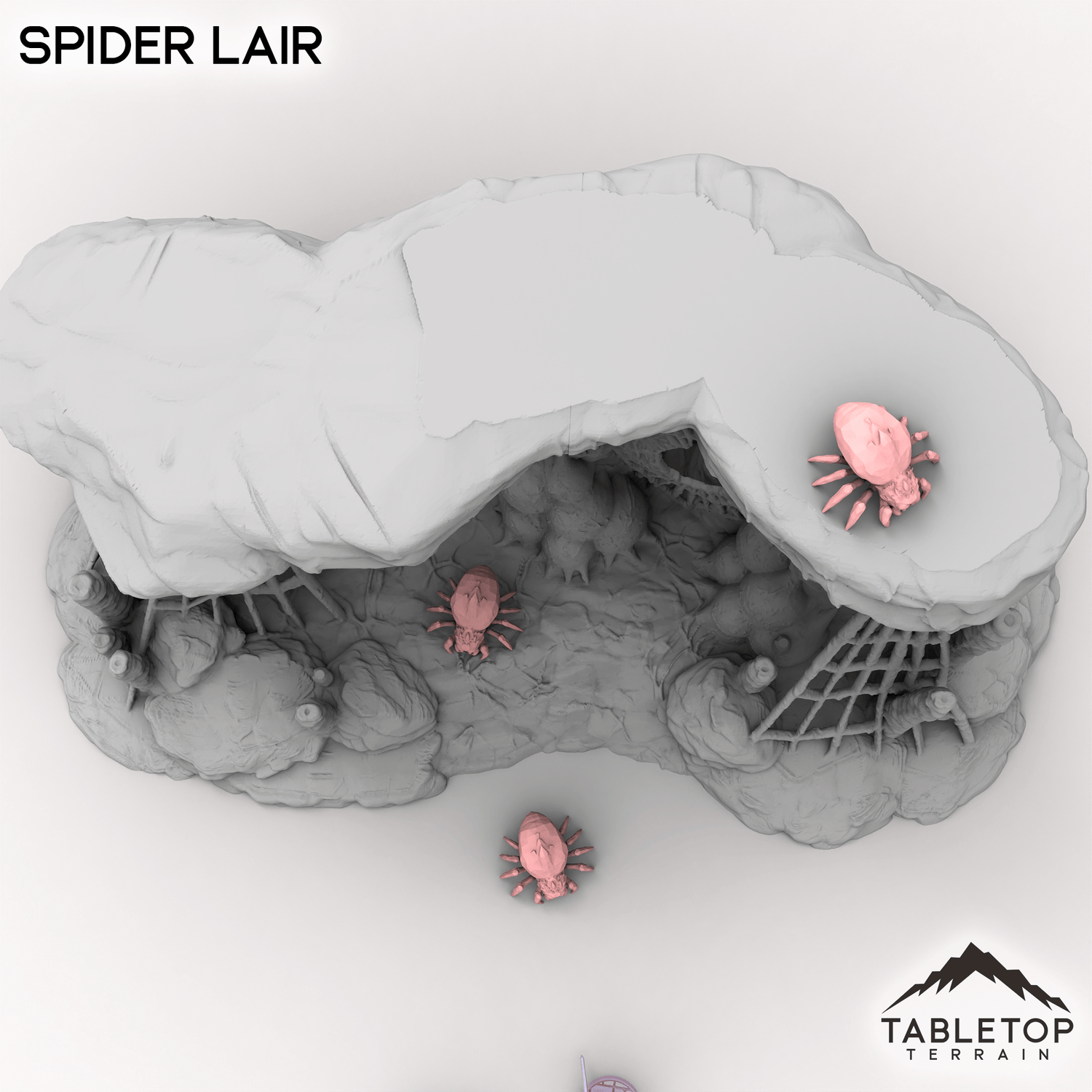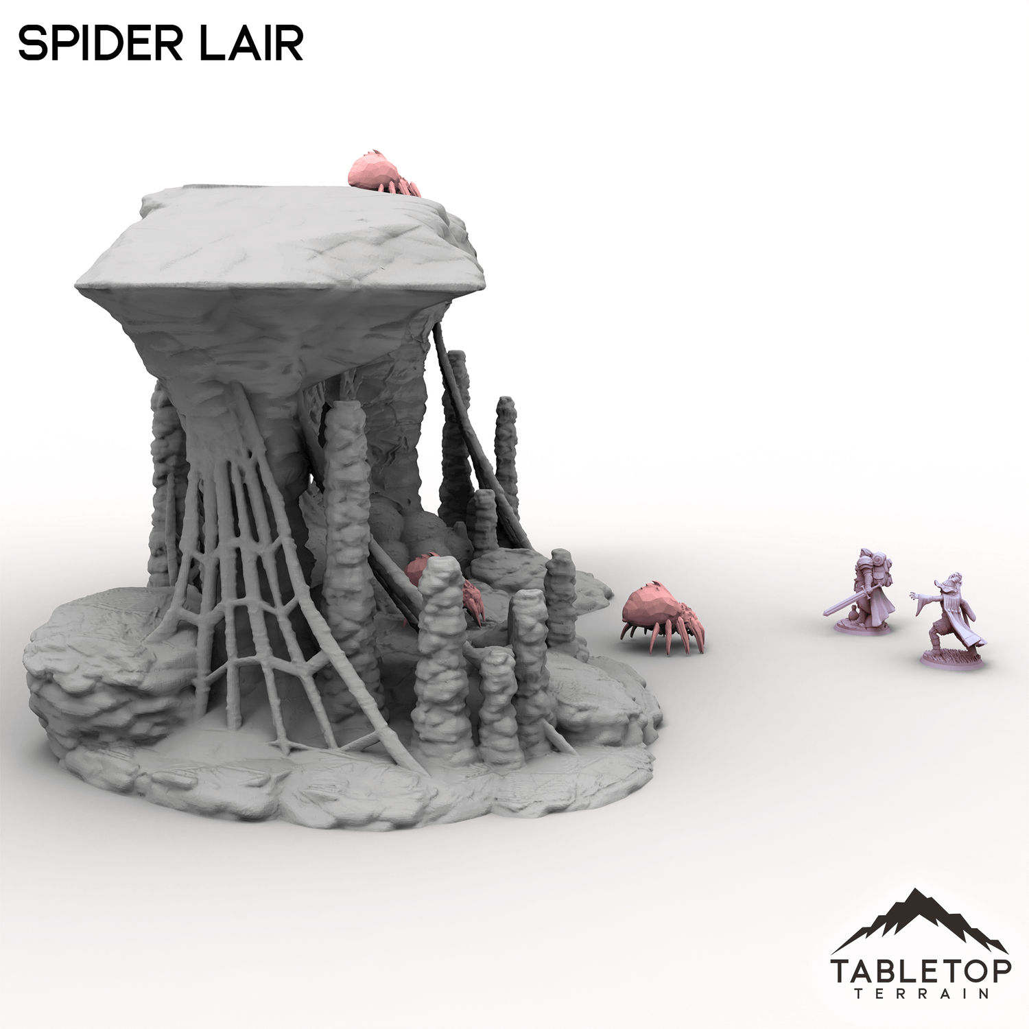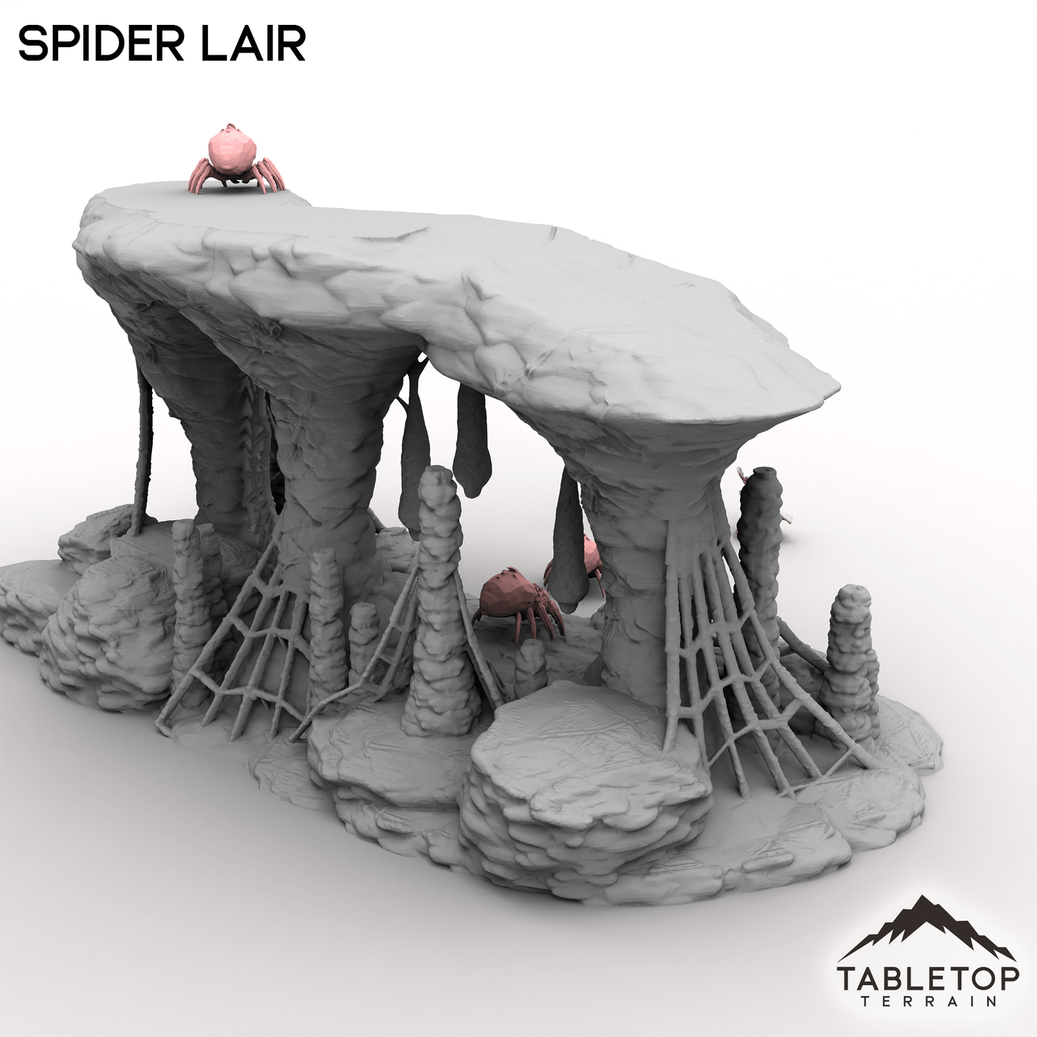 The Spider Lair is a shadowy cavern of stone pillars draped in thick webbing. Each pillar has texturing to show web spread throughout the cave, and of course there are massive spun webs for trapping larger prey. The set also features cocooned bodies hanging ominously from the cave's ceiling, dangling helplessly. This set is a good way to have terrain for an encounter inside a spider's cave, without needing to buy an entire cave!