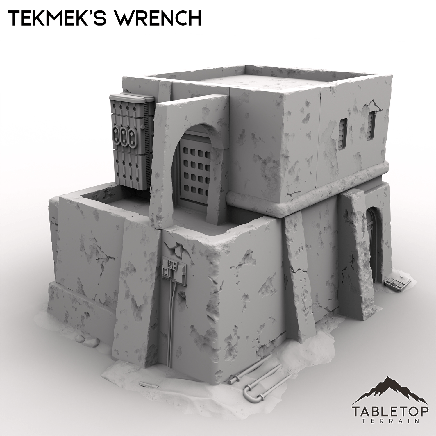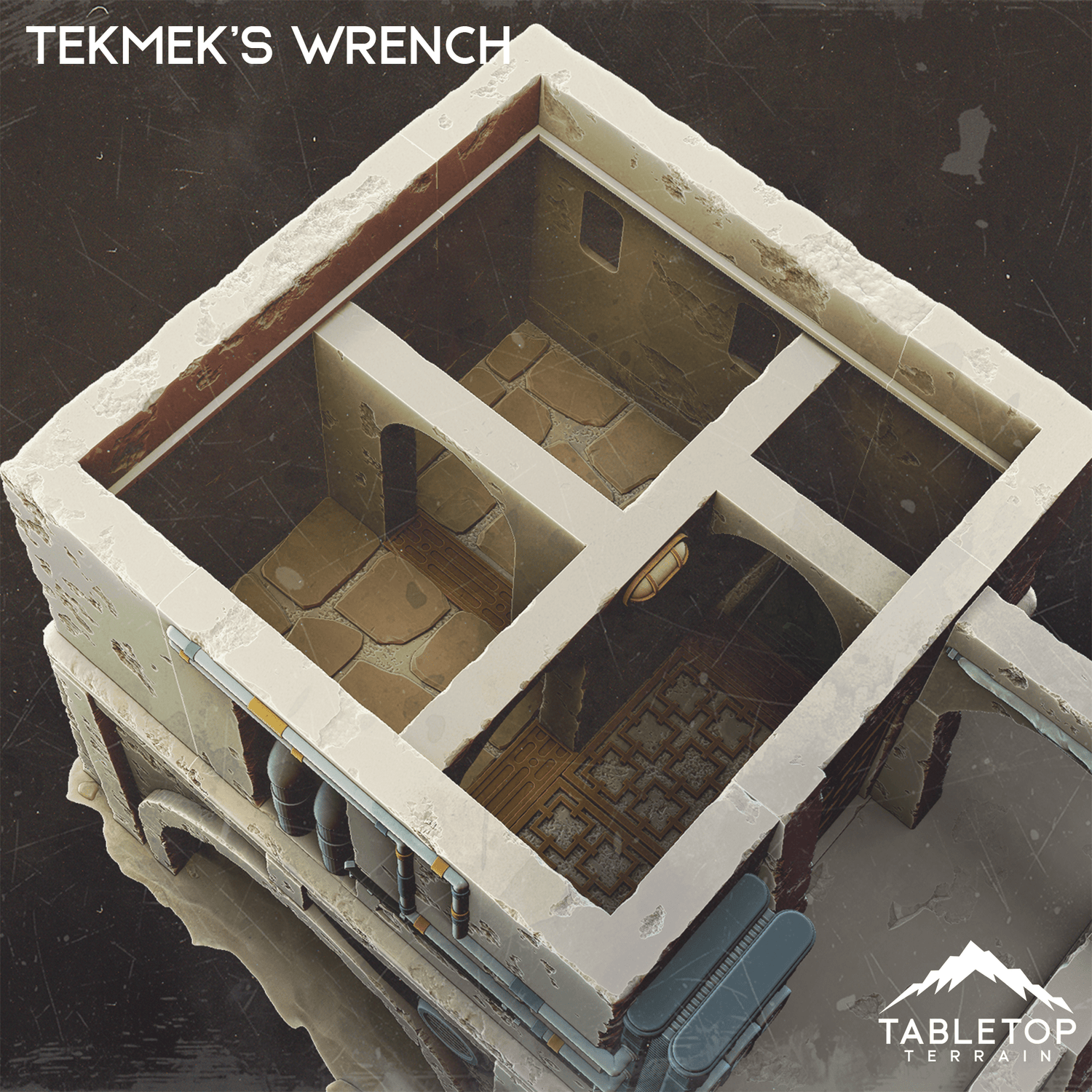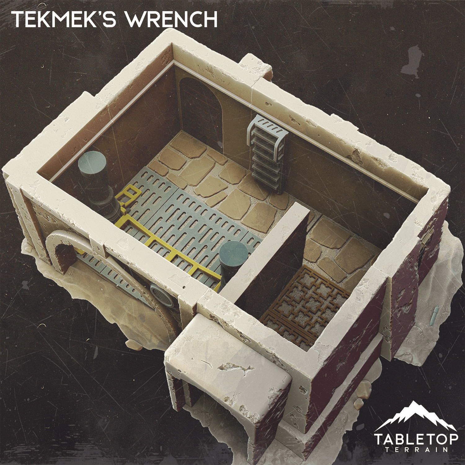 Tekmek's Wrench is a ramshackle, multi-level workshop that looks like it’s been patched together as many times as the machines inside. Its reinforced walls and external piping suggest a busy tinker has been at work. Perfect for a meeting spot, a repair shop, or just a place to hunker down when things get rough.