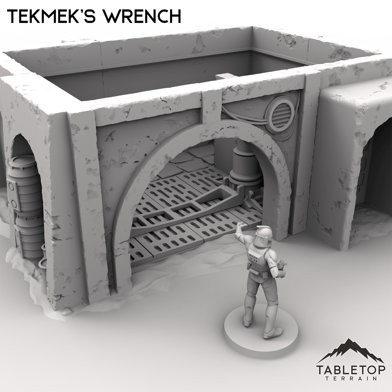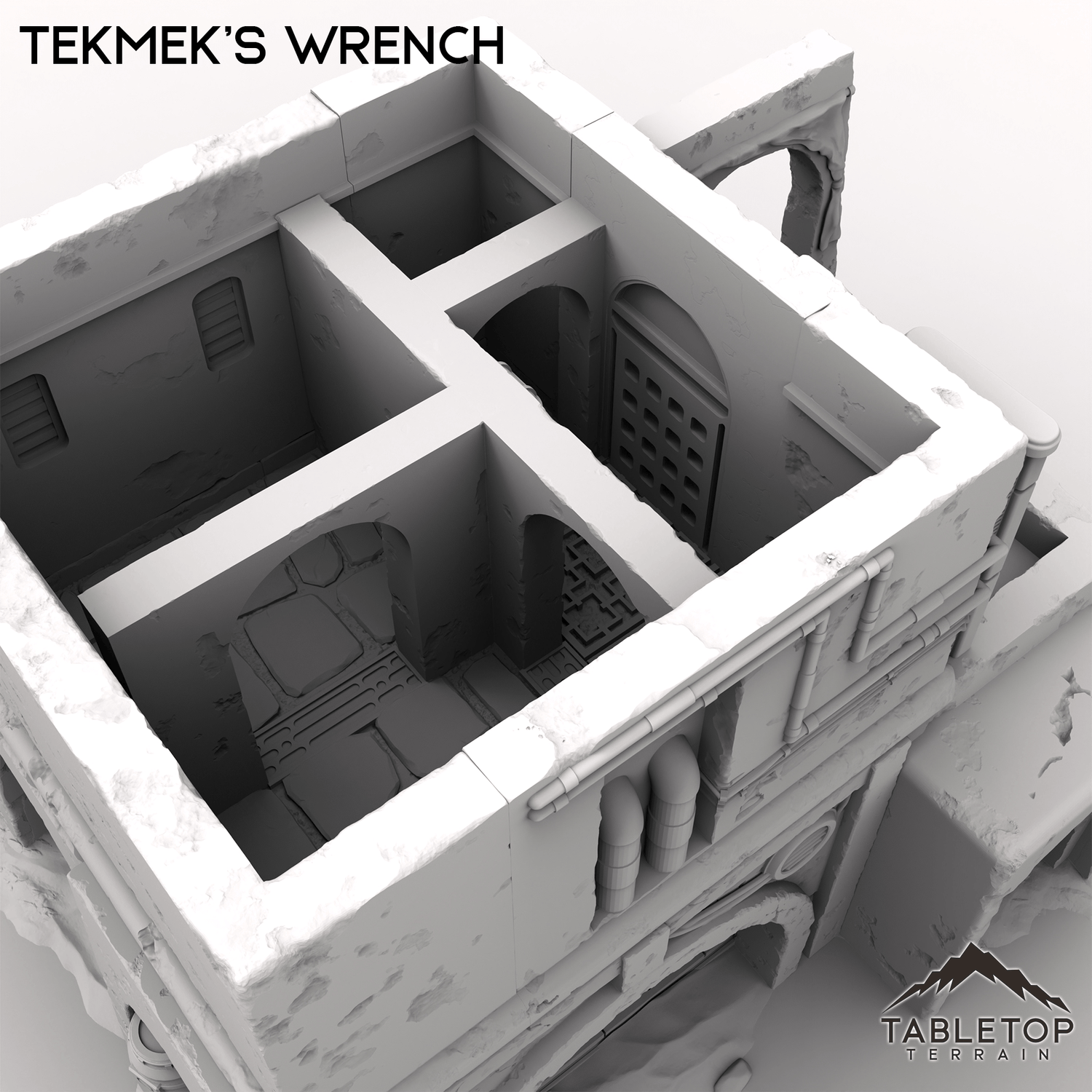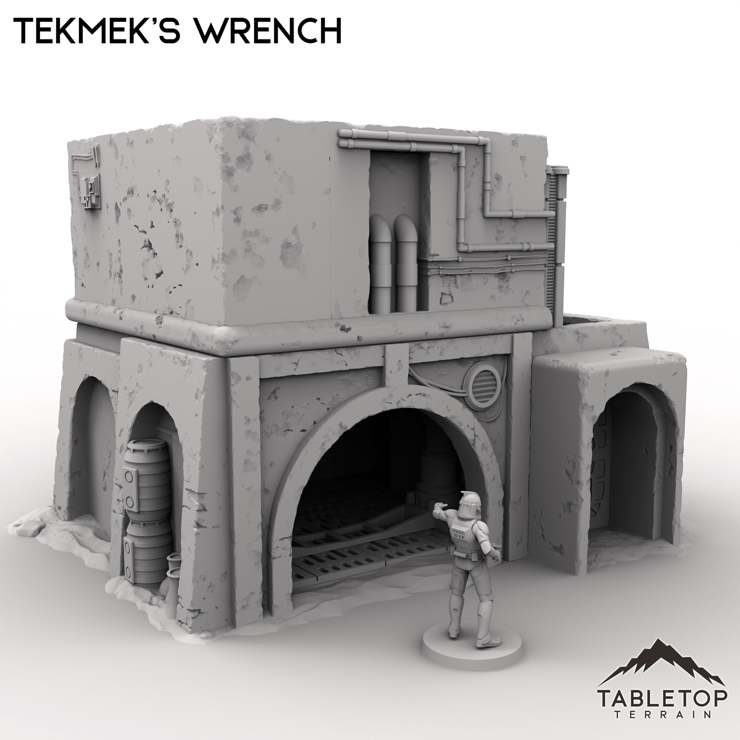 Tekmek's Wrench is a ramshackle, multi-level workshop that looks like it’s been patched together as many times as the machines inside. Its reinforced walls and external piping suggest a busy tinker has been at work. Perfect for a meeting spot, a repair shop, or just a place to hunker down when things get rough.