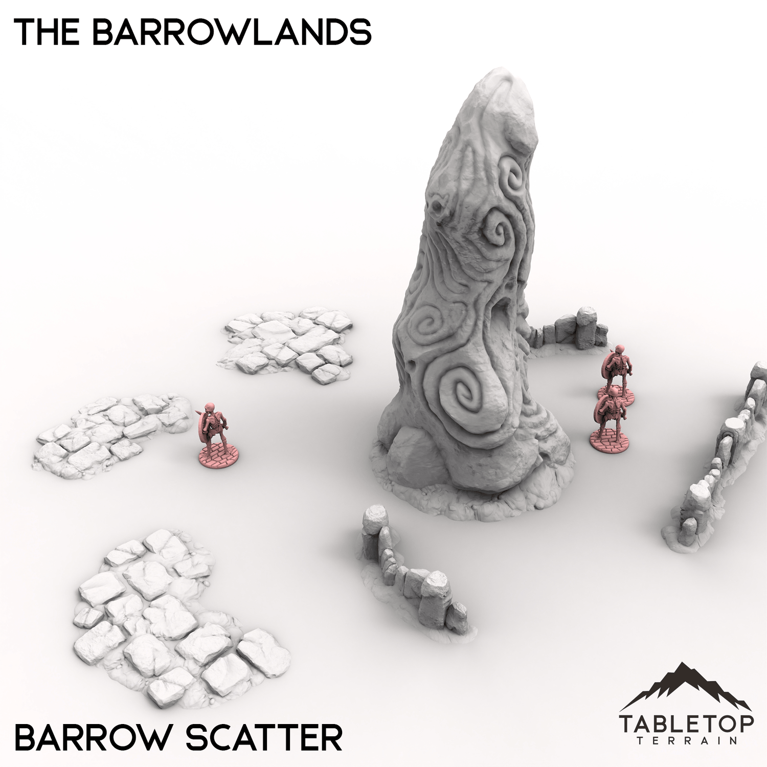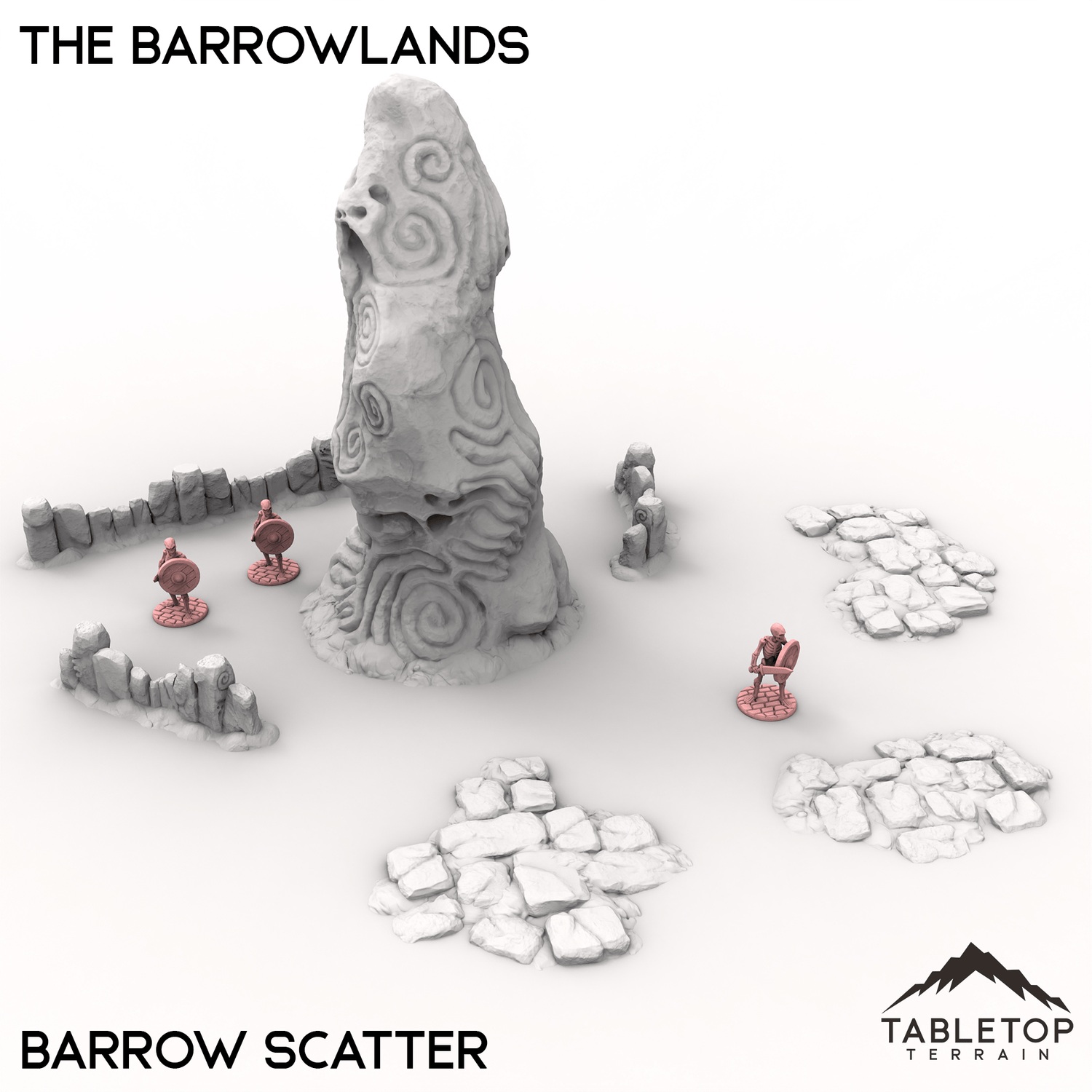 The dead lay in rest at the Barrowlands. The largest tomb, the King's Barrow, features a wide open interior with stone and dirt texturing for active use on a tabletop. The smaller Barrows Set features 6 different barrows for use around the table, while the Barrows Scatter adds detail and thematic elements to your tabletop layout.