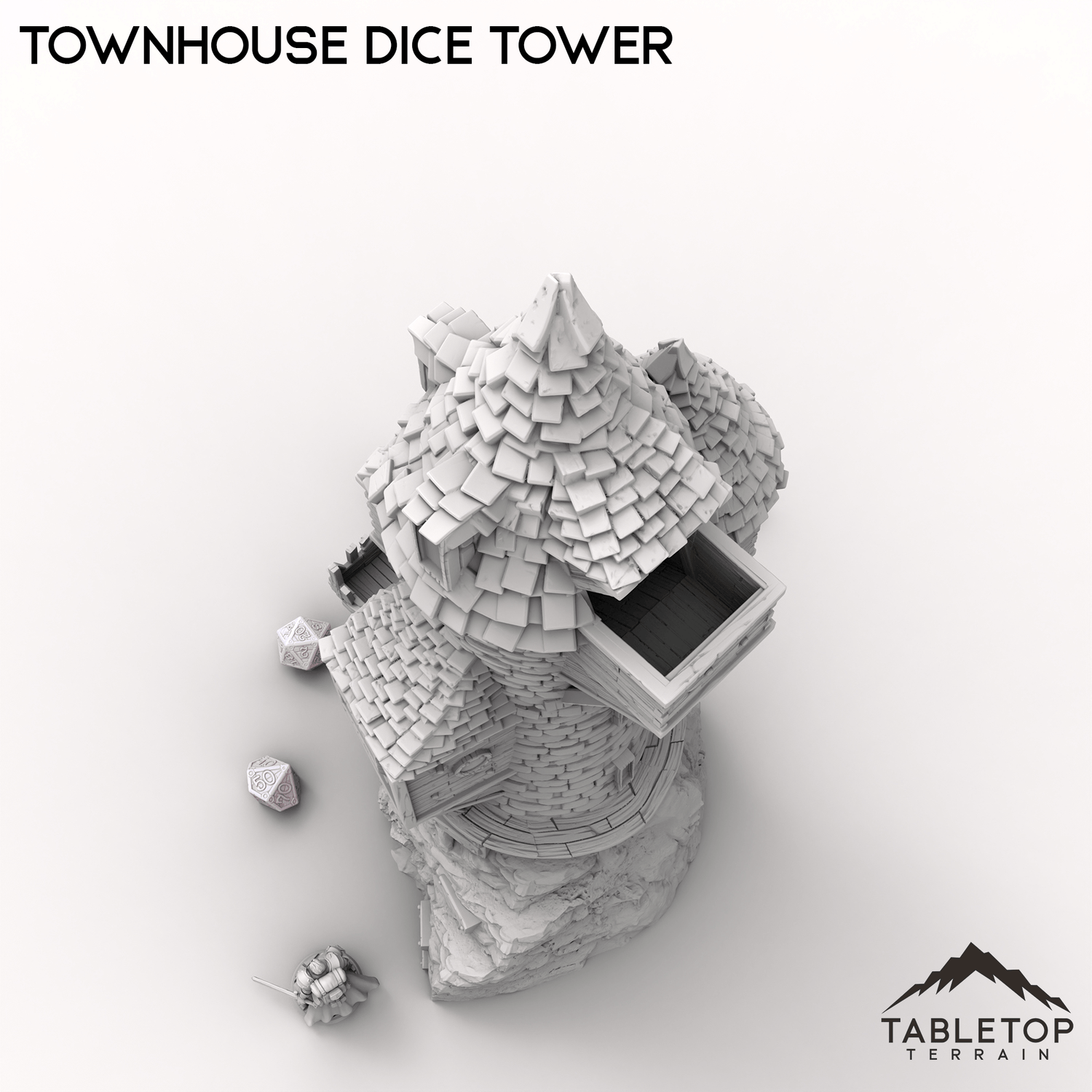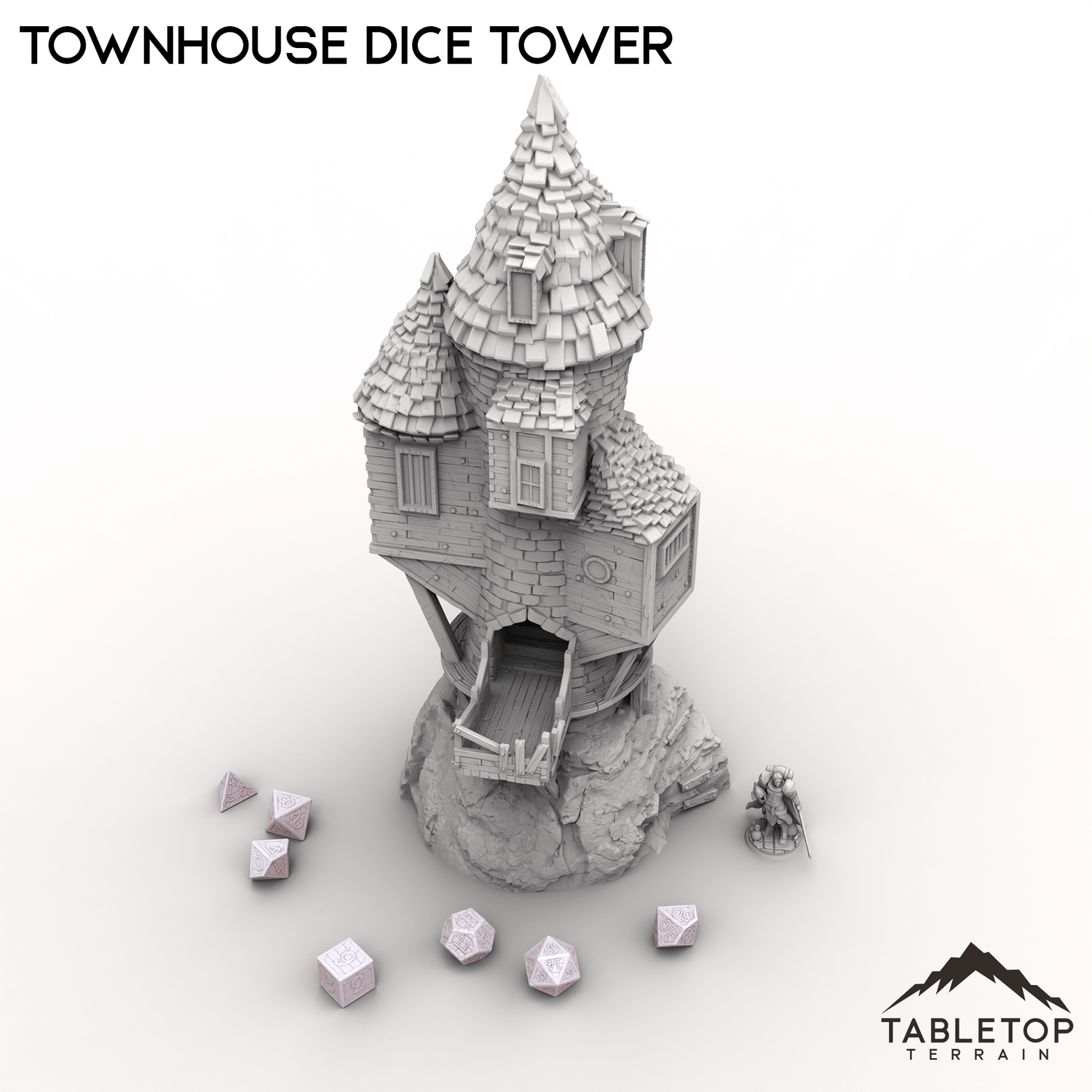 This Townhouse Dice Tower offers a whimsical, enchanted design. Dice are dropped into the rooftop, where they tumble through a series of magical windows and winding staircases, before rolling out through to a balcony.
