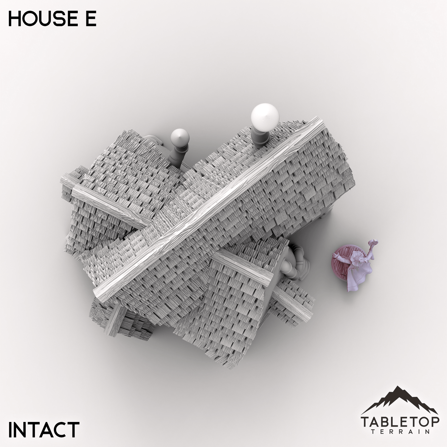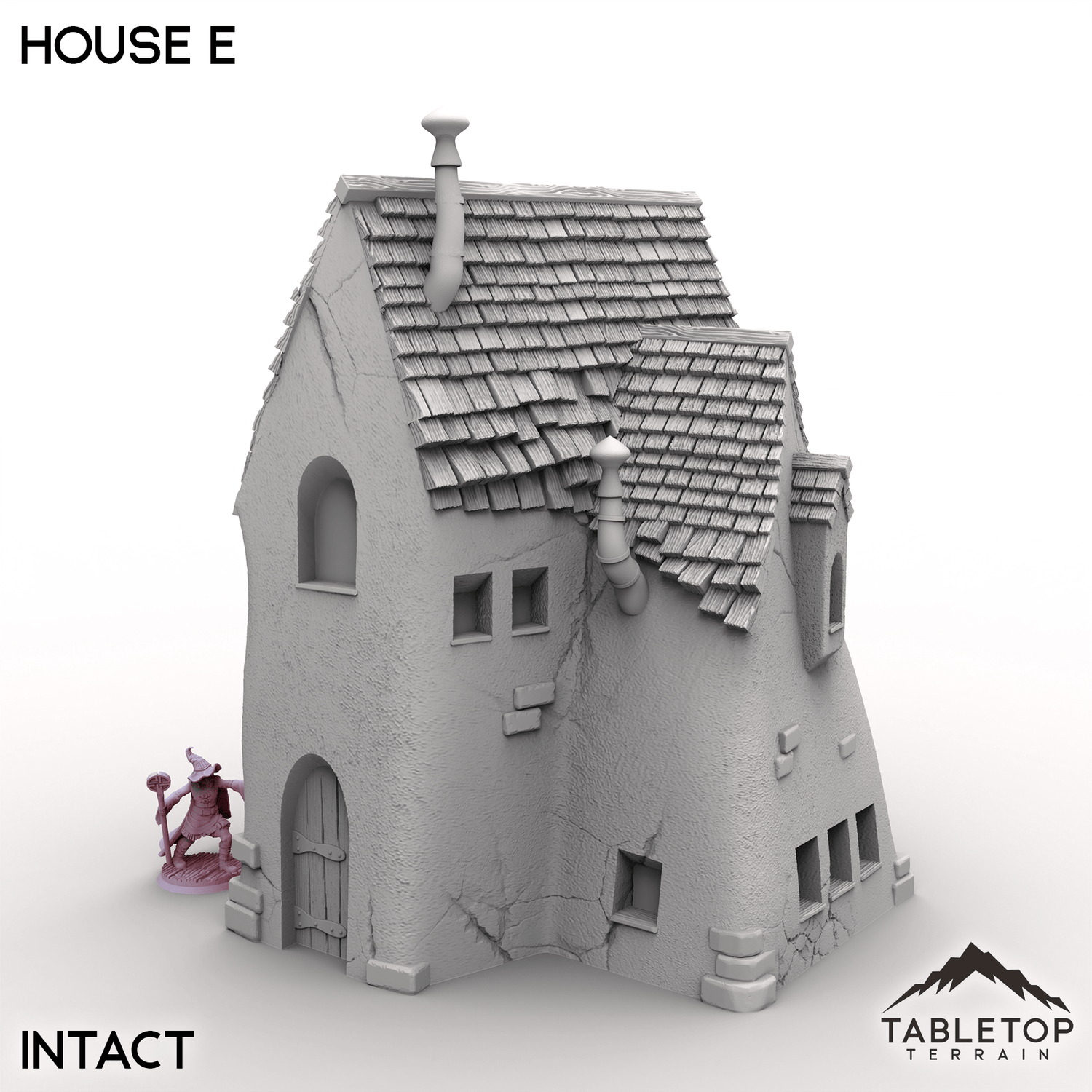 This squarish house, part of the Vexed Village set, has multiple crooked roof lines and walls that lean and twist as if bent by strange magic. It has small uneven windows and multiple twisted chimneys on its roof. This house is available in either intact or ruined variant. Perfect as either part of the Vexed Village or standing alone as some bizarre witch’s house.