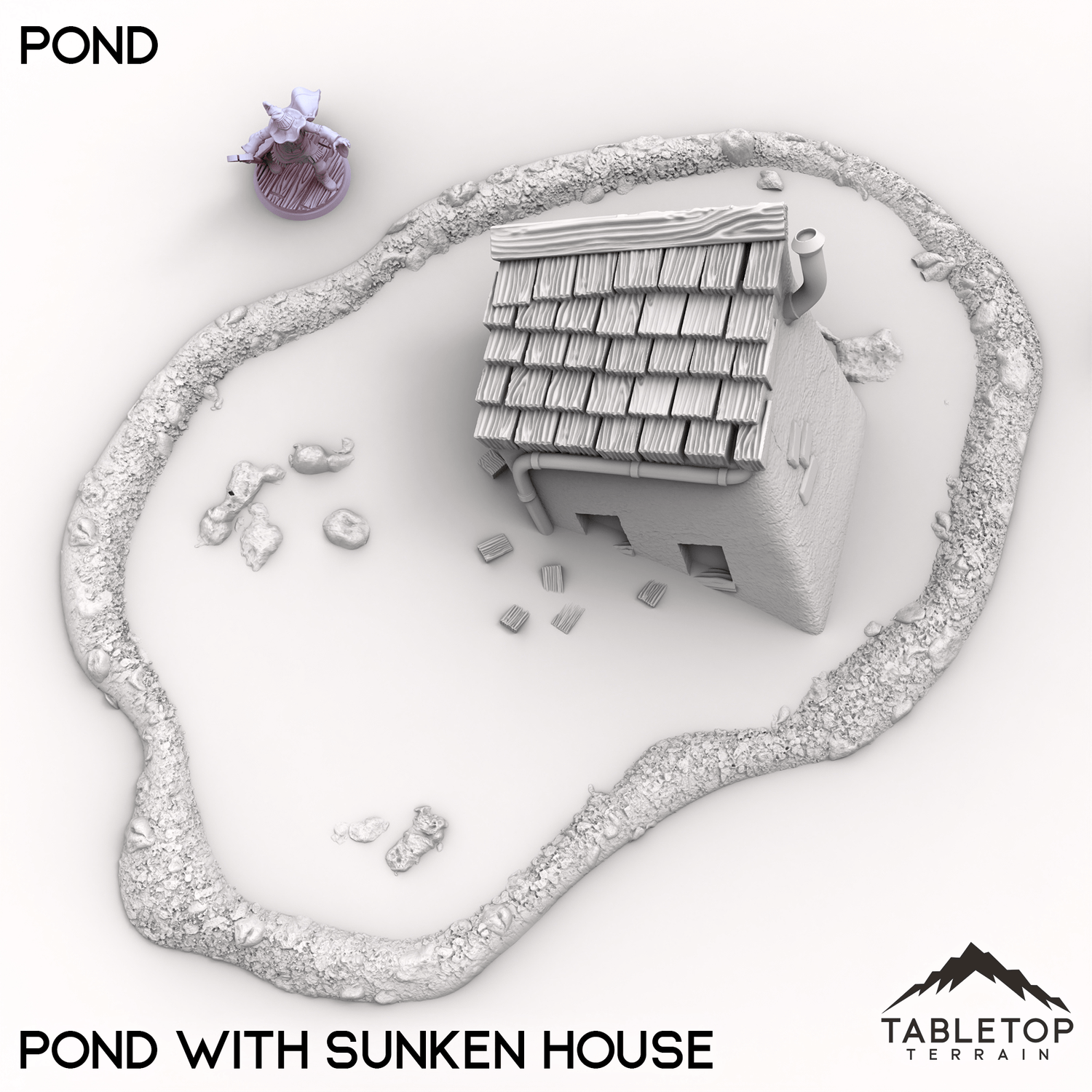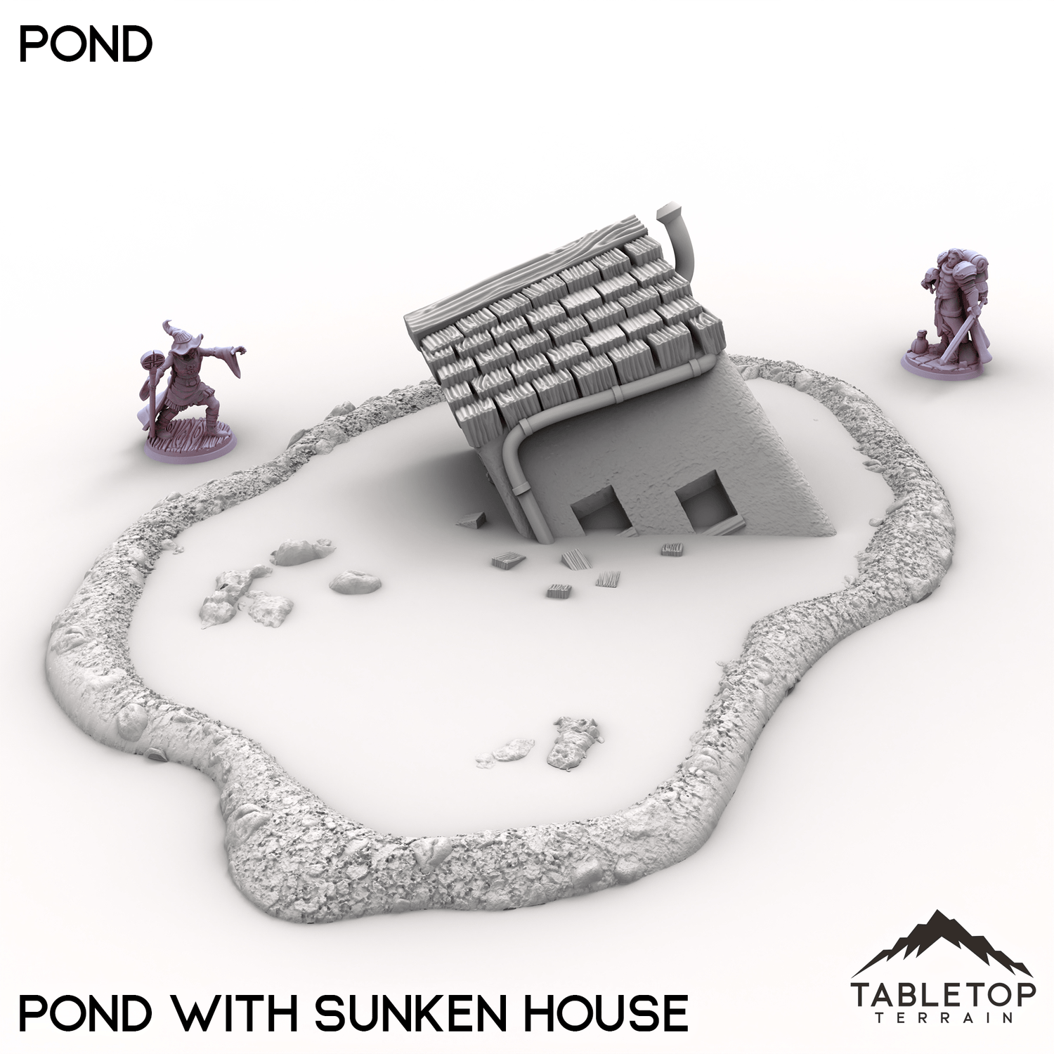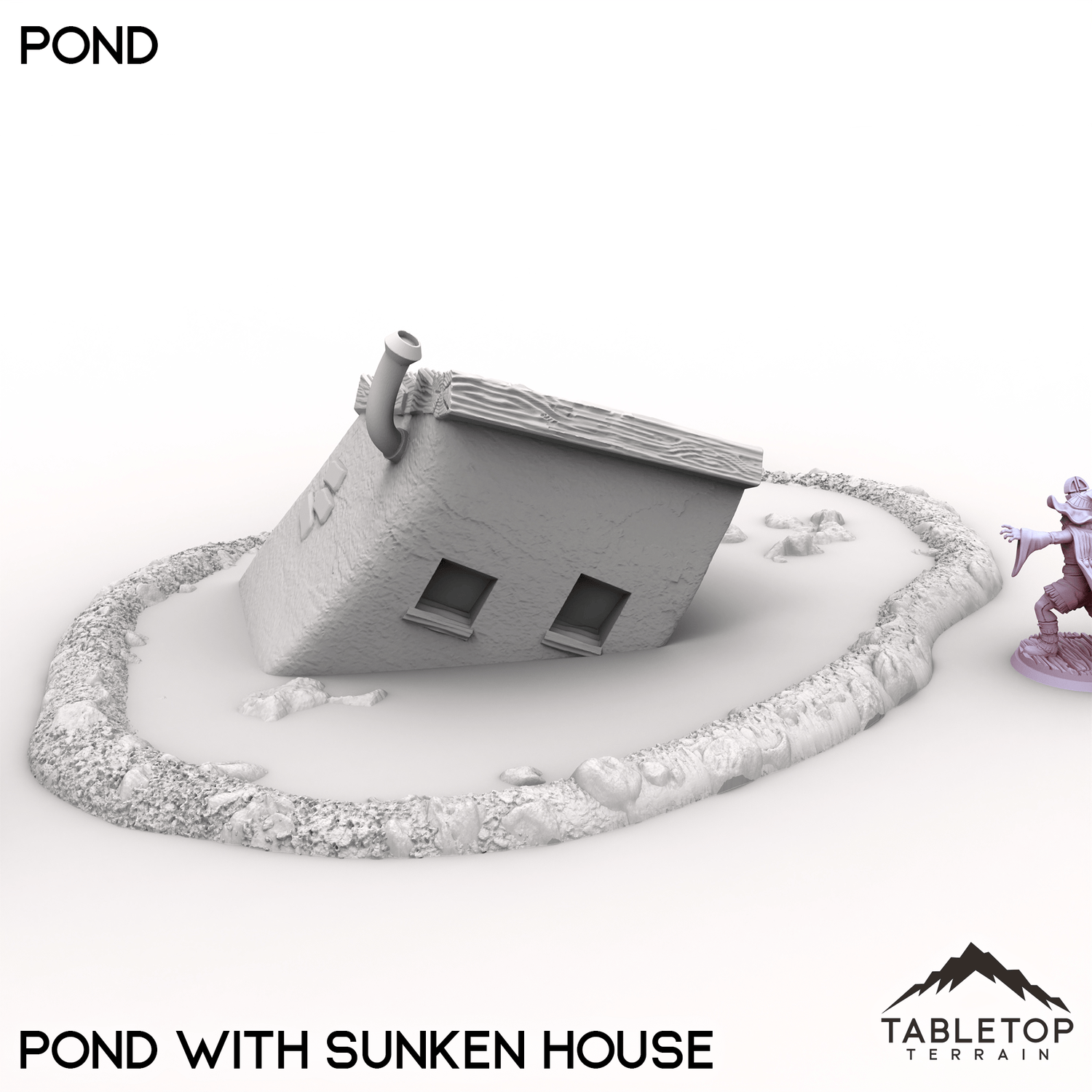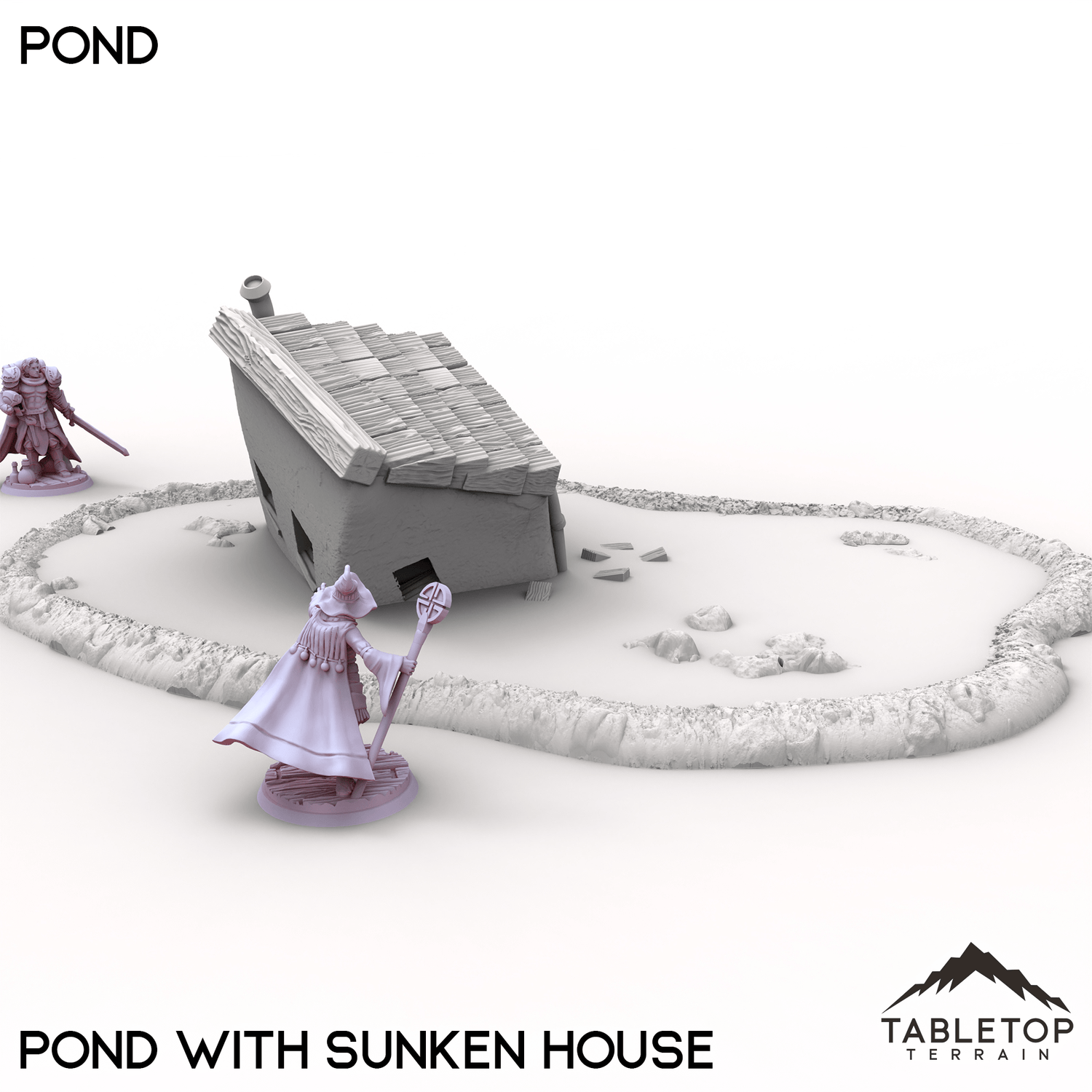 This murky Pond, part of the Vexed Village set, is littered with bricks, fallen chimneys and other debris. The crumbling ruins of a fallen house round out the scene. A great centerpiece for the Vexed Village set, perfect for hinting at waterlogged witchcraft.